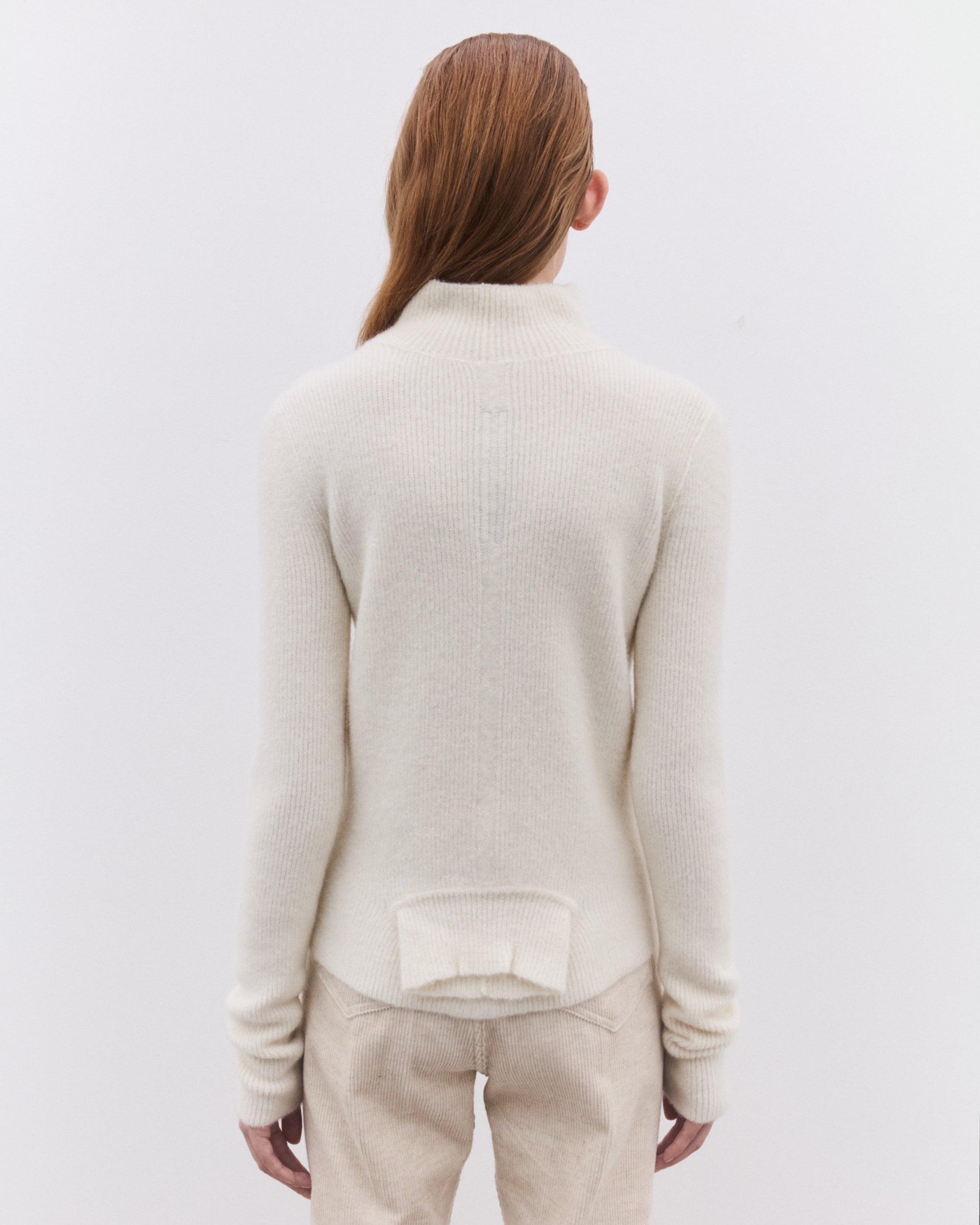 Long sleevesLupetto round neckKnit level shoulder seamsExposed seam at front and backFluffy, soft fabric