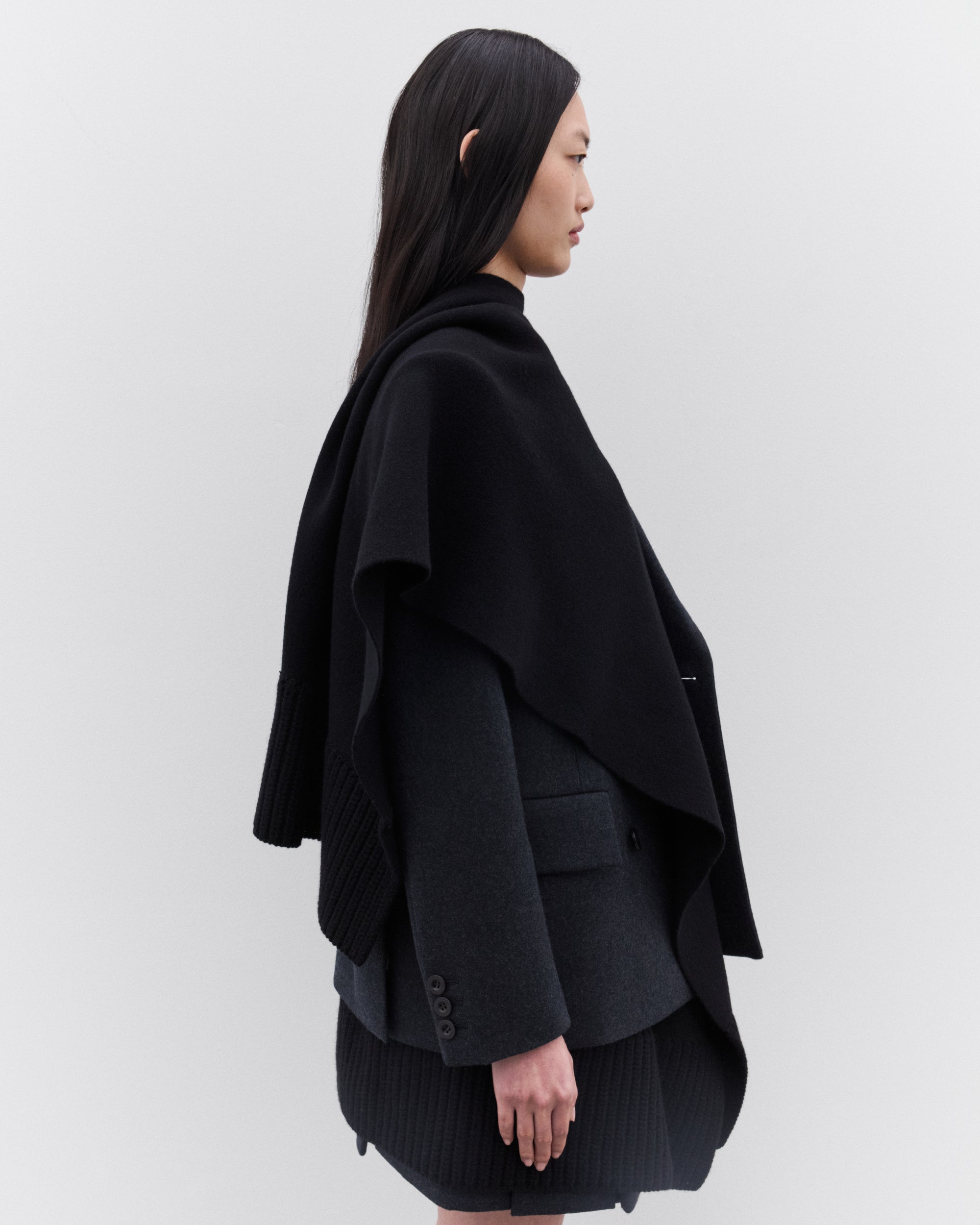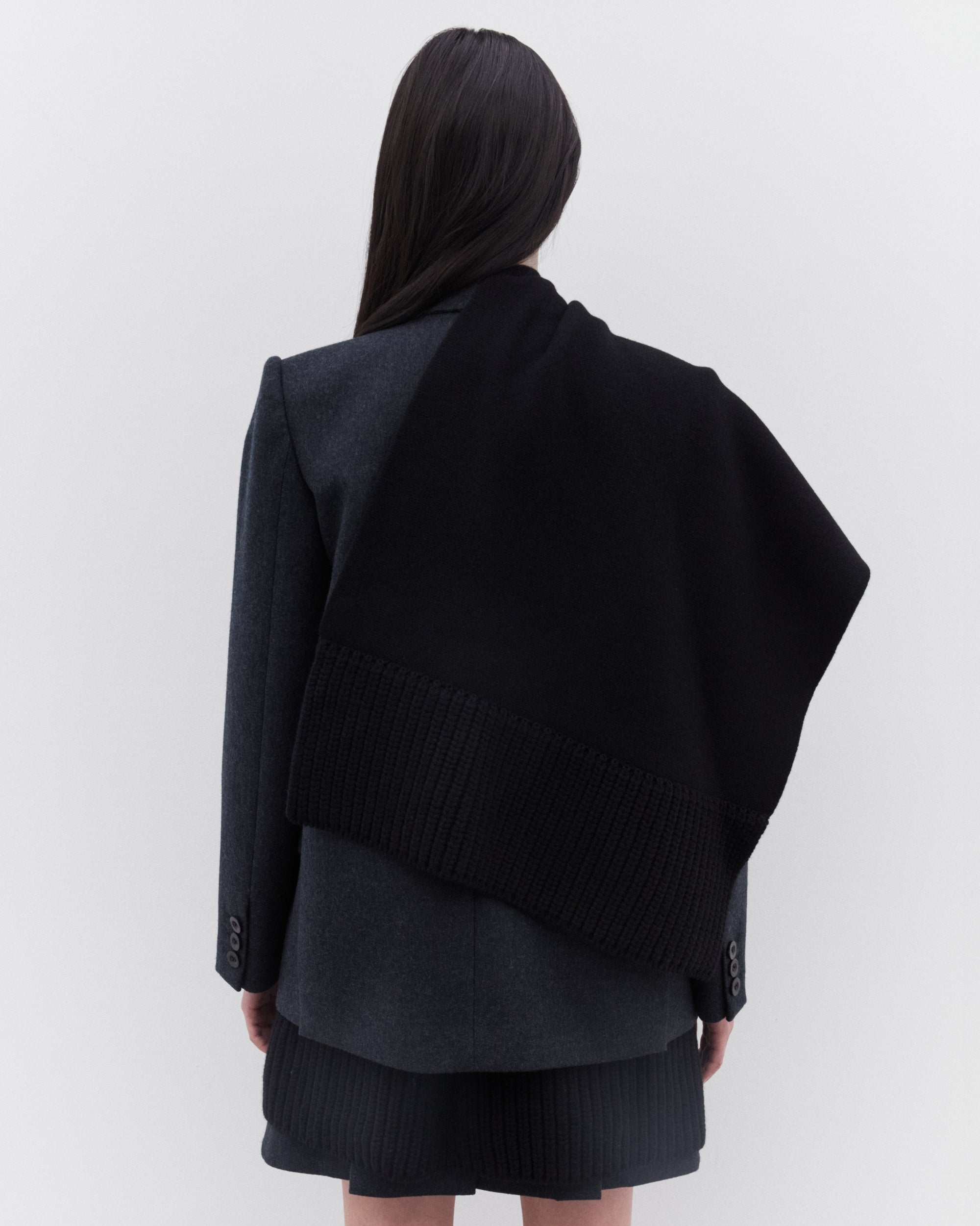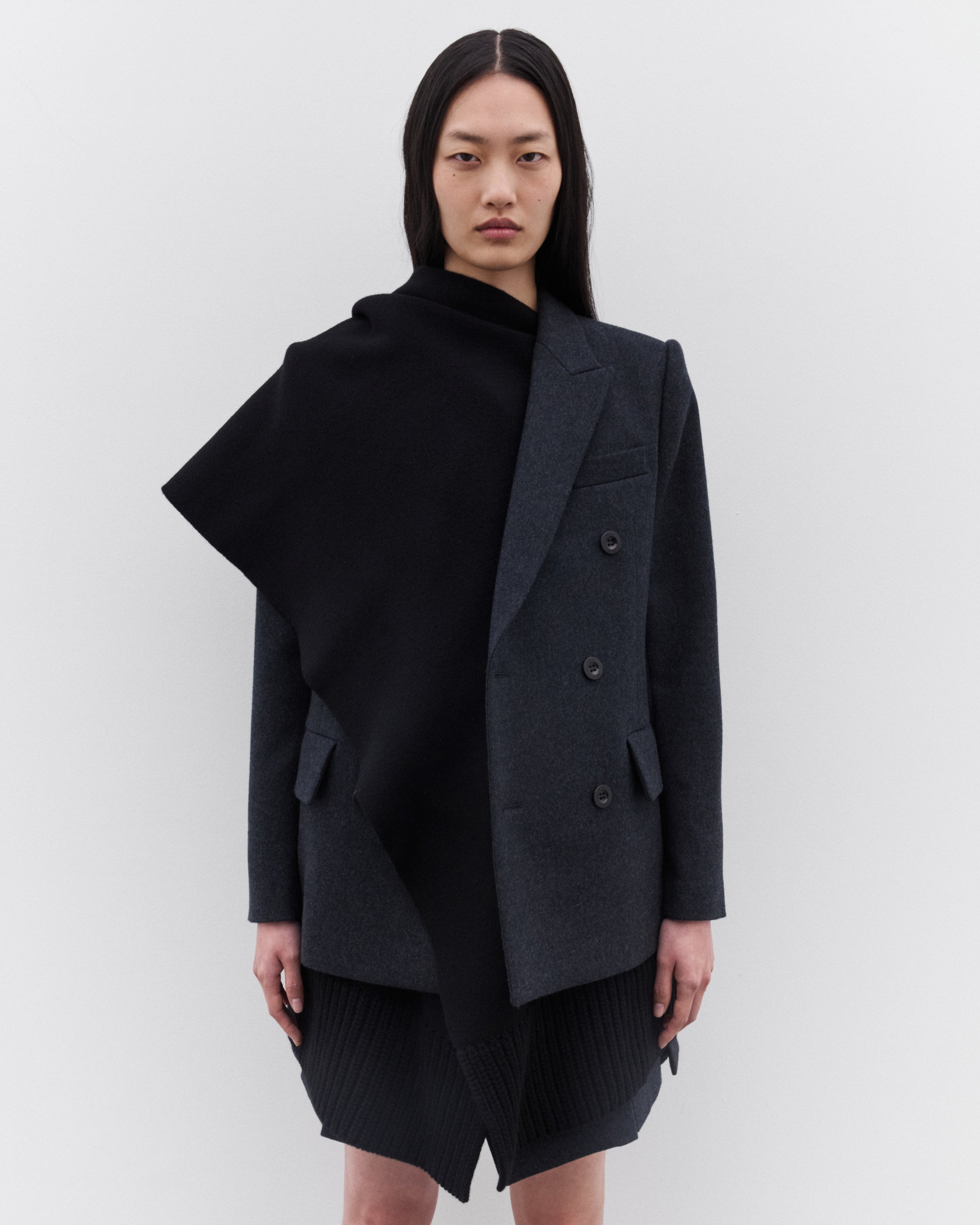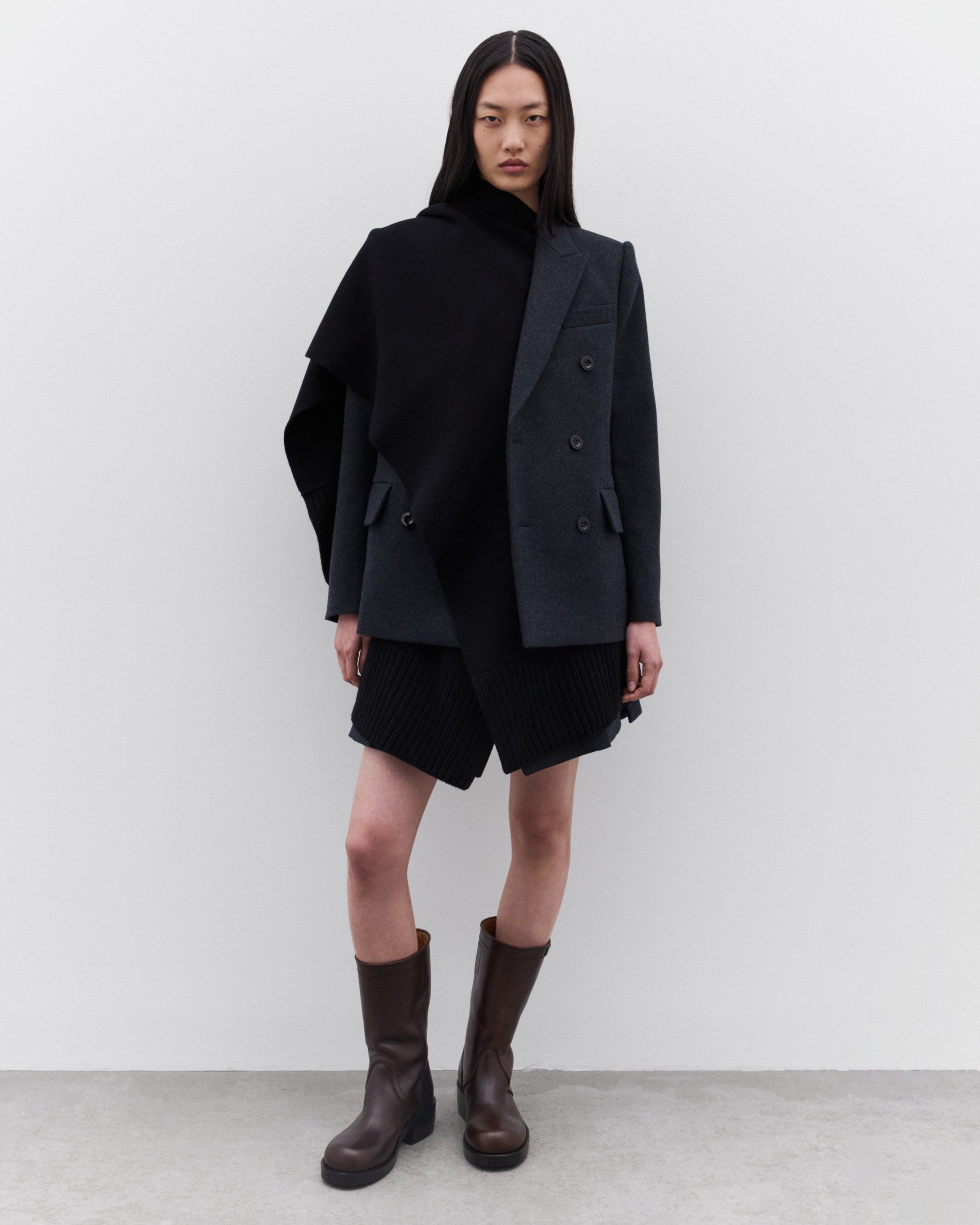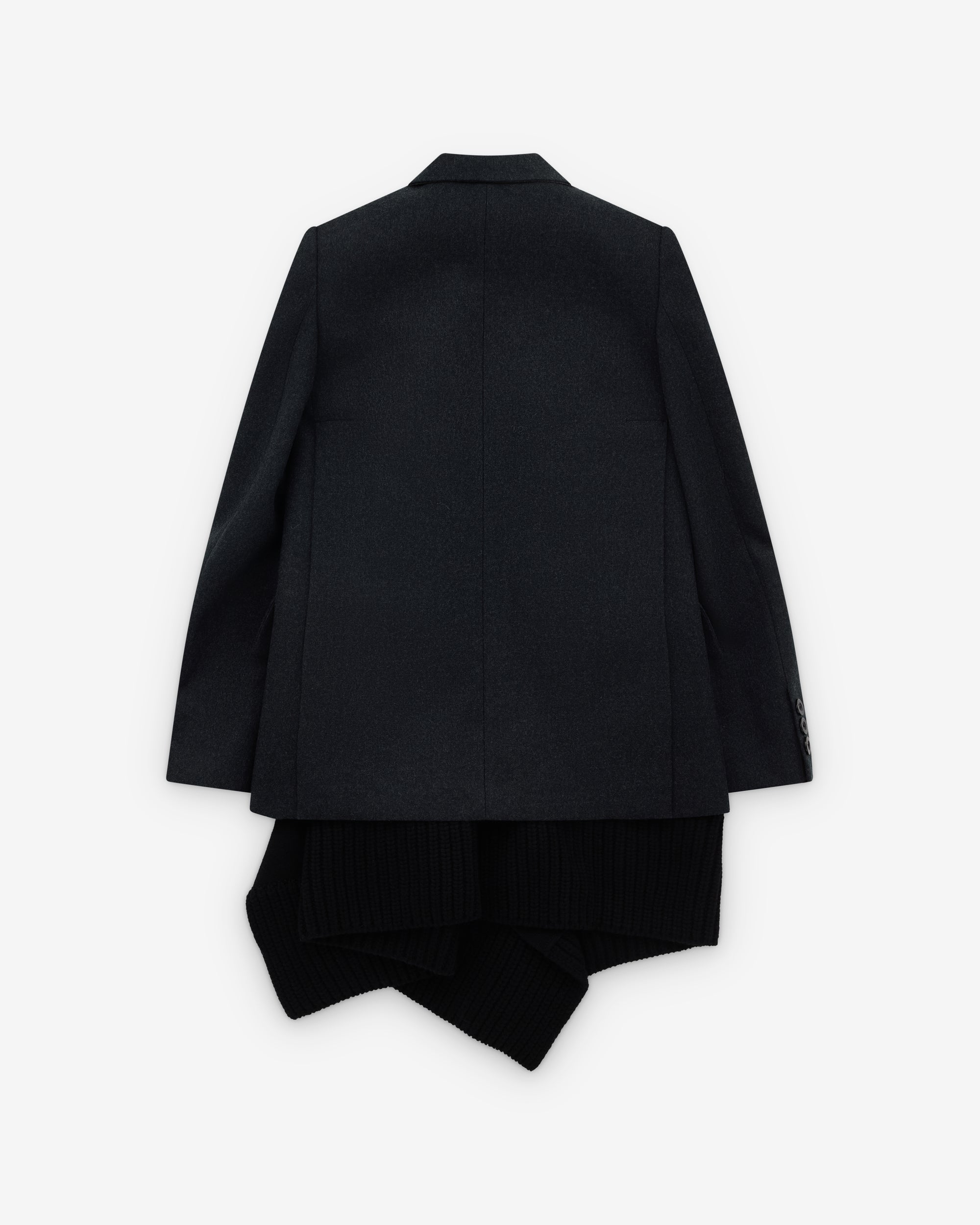 Double breastedQuilted liningFlap pockets and welt chest pocketExposed knitted panel at hemClassic collar with notch lapels