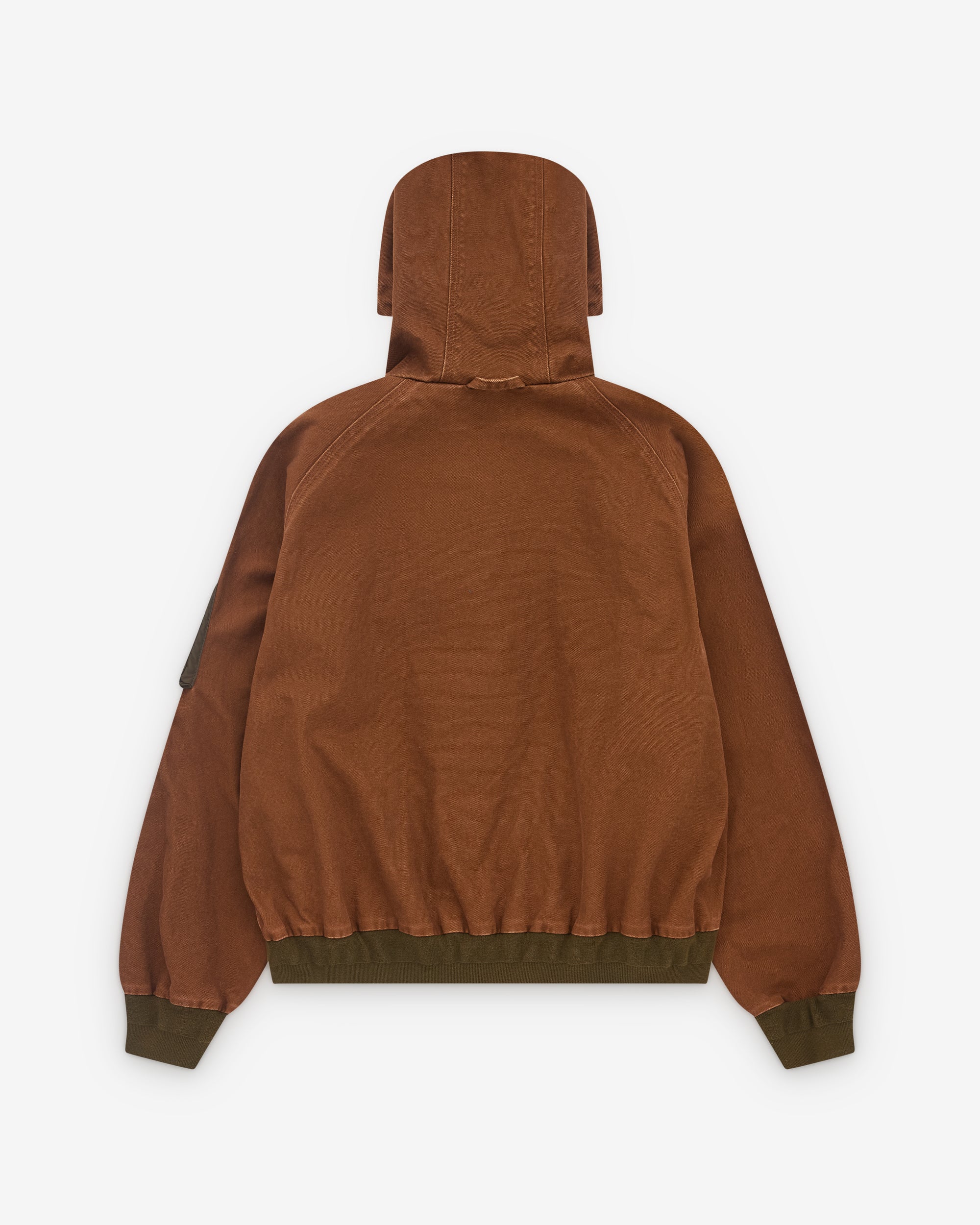 Drawstring hoodTwo way zip closureFront pouch pocketDual branded patchRibbed cuffs and hemArm zip pocket