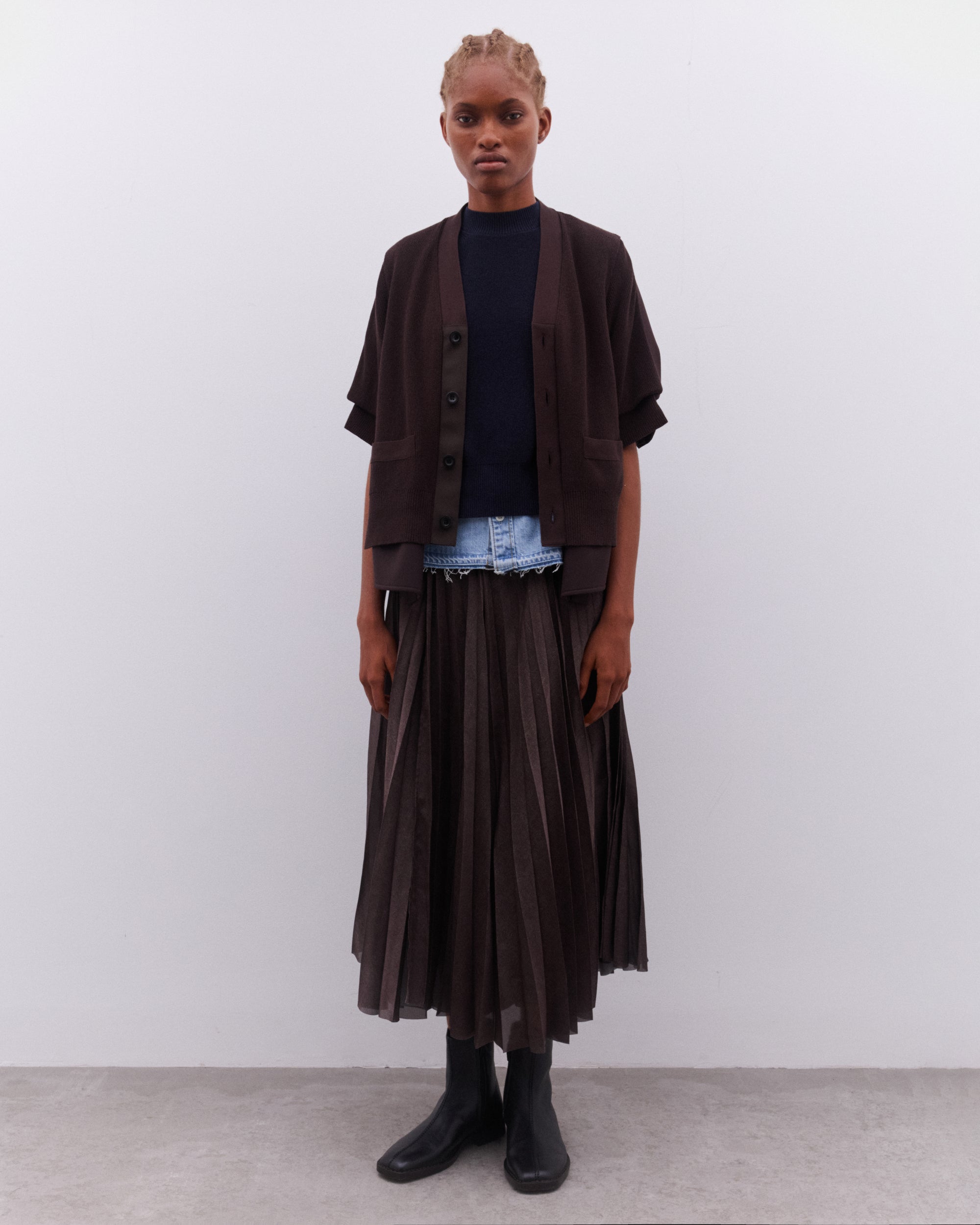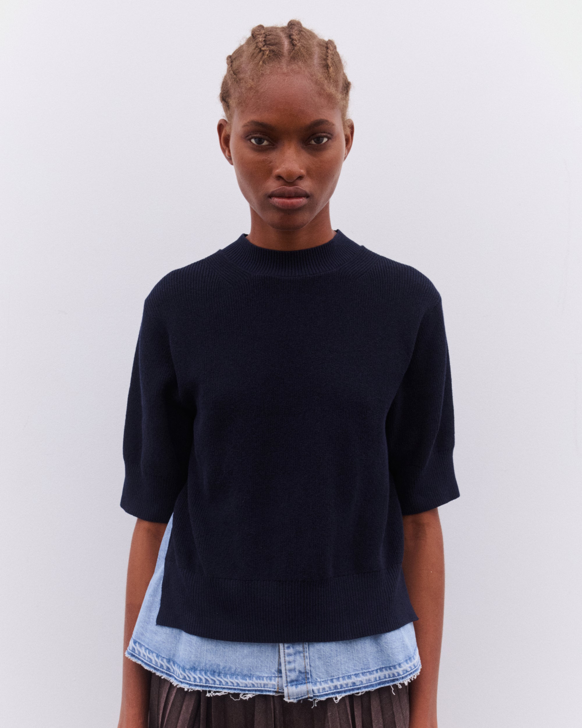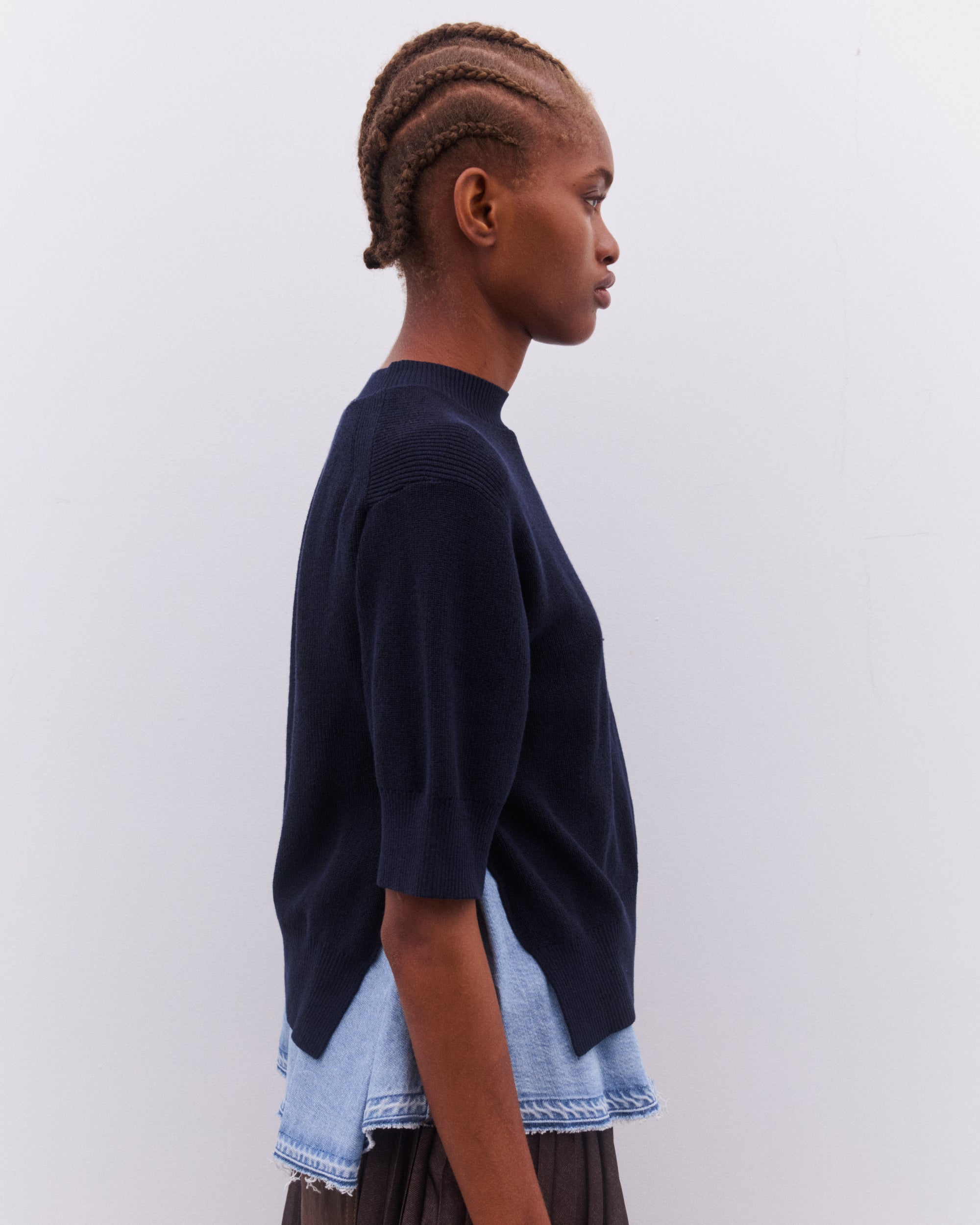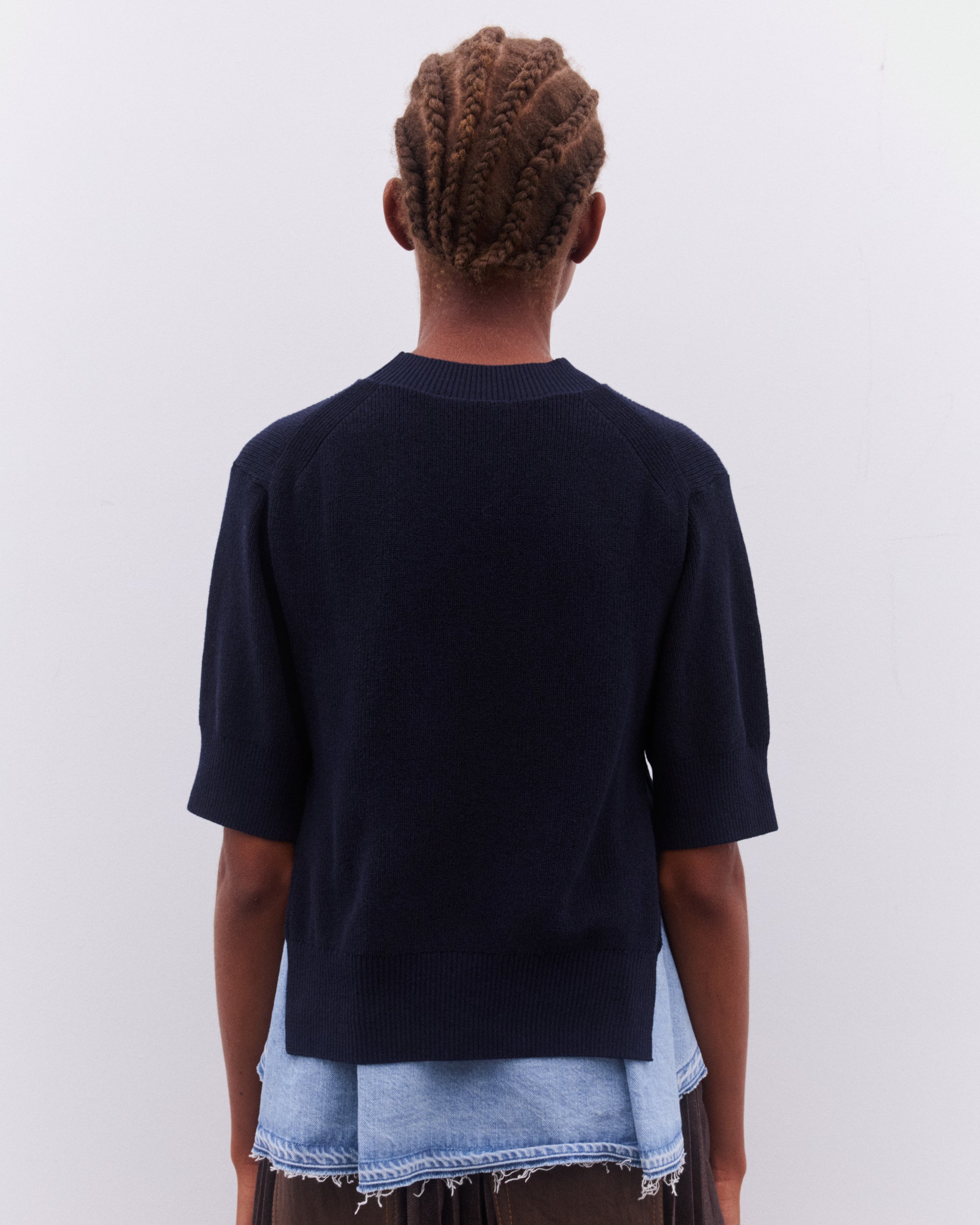 Crew necklineShort sleeves with ribbed trimsDenim under panellingKnit outer fabric