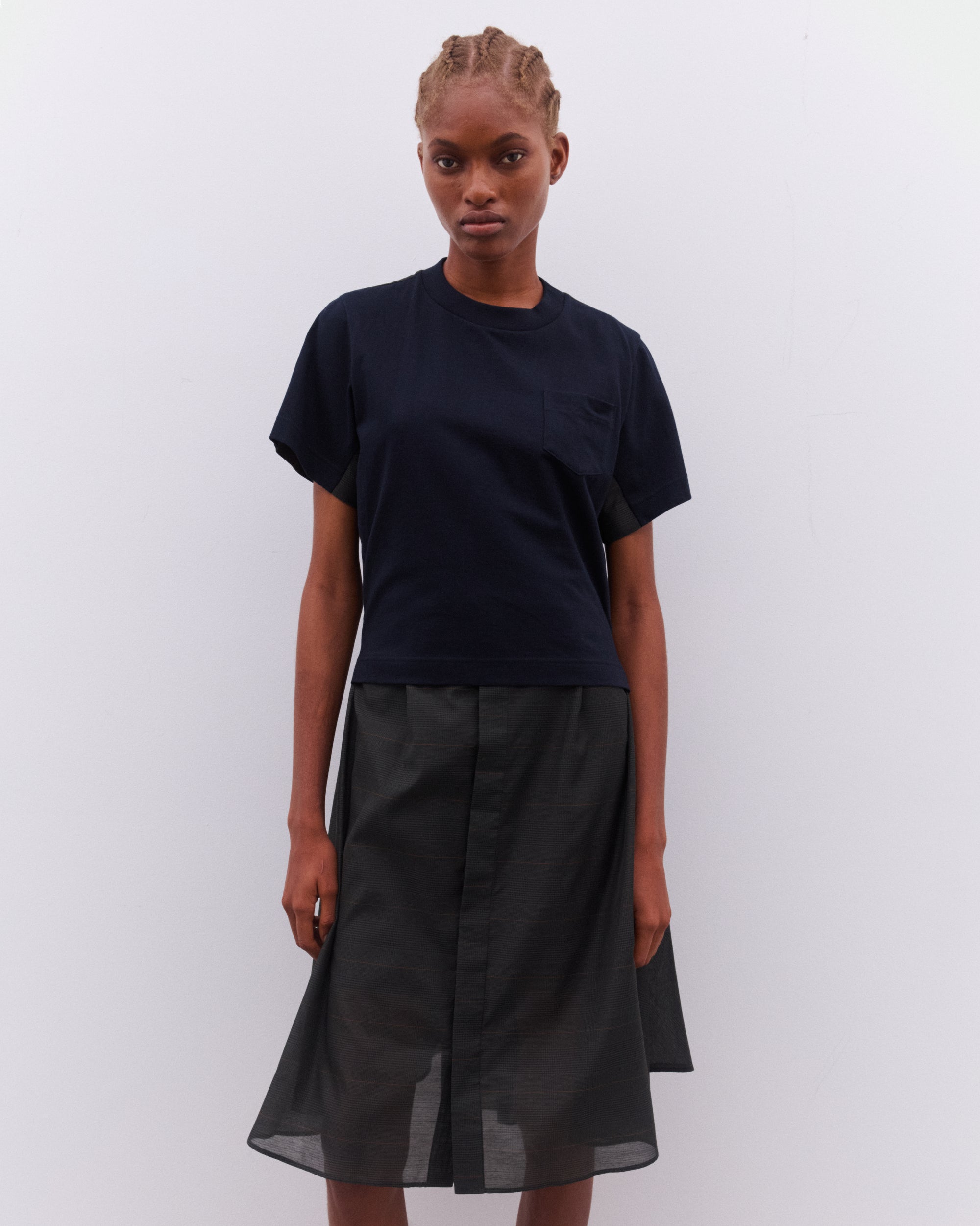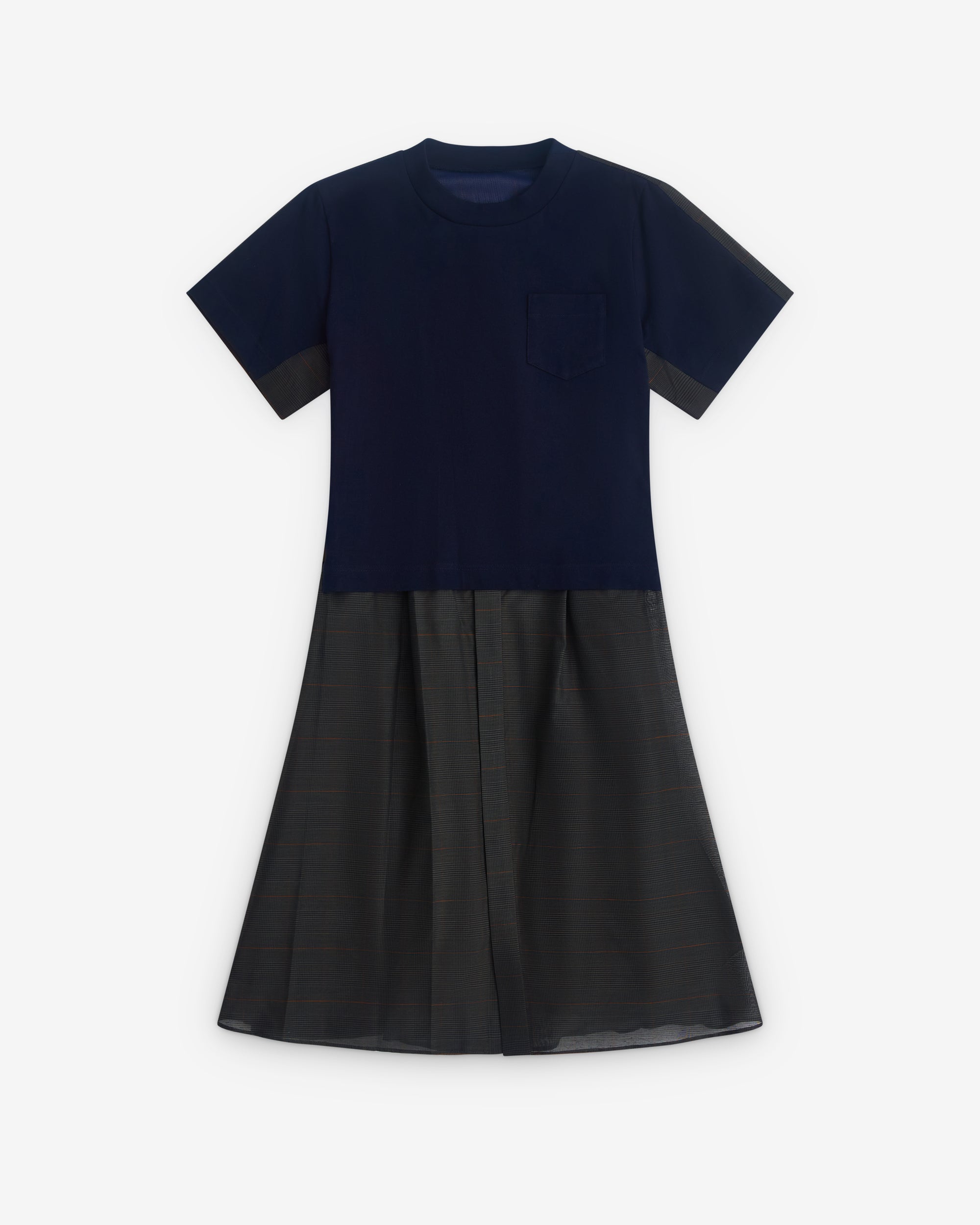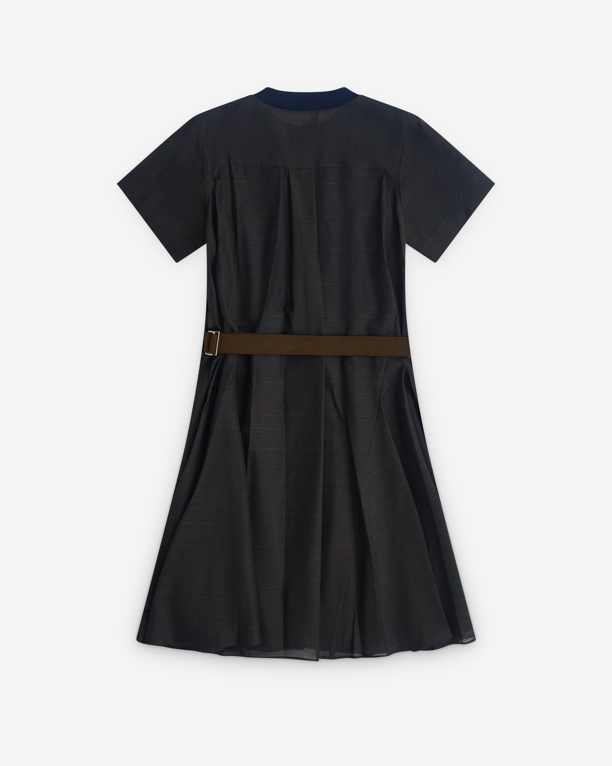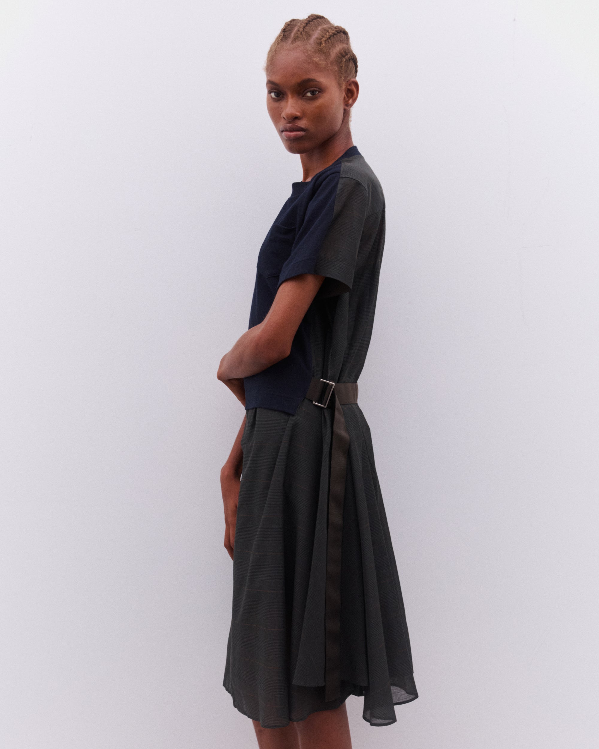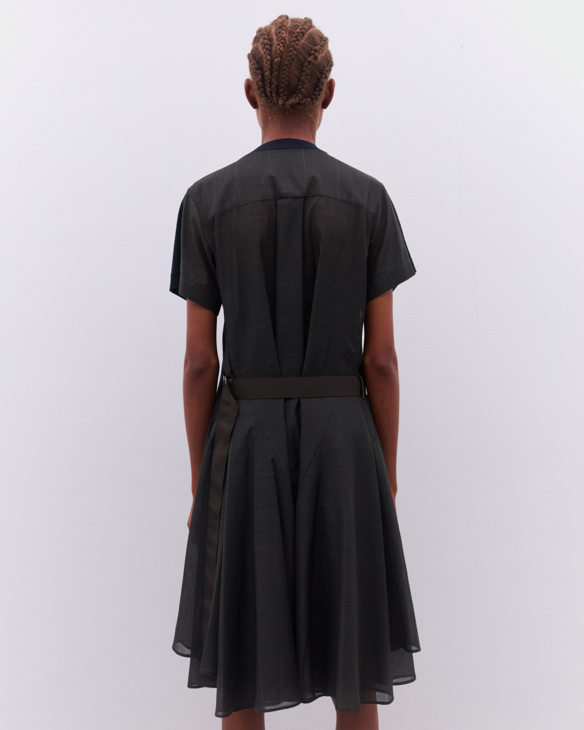 Round neckShort sleeveCotton jersey panelGlen check skirt and pleated rearRear waist beltA-line silhouette