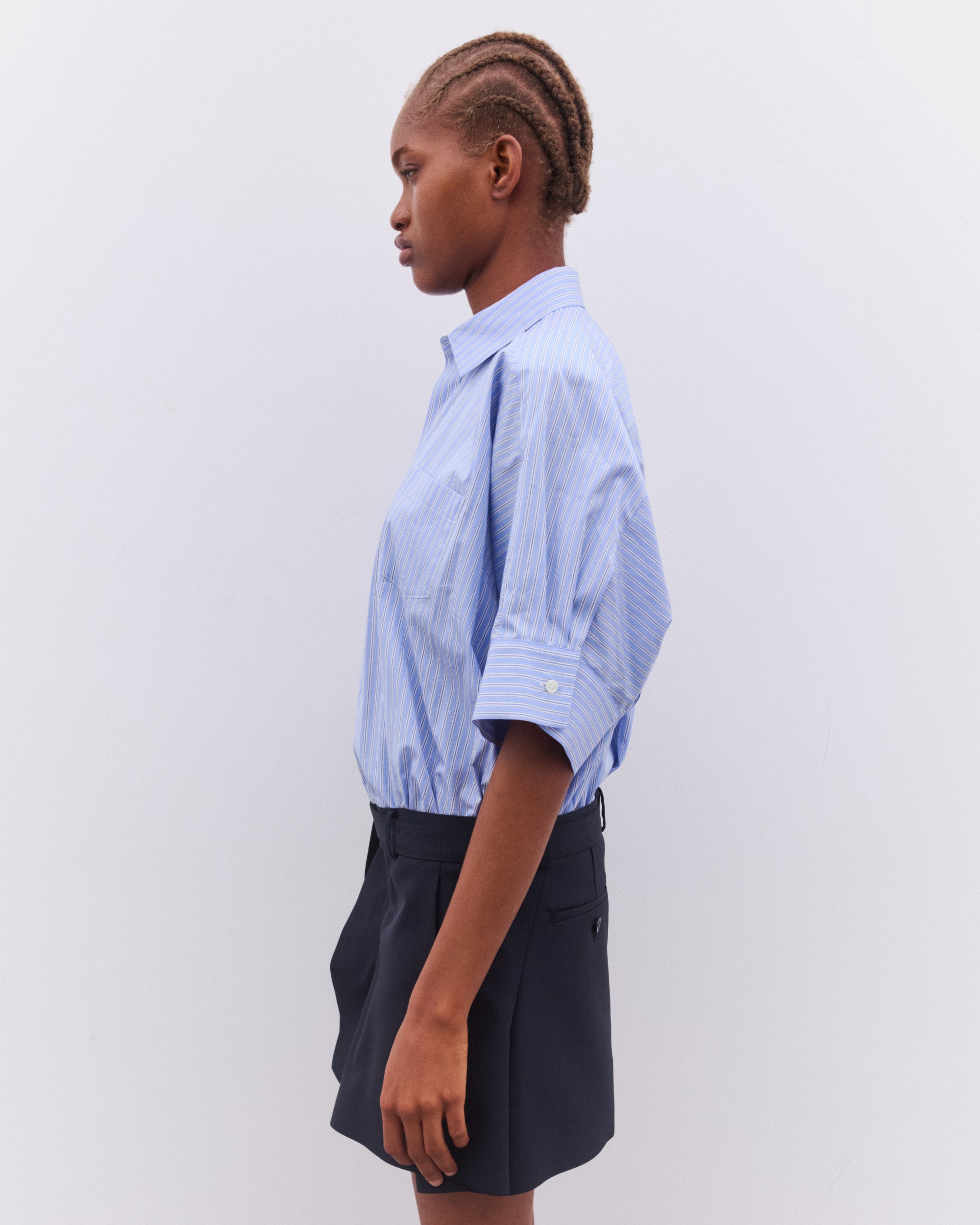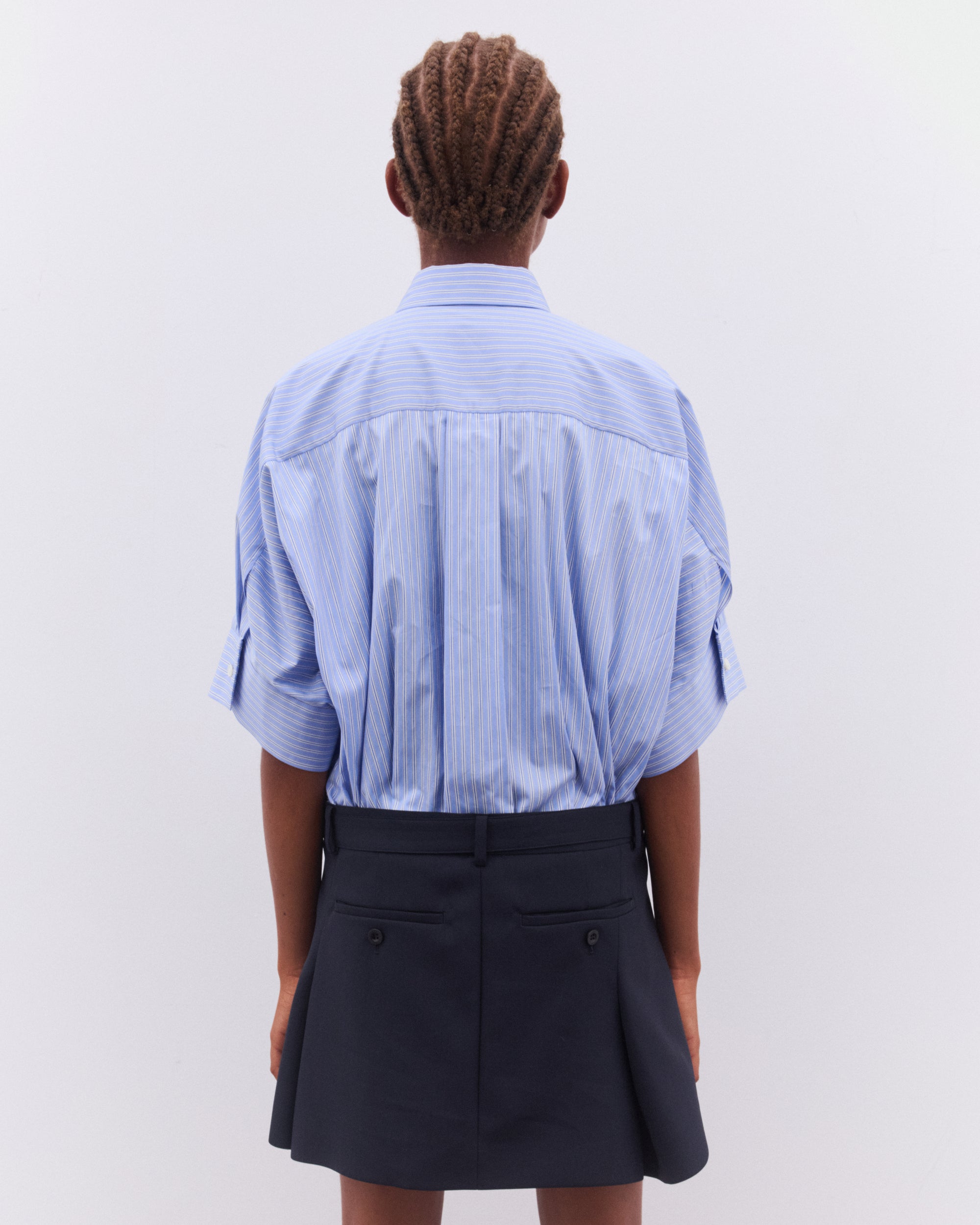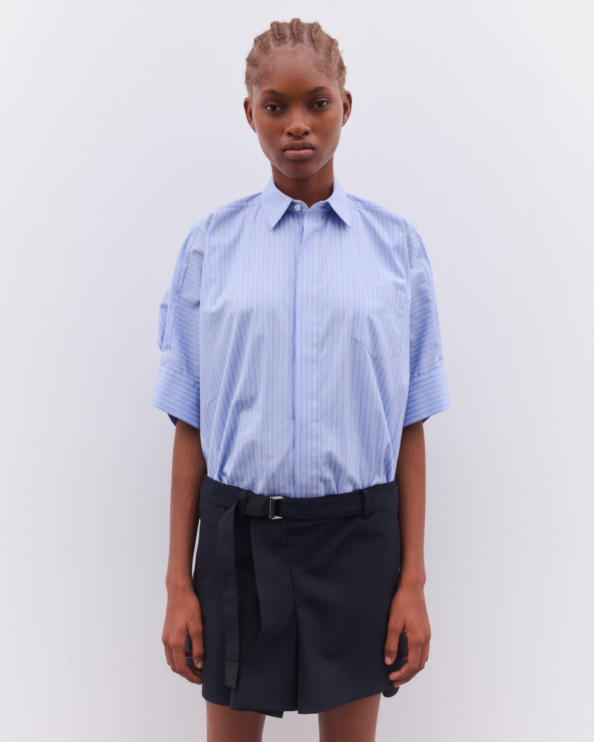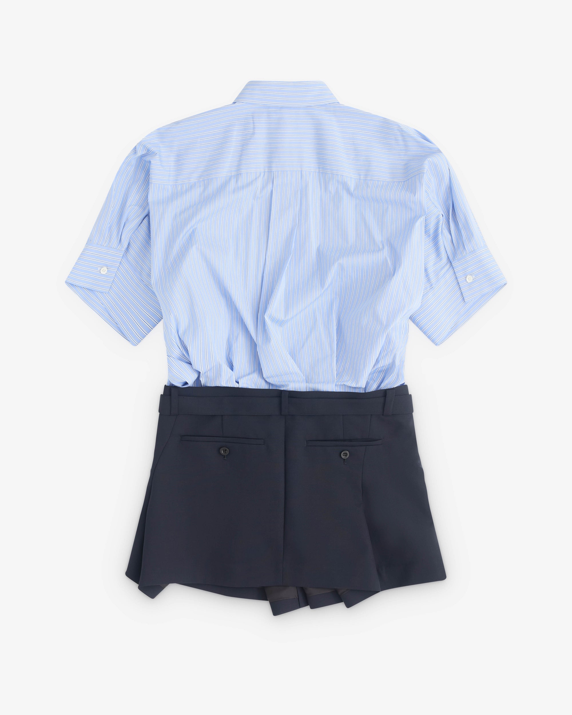 Striped poplin fabricSingle chest pocketShirting collarBelted waistPleating and rear pockets at skirt Thigh length