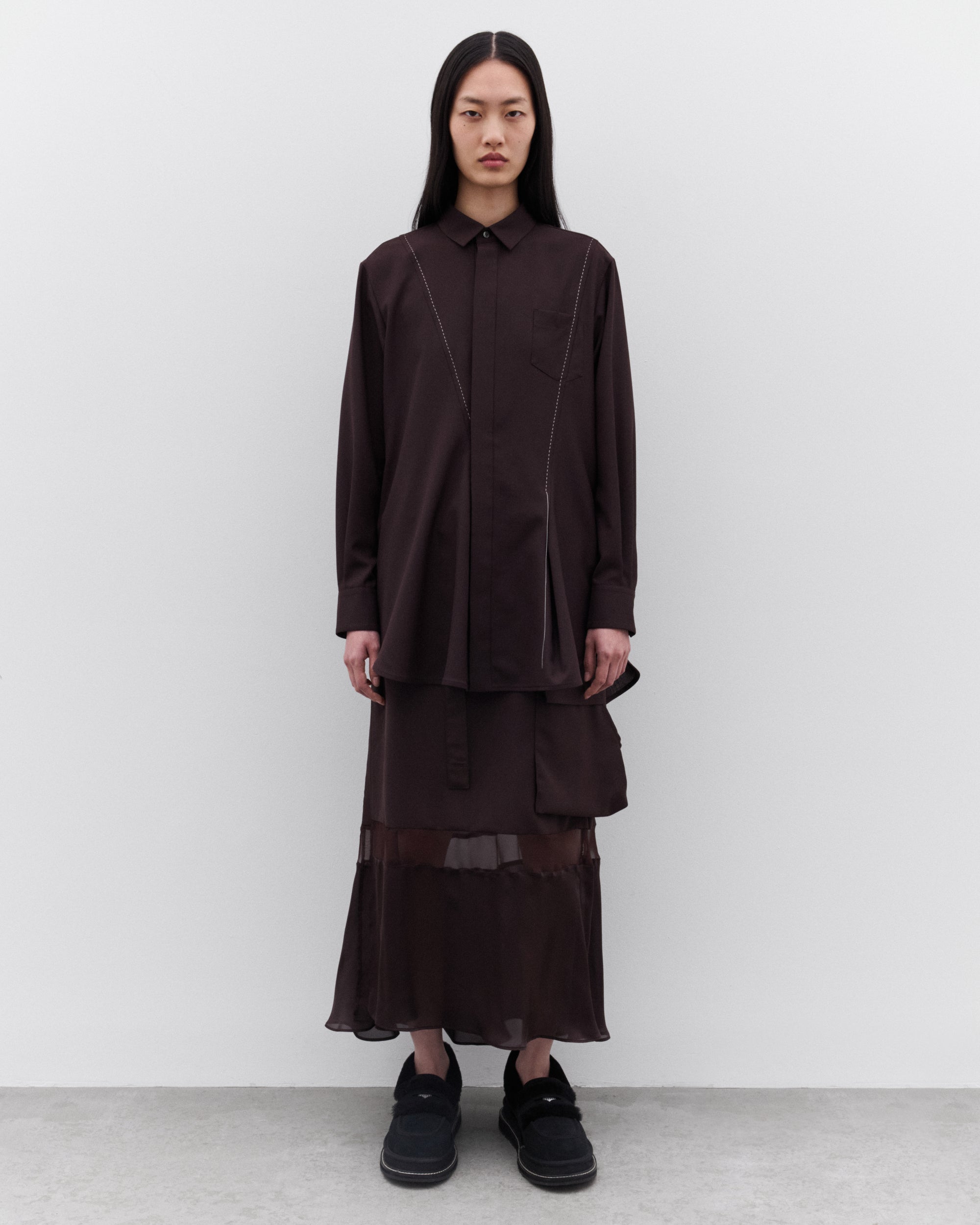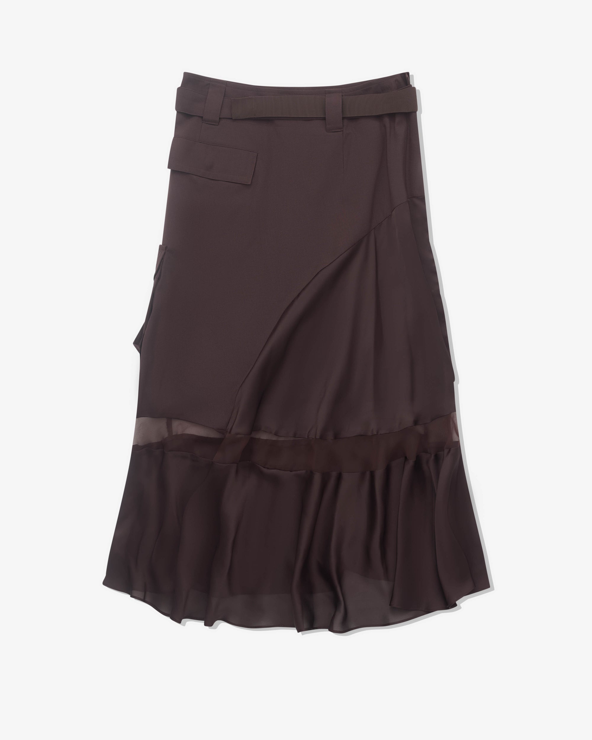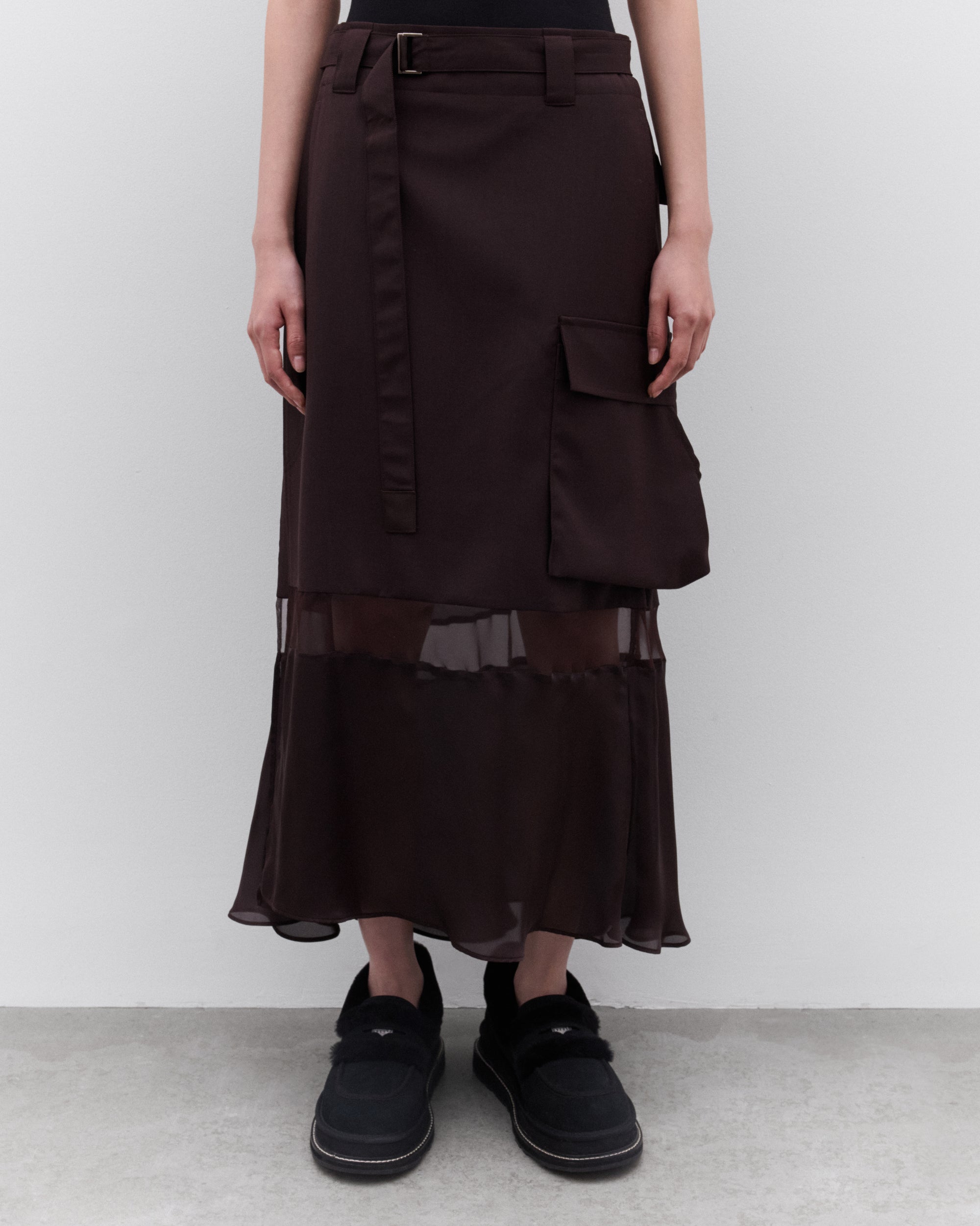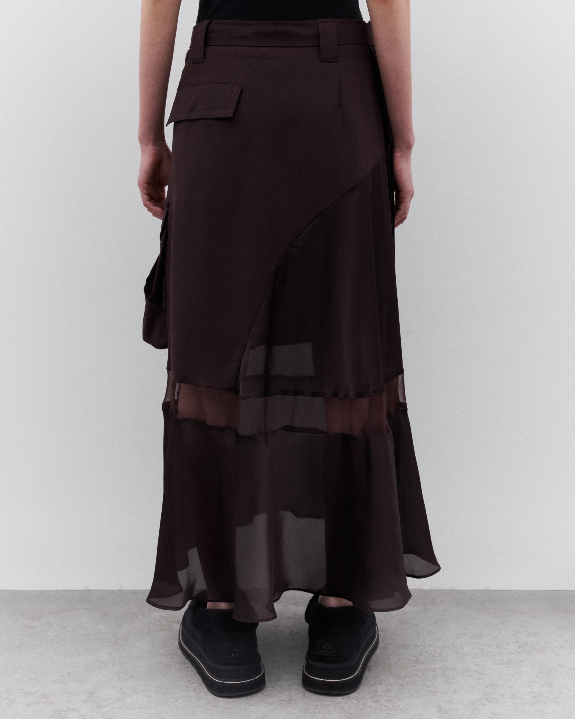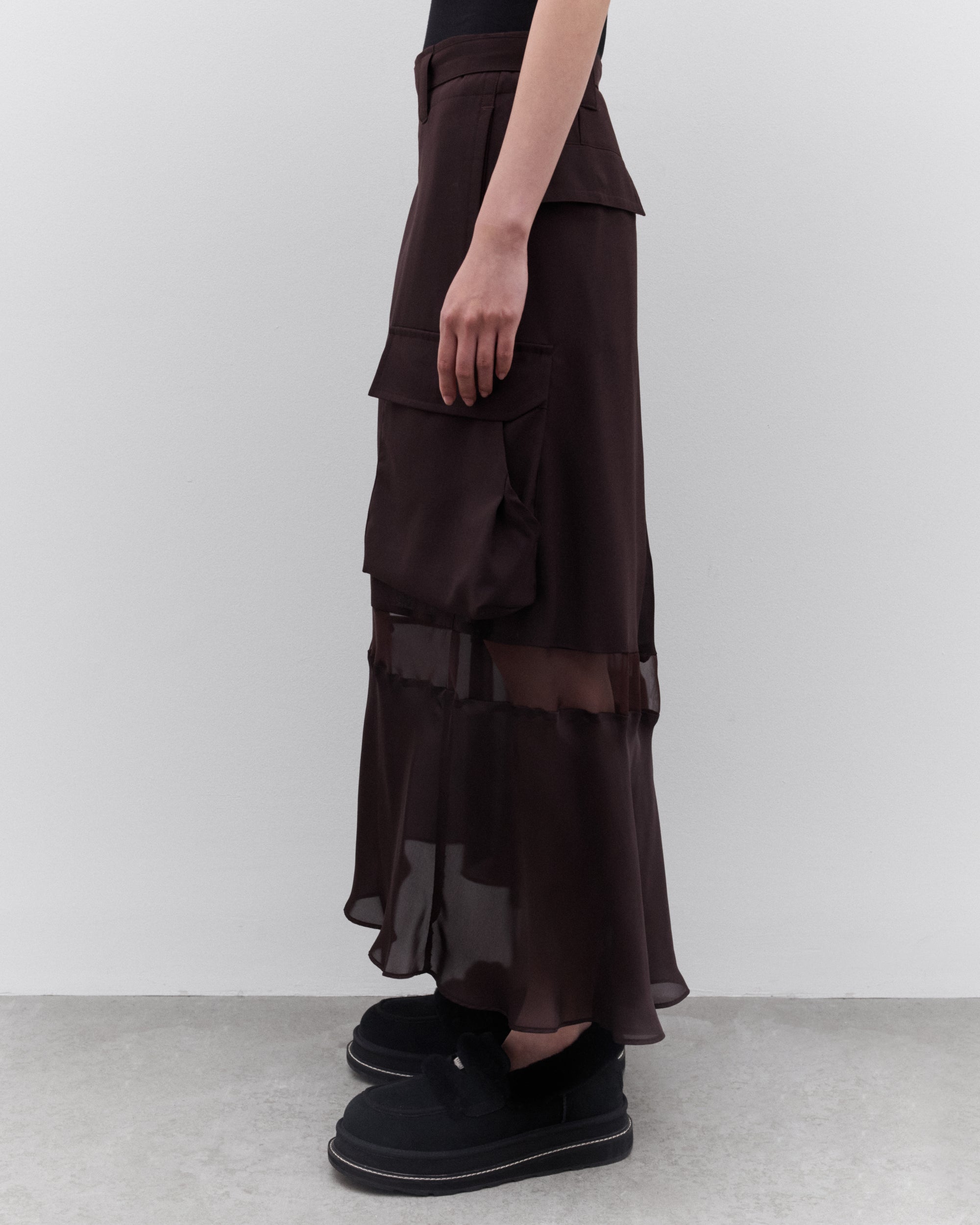 Below knee lengthAsymmetric cut hemSheer fabric panelling Pleated fabricCargo pocketsRemovable, adjustable belt at waistFront slit