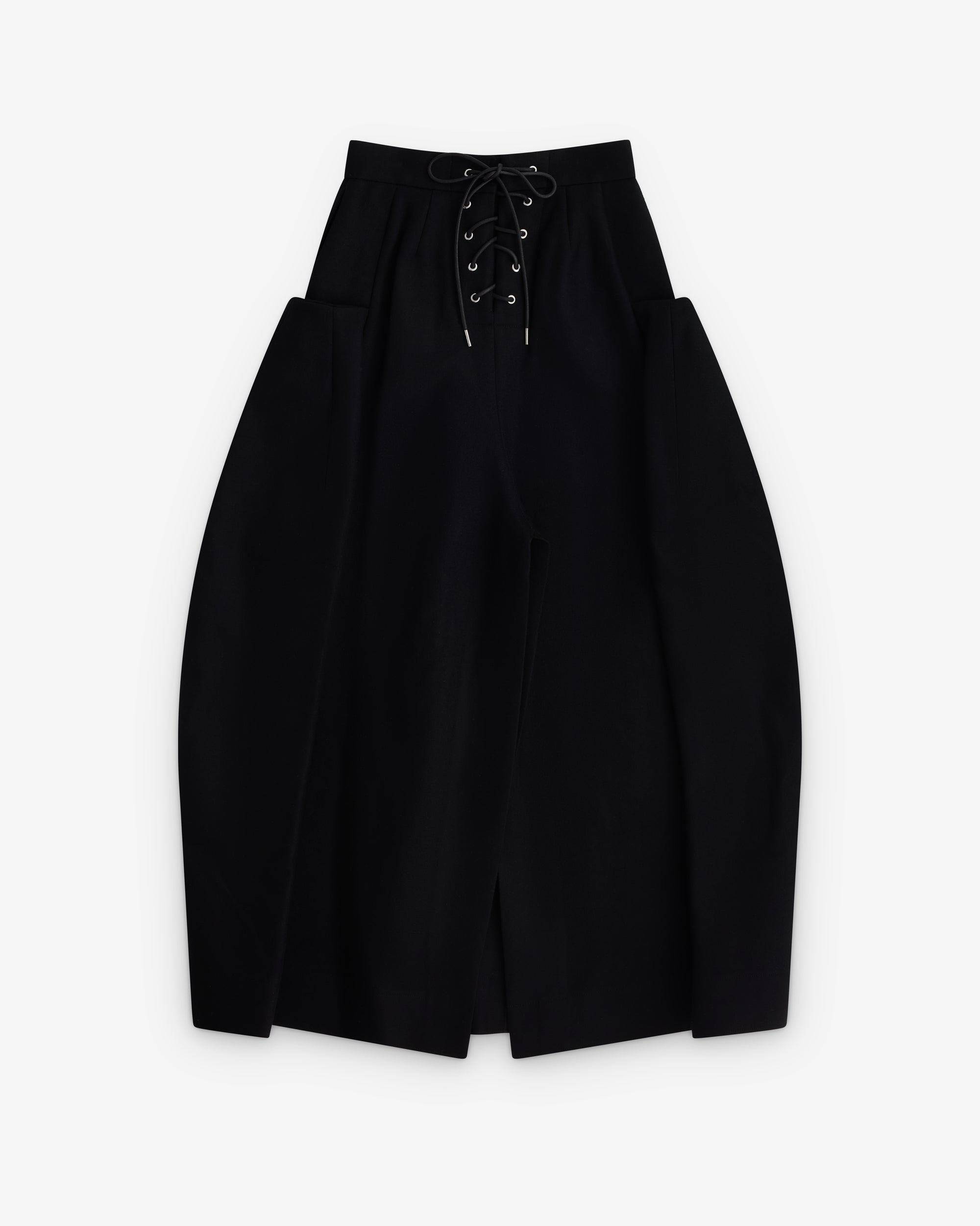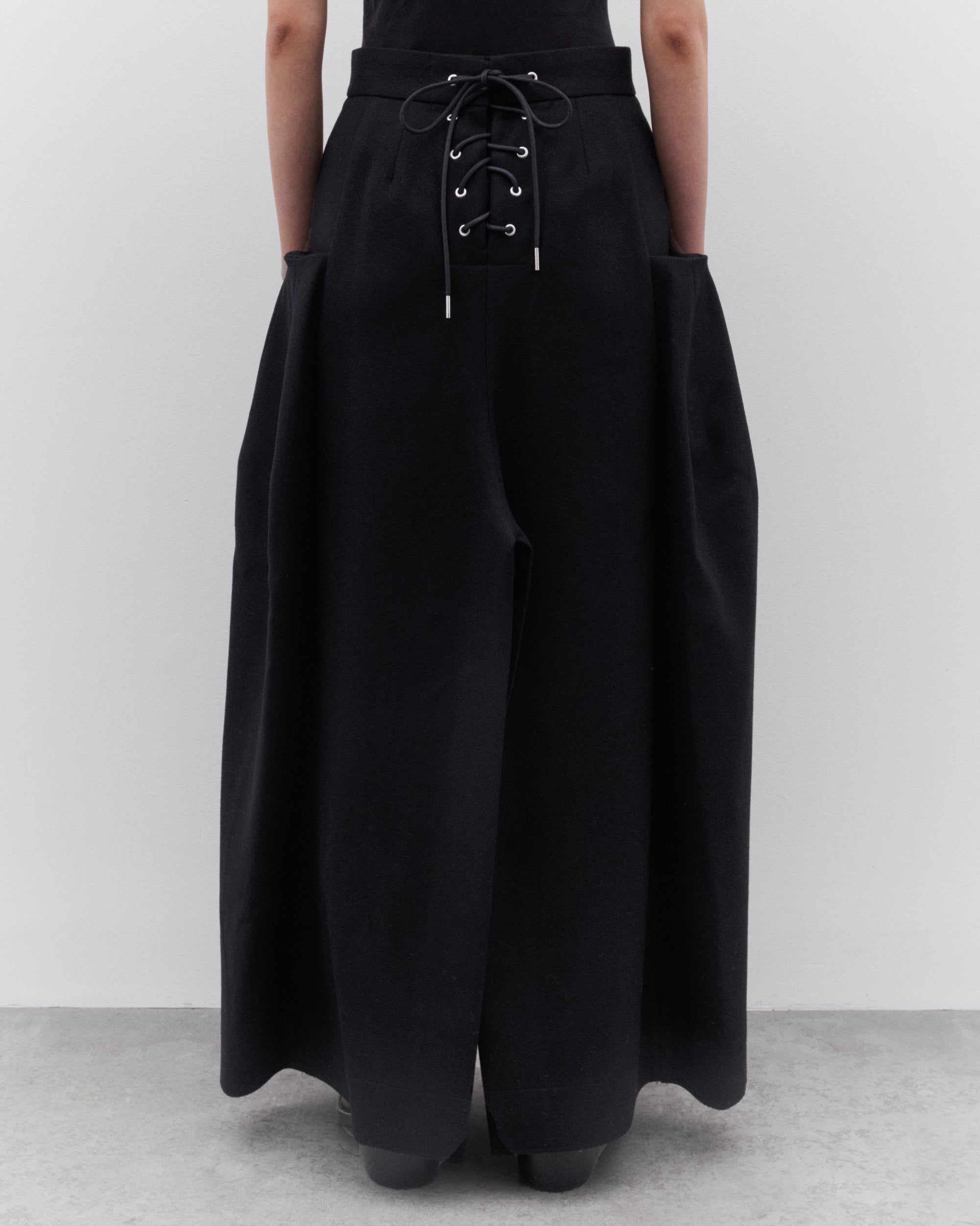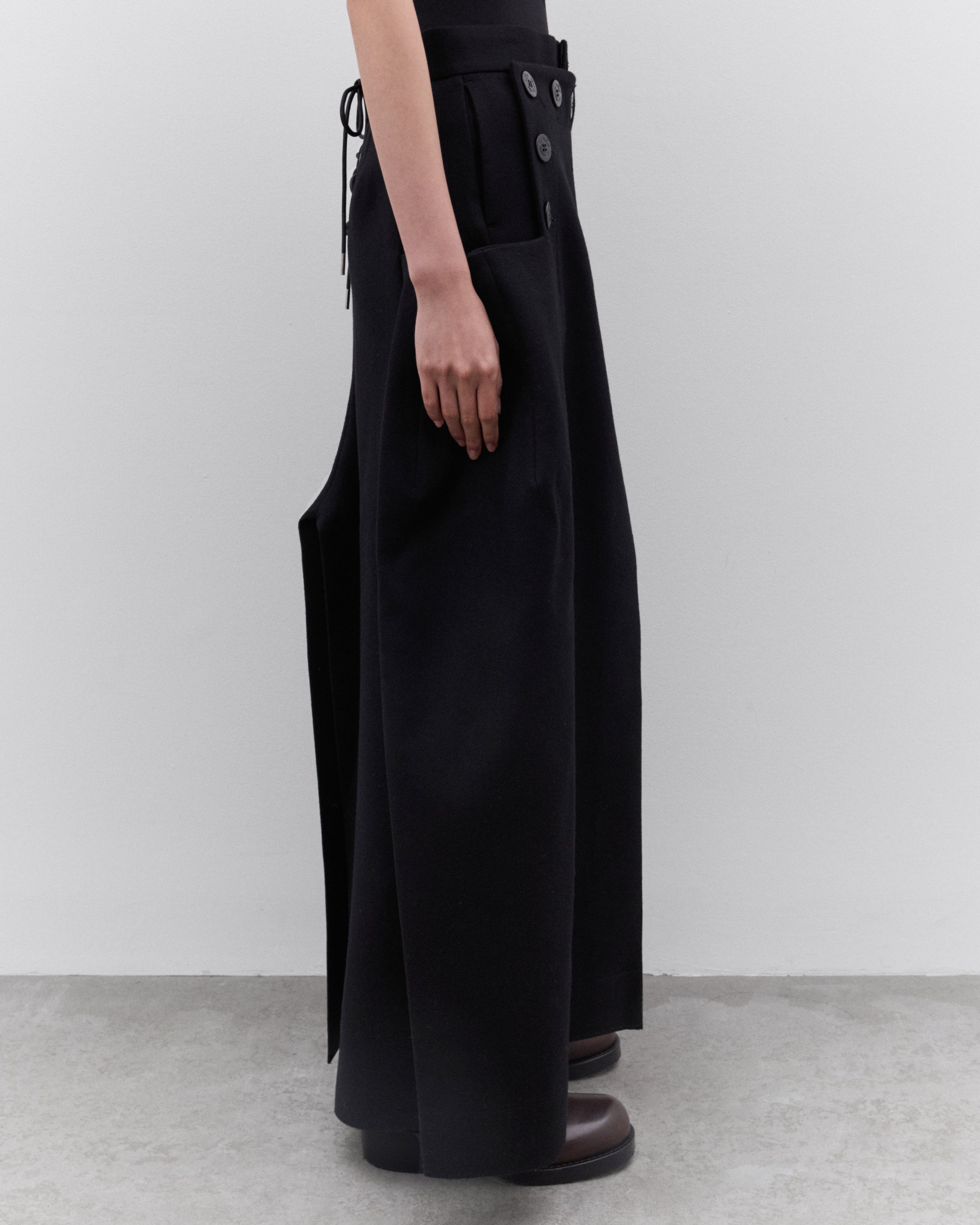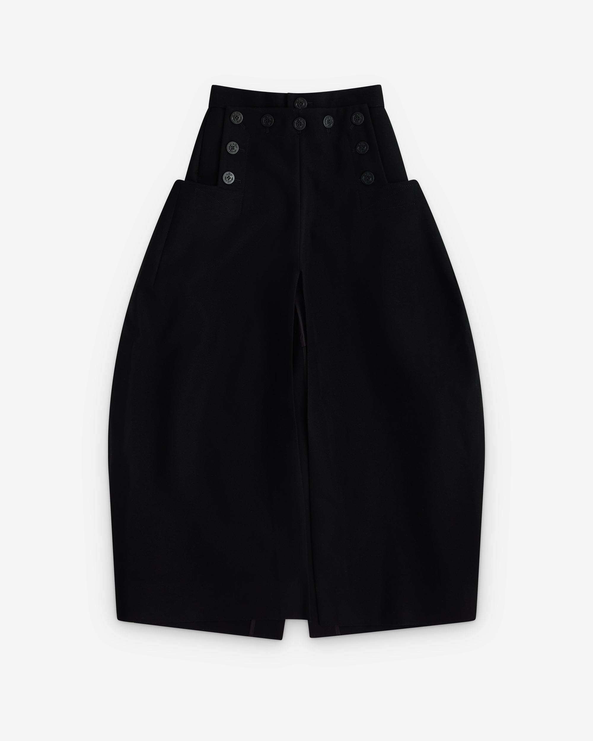 Front button detailVoluminous bodyCentre front ventRear corset fasteningLined100% Wool Made in Japan