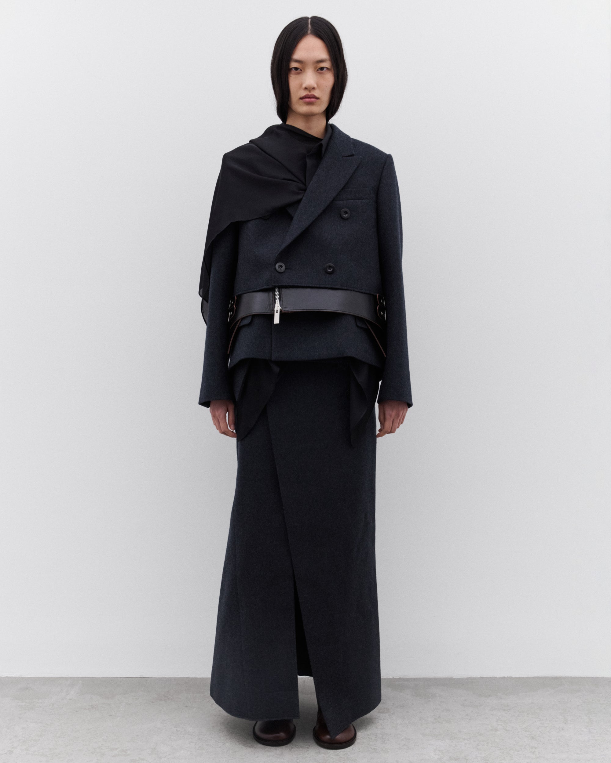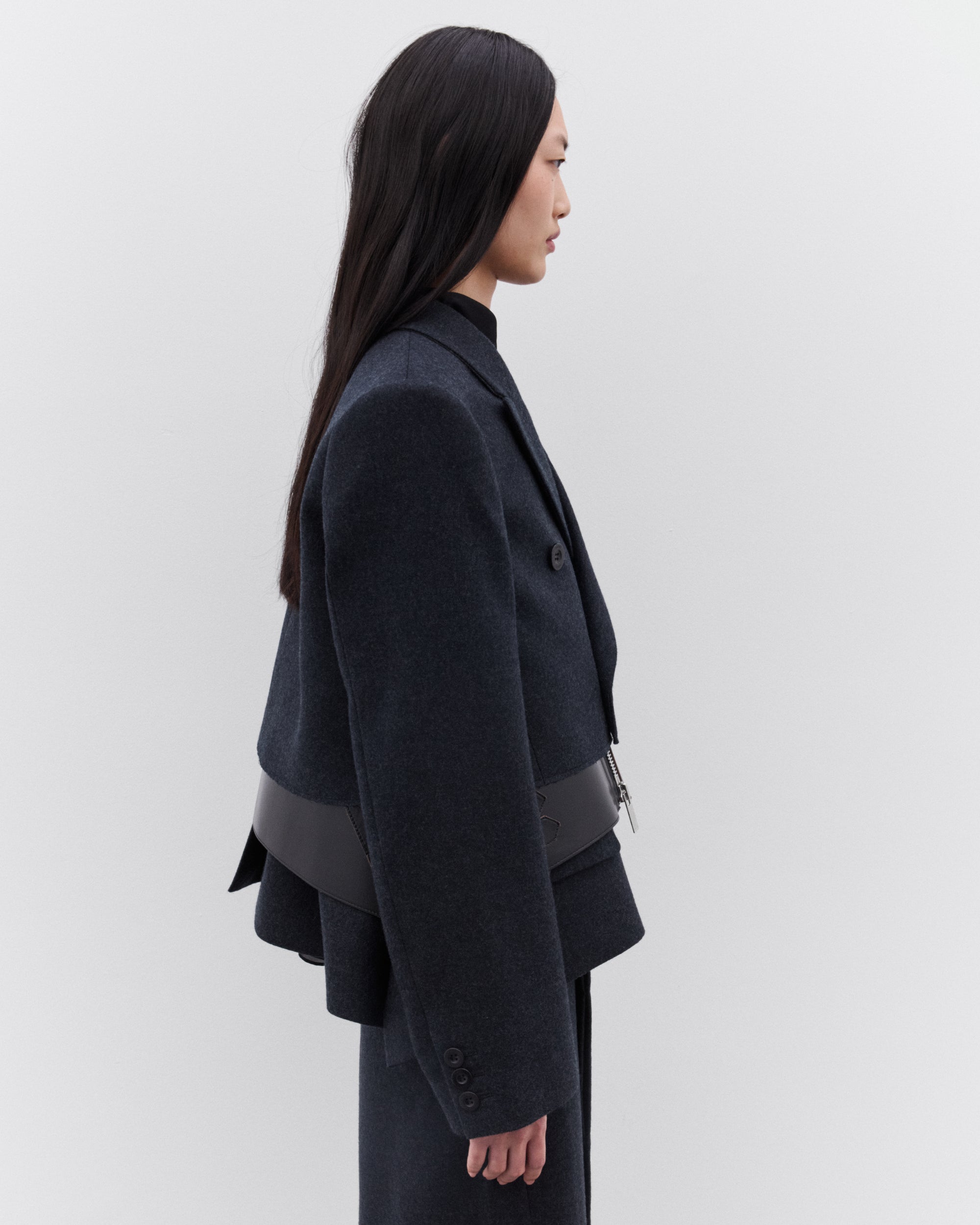 Double breasted closurePeak lapel collarInternal liningLeather panelling