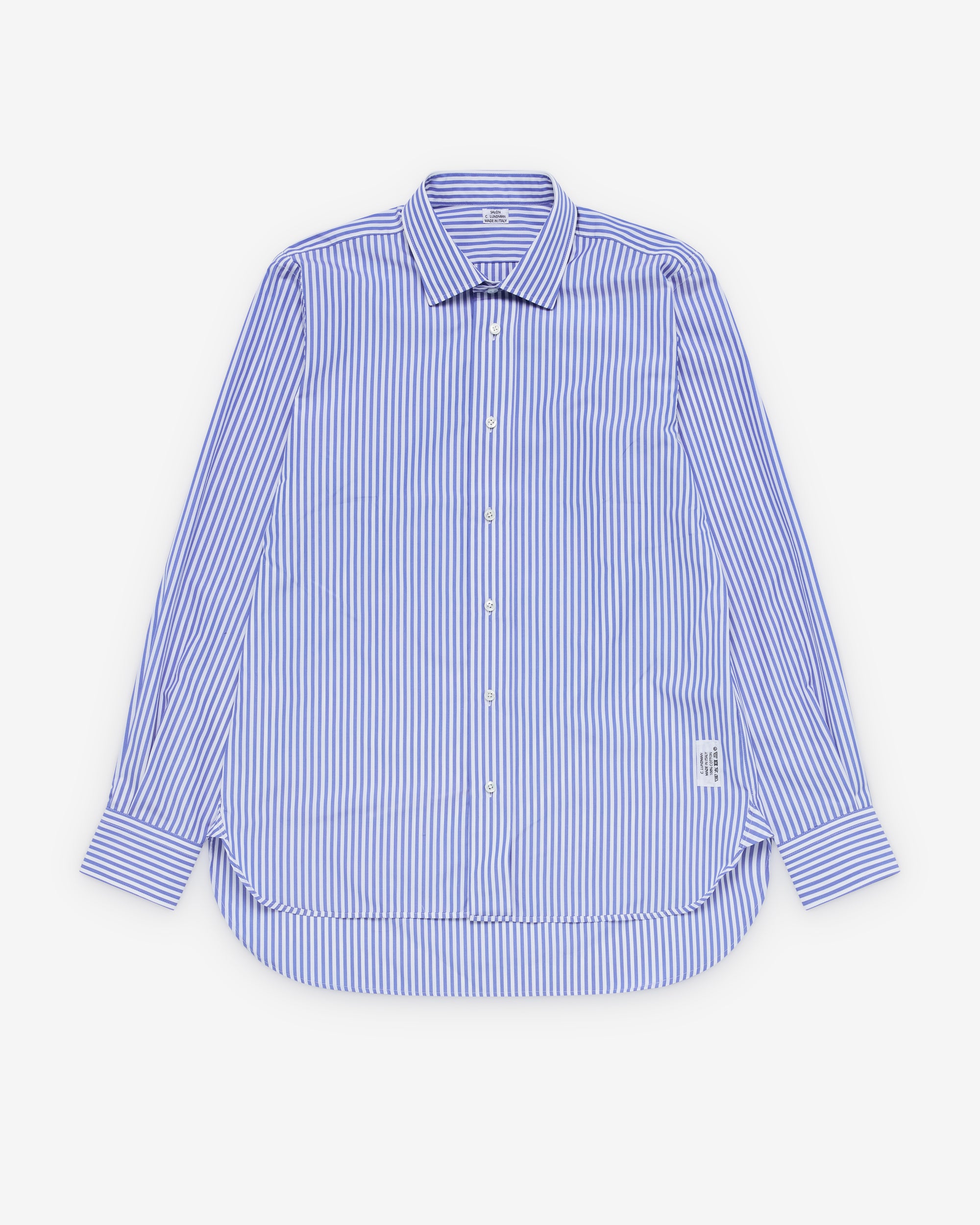Point collarLong sleevesBoxy fitExposed label at frontCurved shirttail hemButton close cuffs
