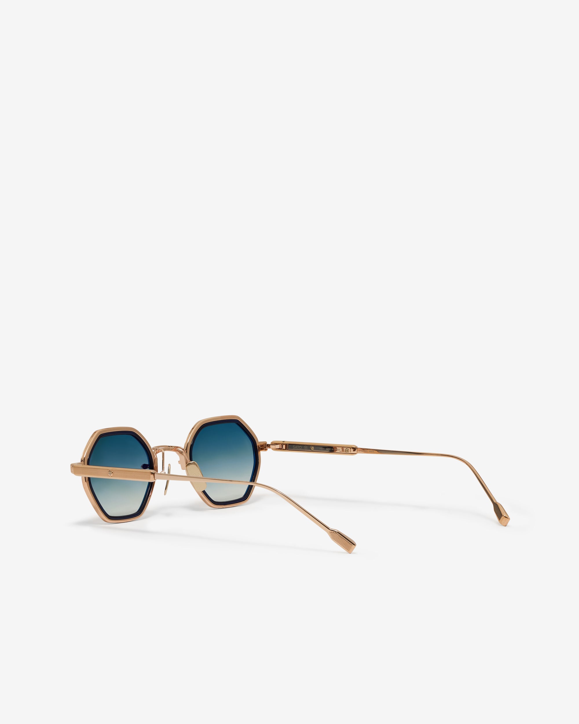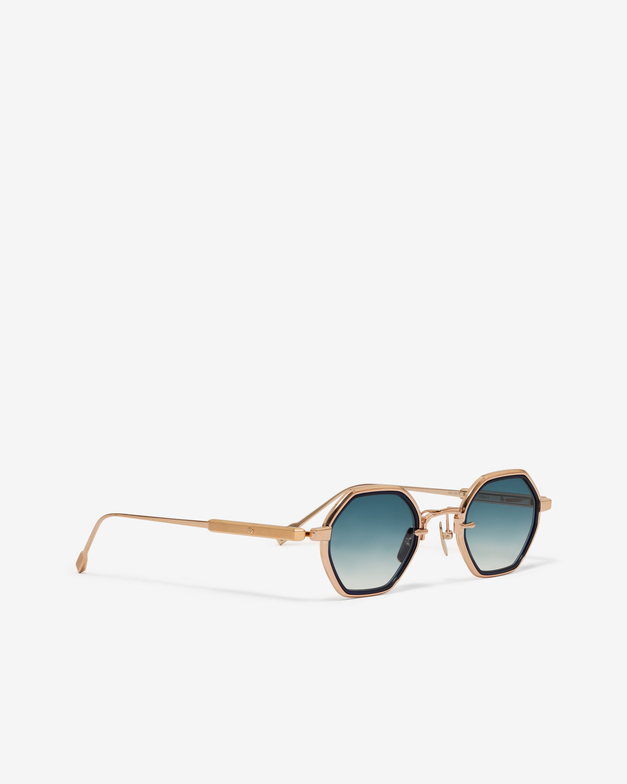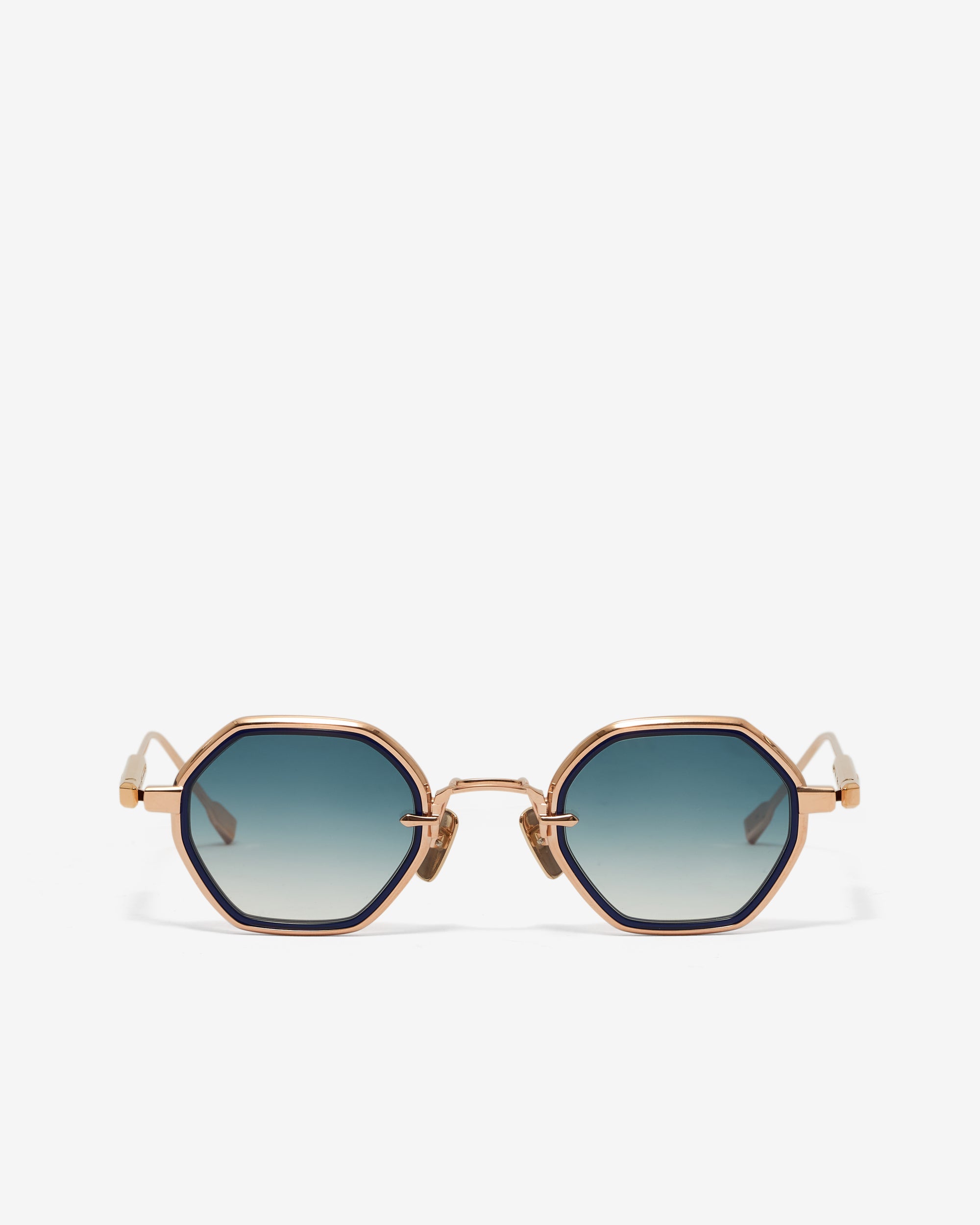 Titanium frame, rose gold coating.Dark blue takiron rim insert gradient dark blue lens.27 x 145 x 43 mmLimited edition of 350 pieces