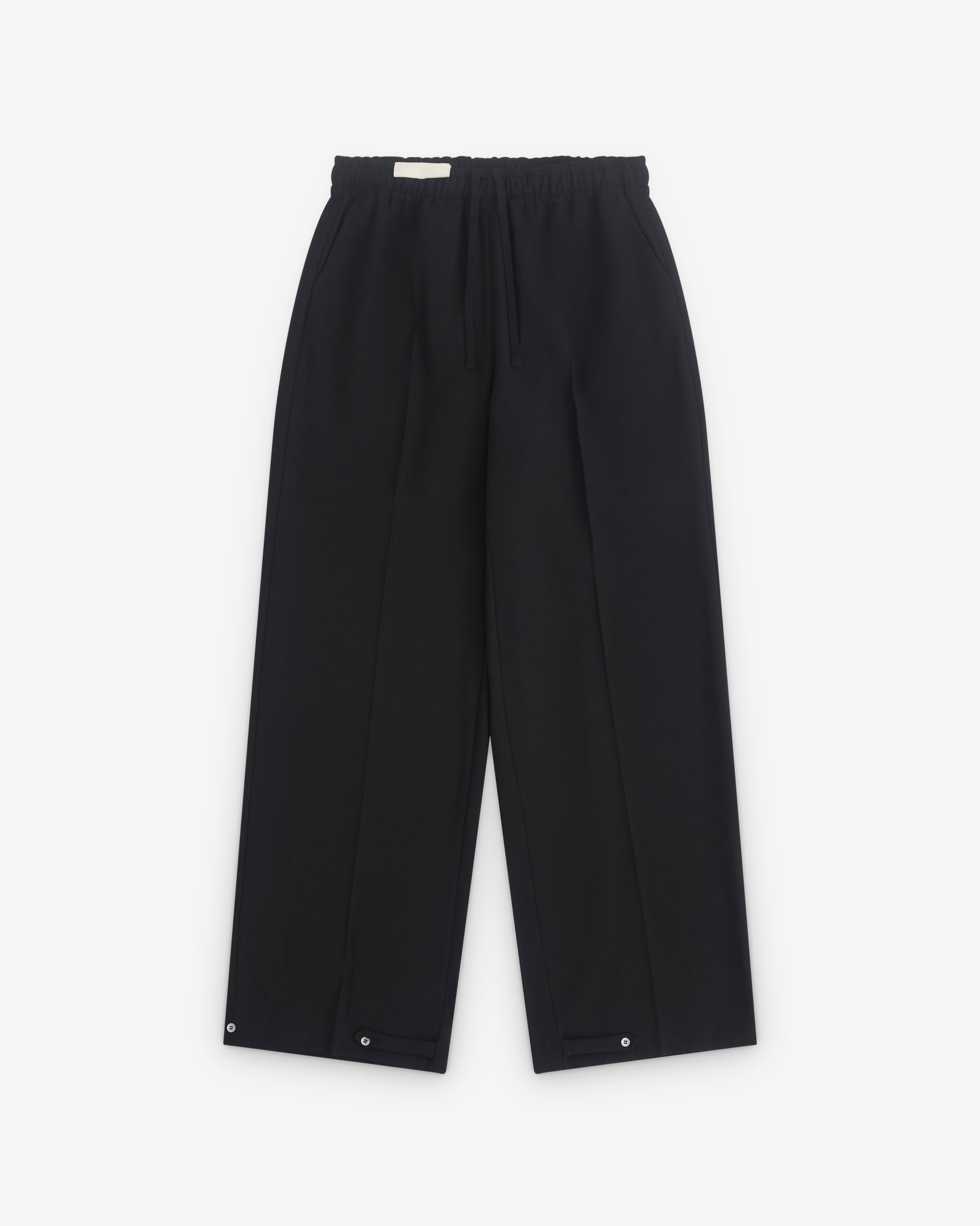 Drawstring waist bandSide seam pocketsPleated frontLoose fitAdjustable button cuffs