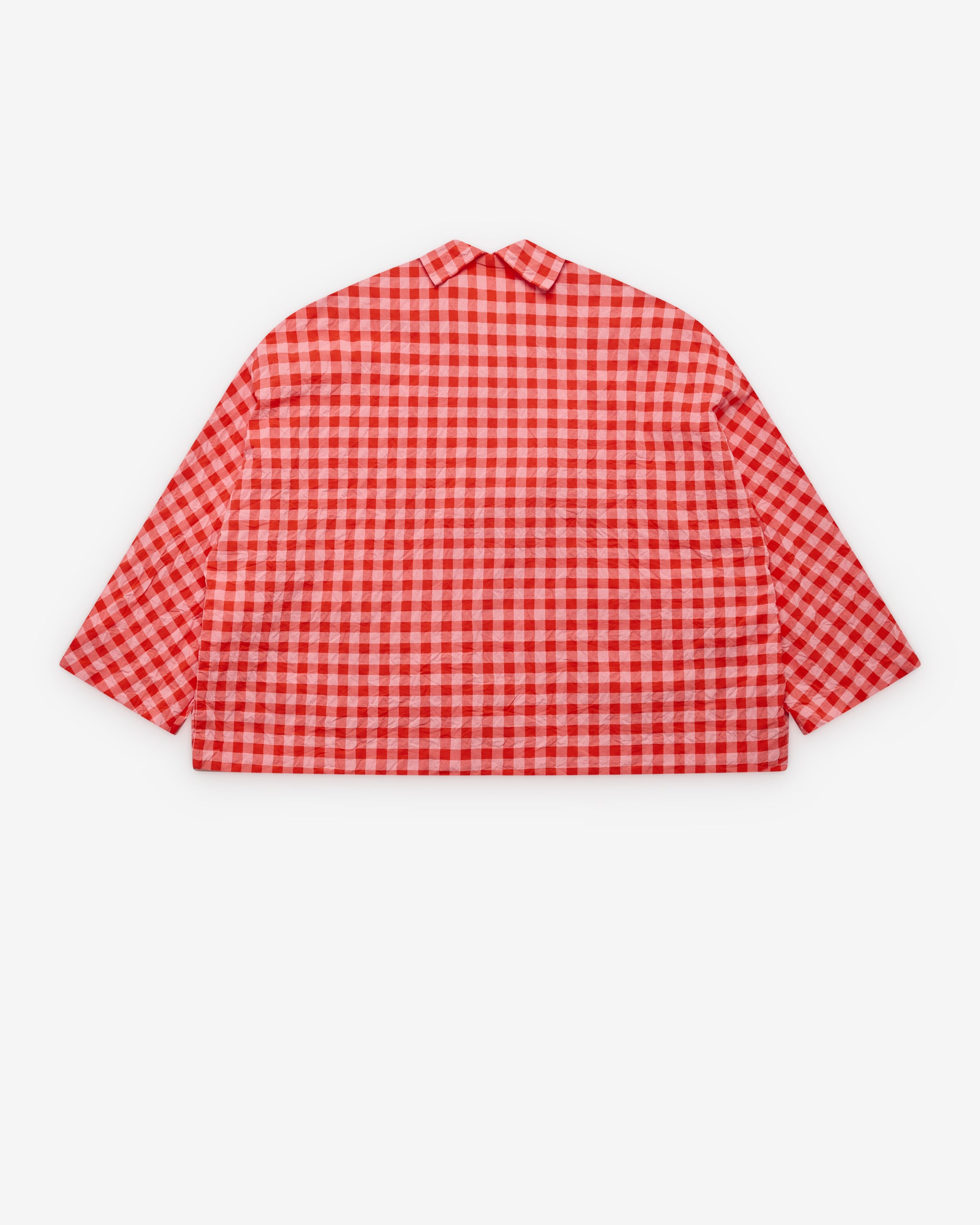Open collarFront patch pocketsCropped fit through bodyLong sleevesWashed gingham cotton fabric