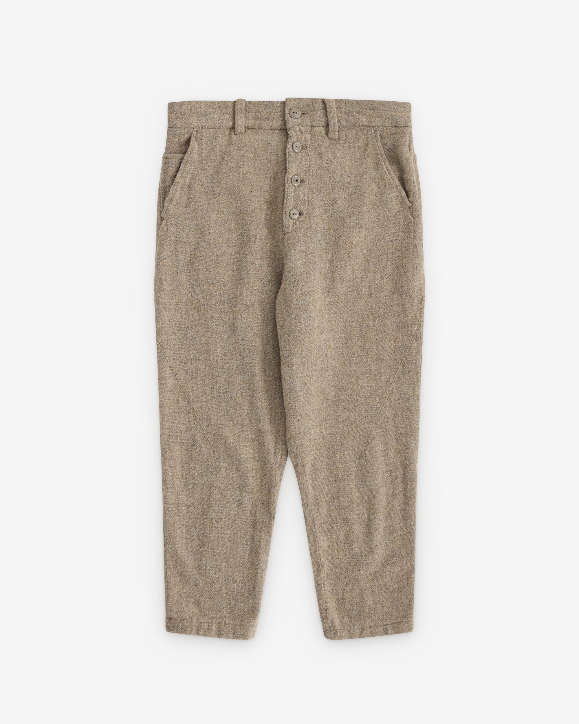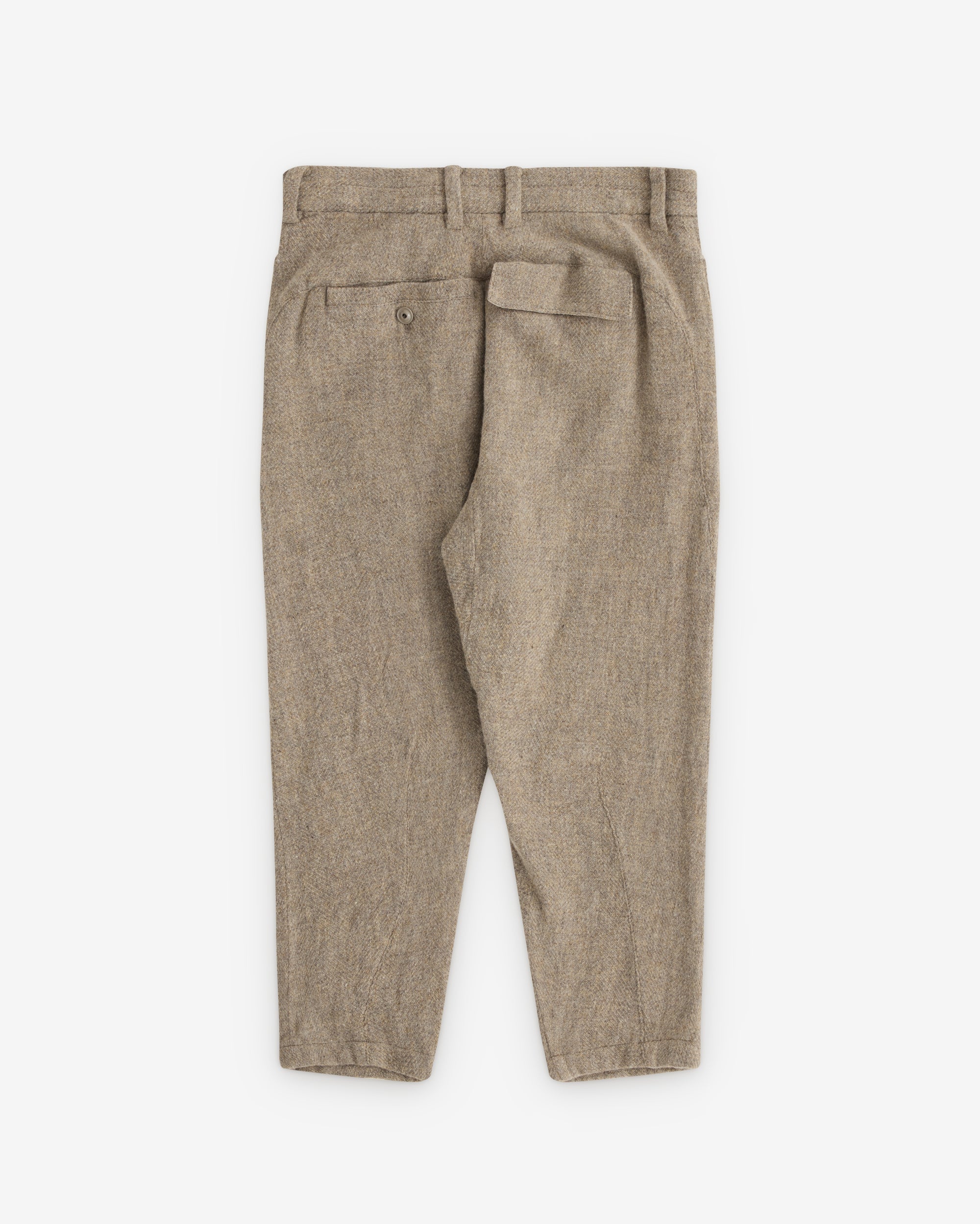 Wool fleck fabricButton closure at waist and flyTapered fitSide seam slip pocketsTwo rear pockets