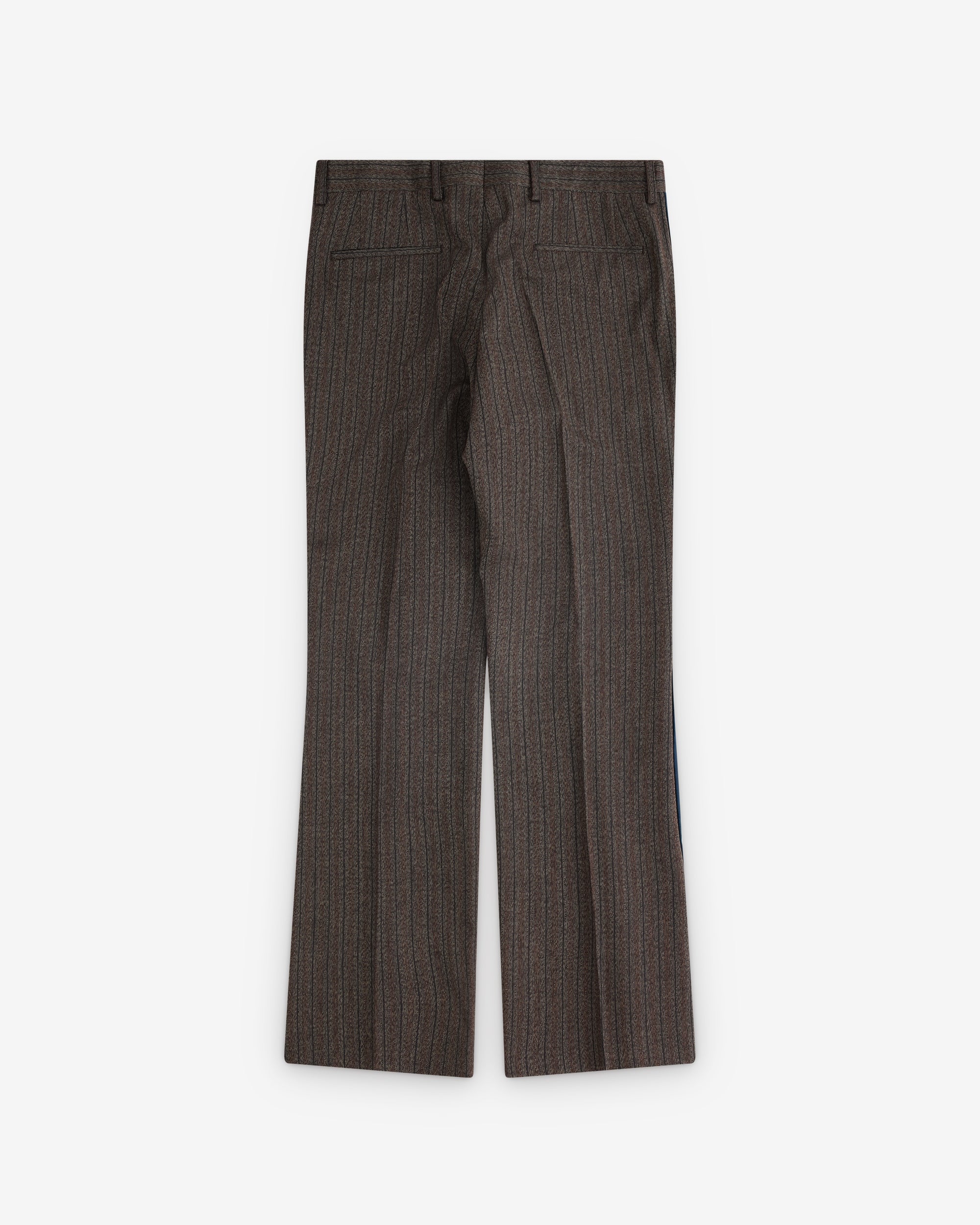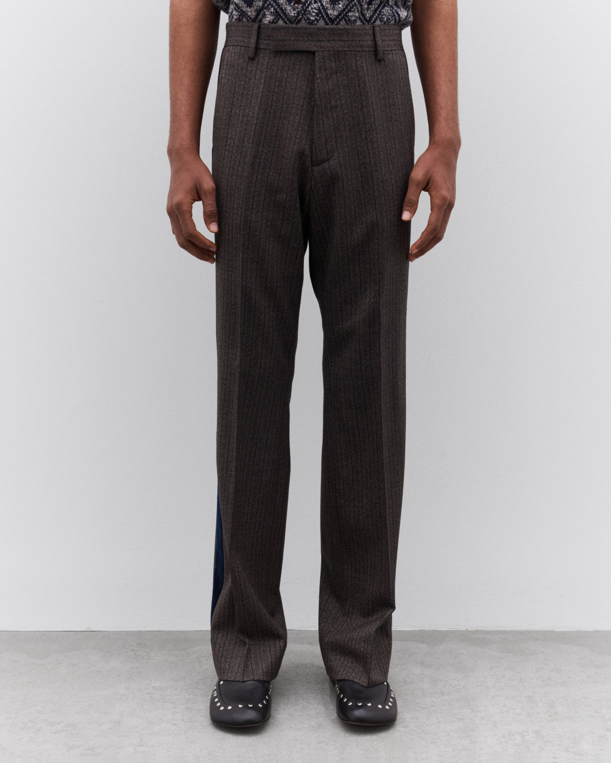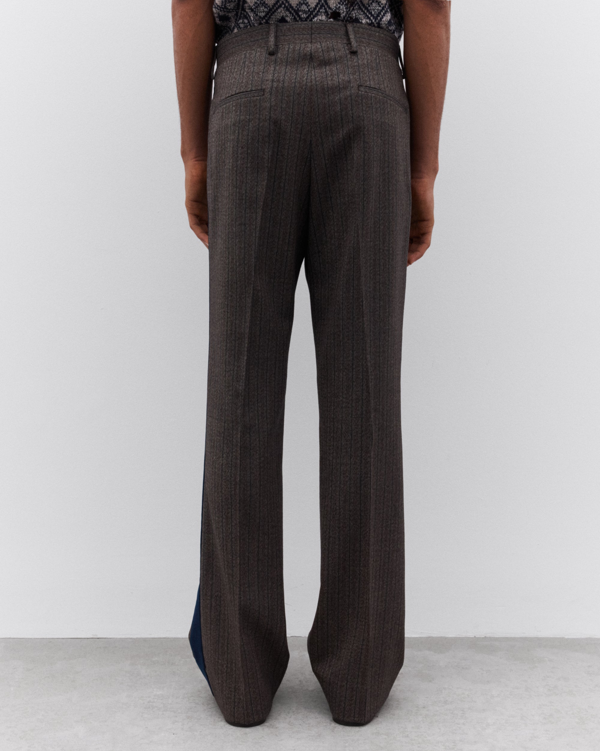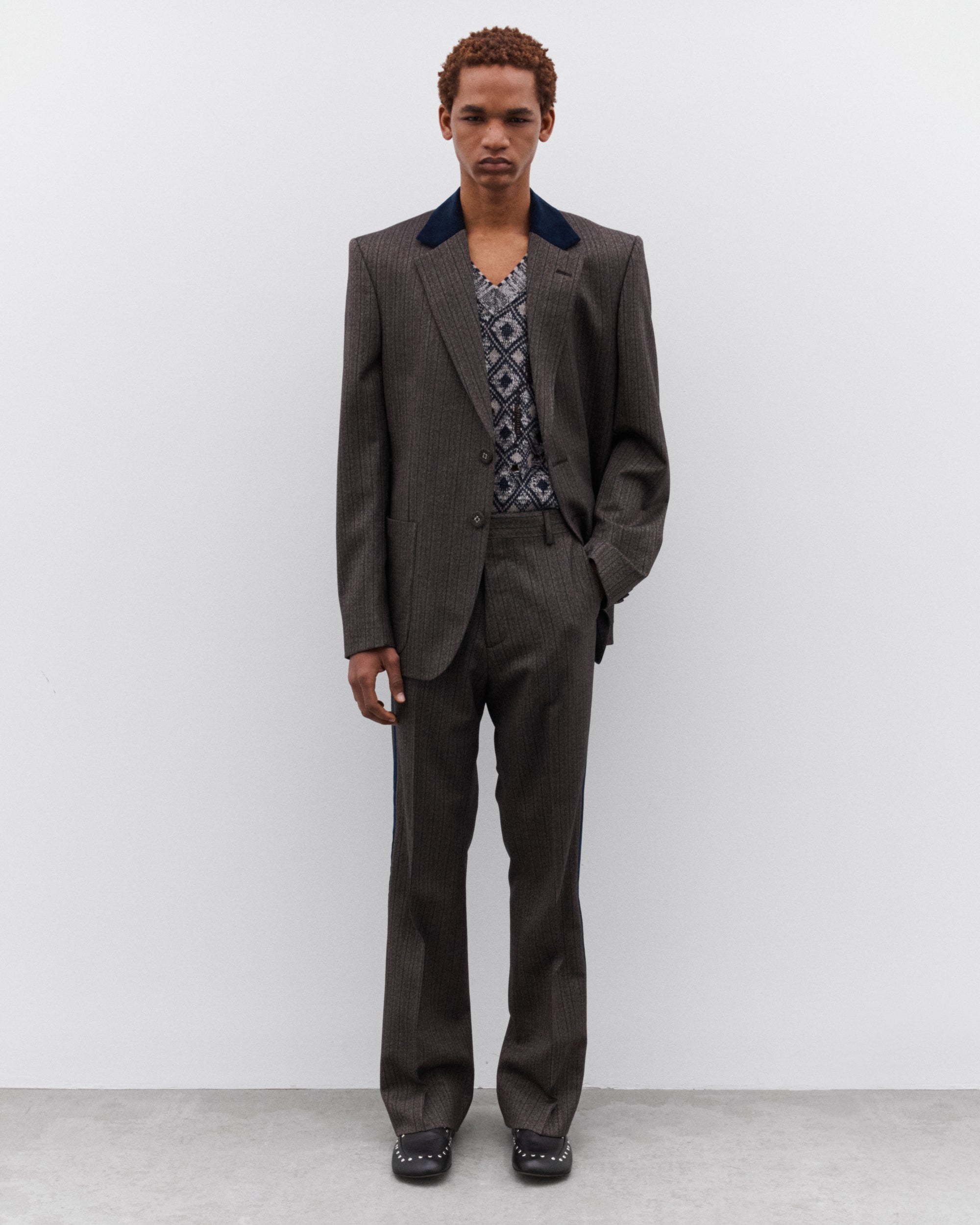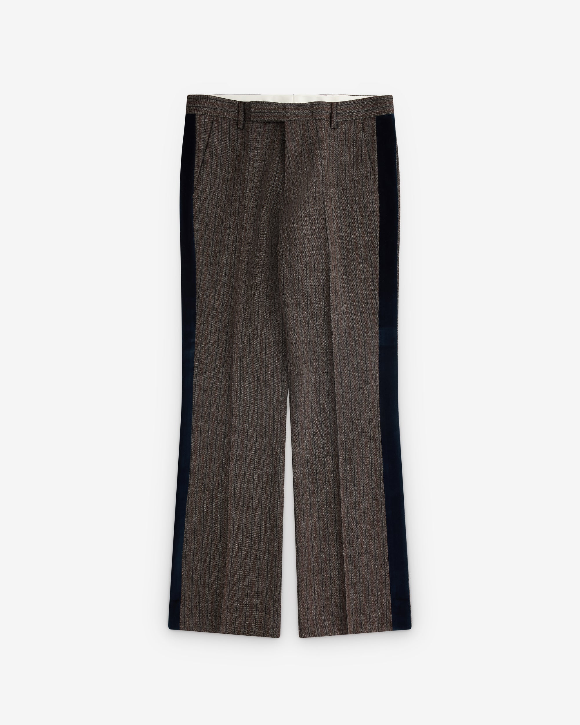 Hook and eye wait closureZip flySide seam slip pocketsFront and back pleatsVelvet side panelsTwo rear pockets