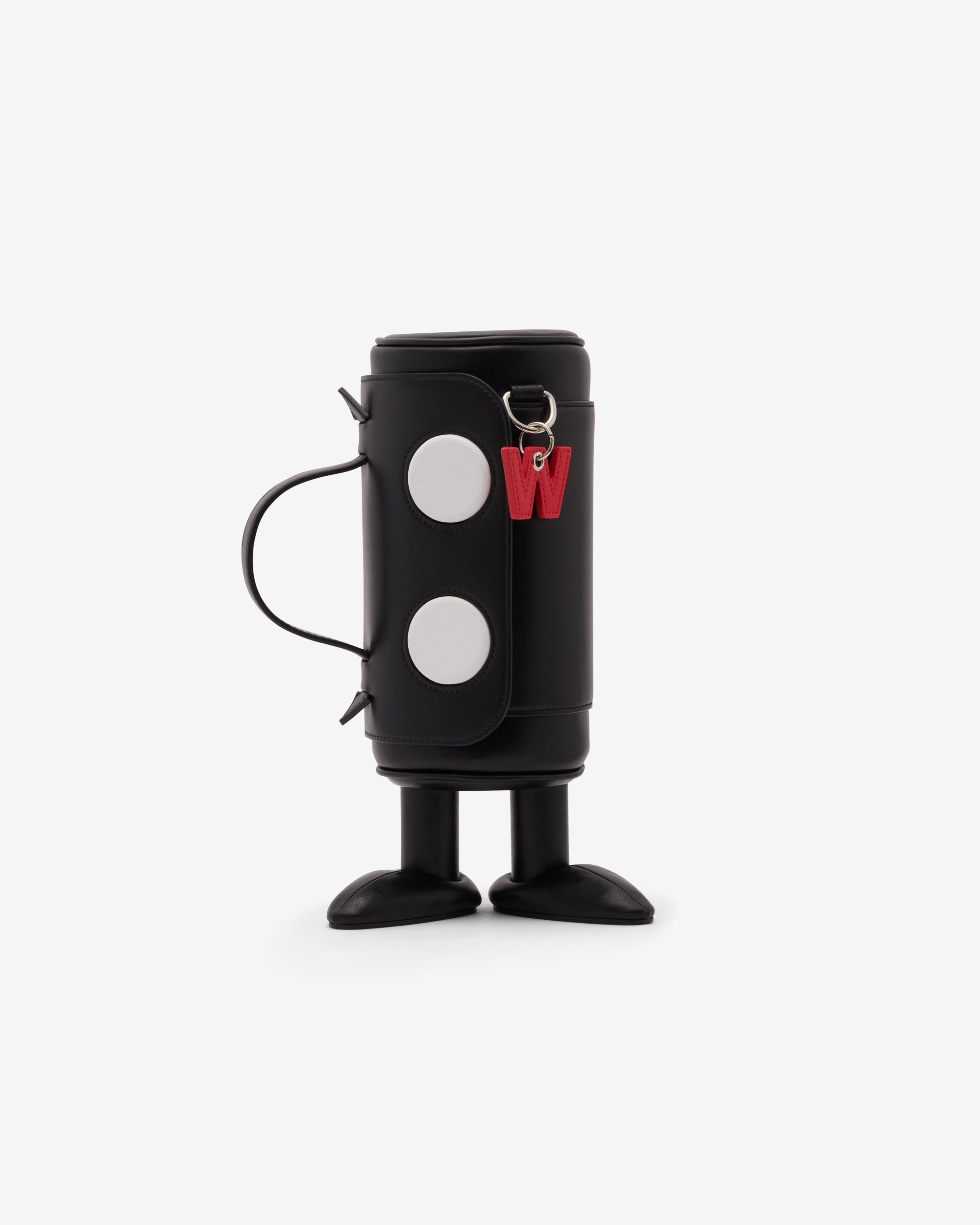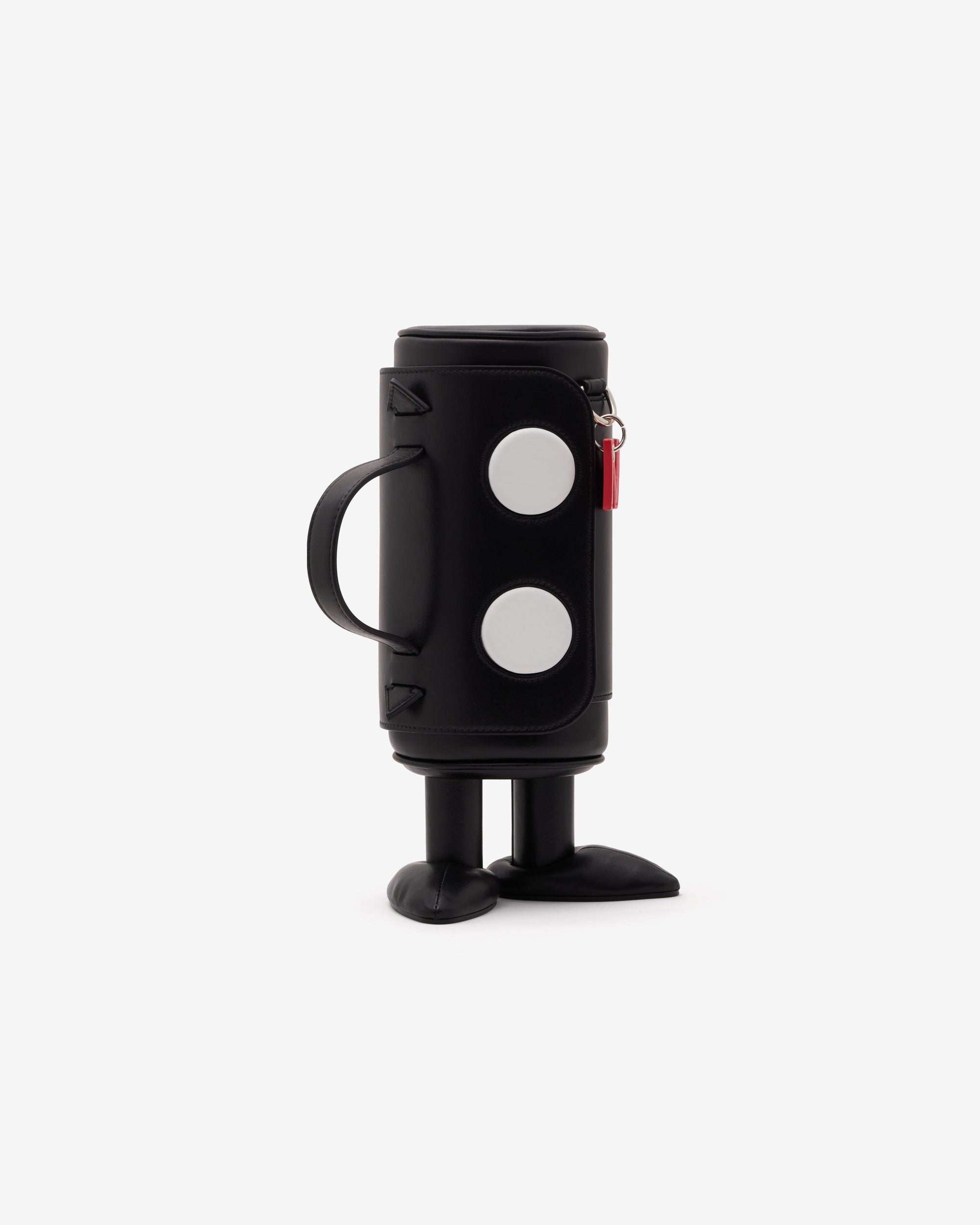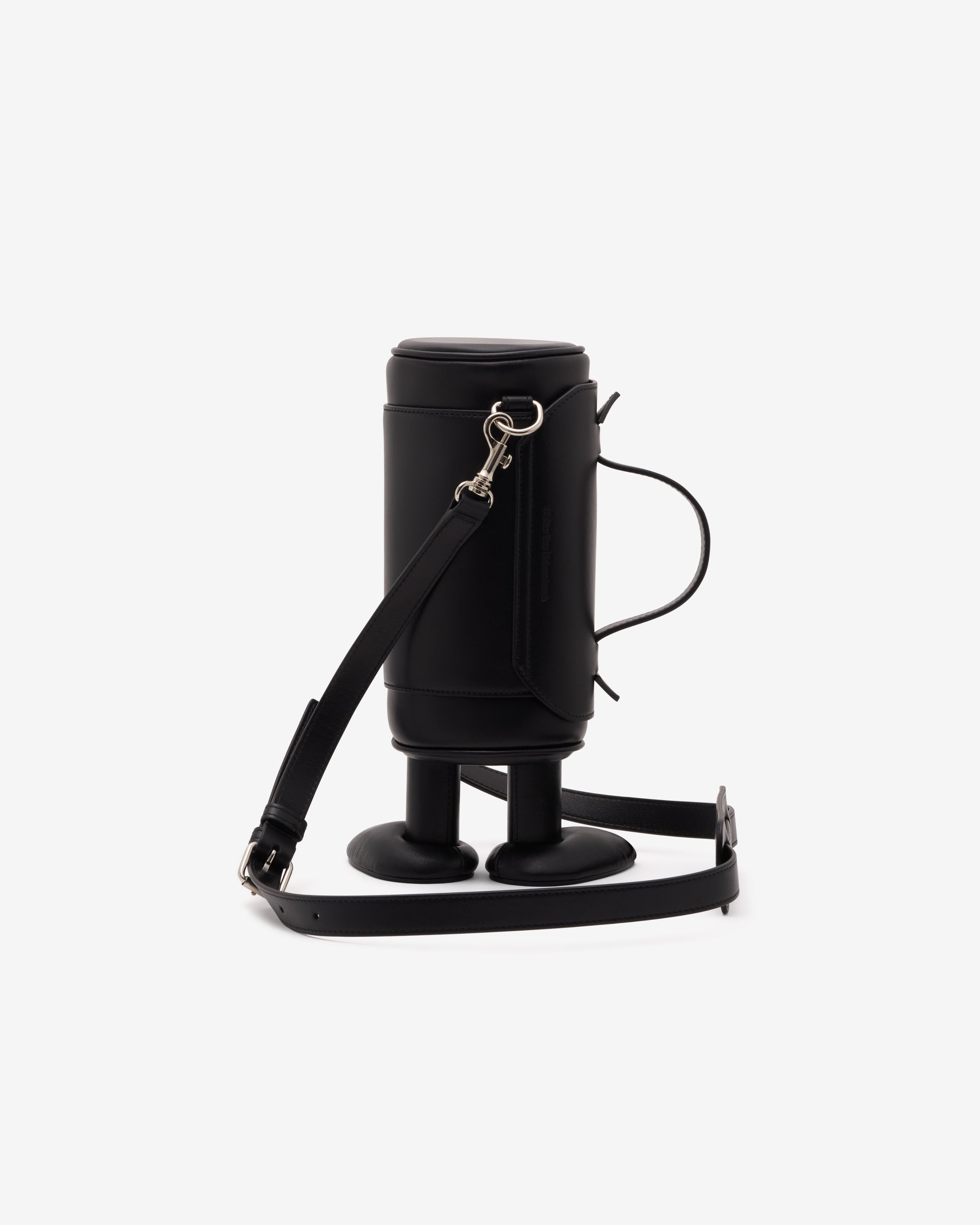 Top carry handleAdjustable shoulder strapAttached logo charmLeather feet at bottomFlap close opening