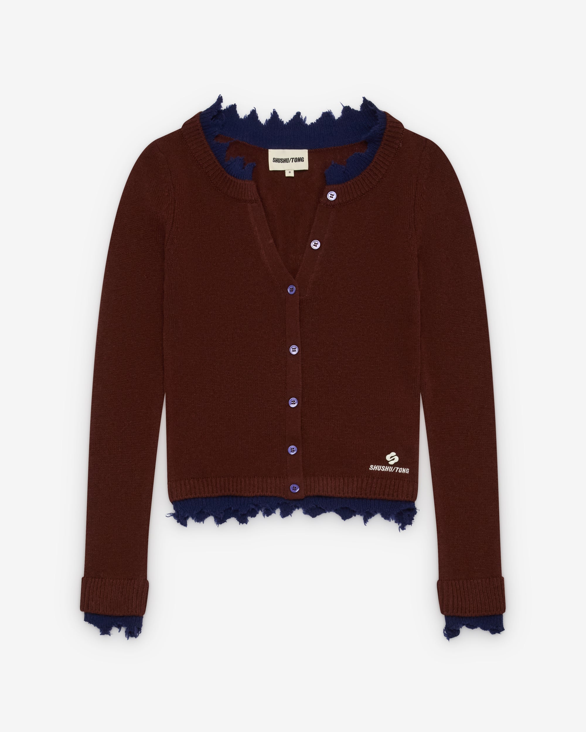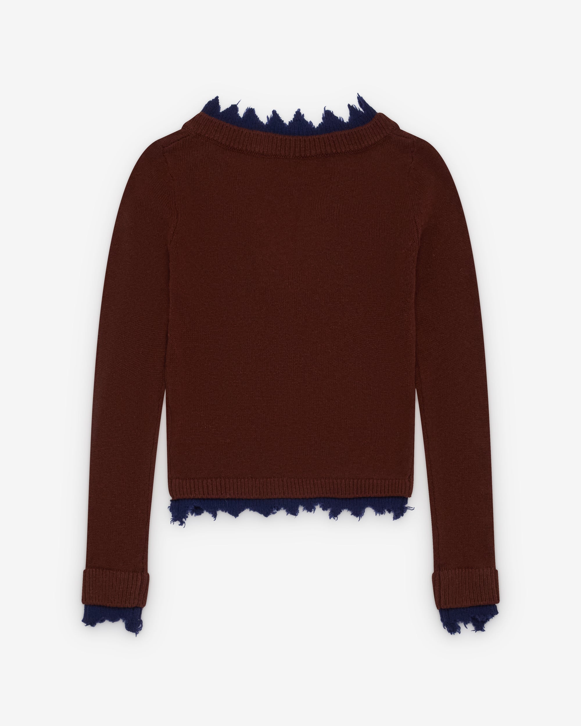 Round neckline with contrast trimLong sleeves with contrast cuffsRaw, unfinished edges throughoutContrast trim at hemRelaxed, slightly cropped fit