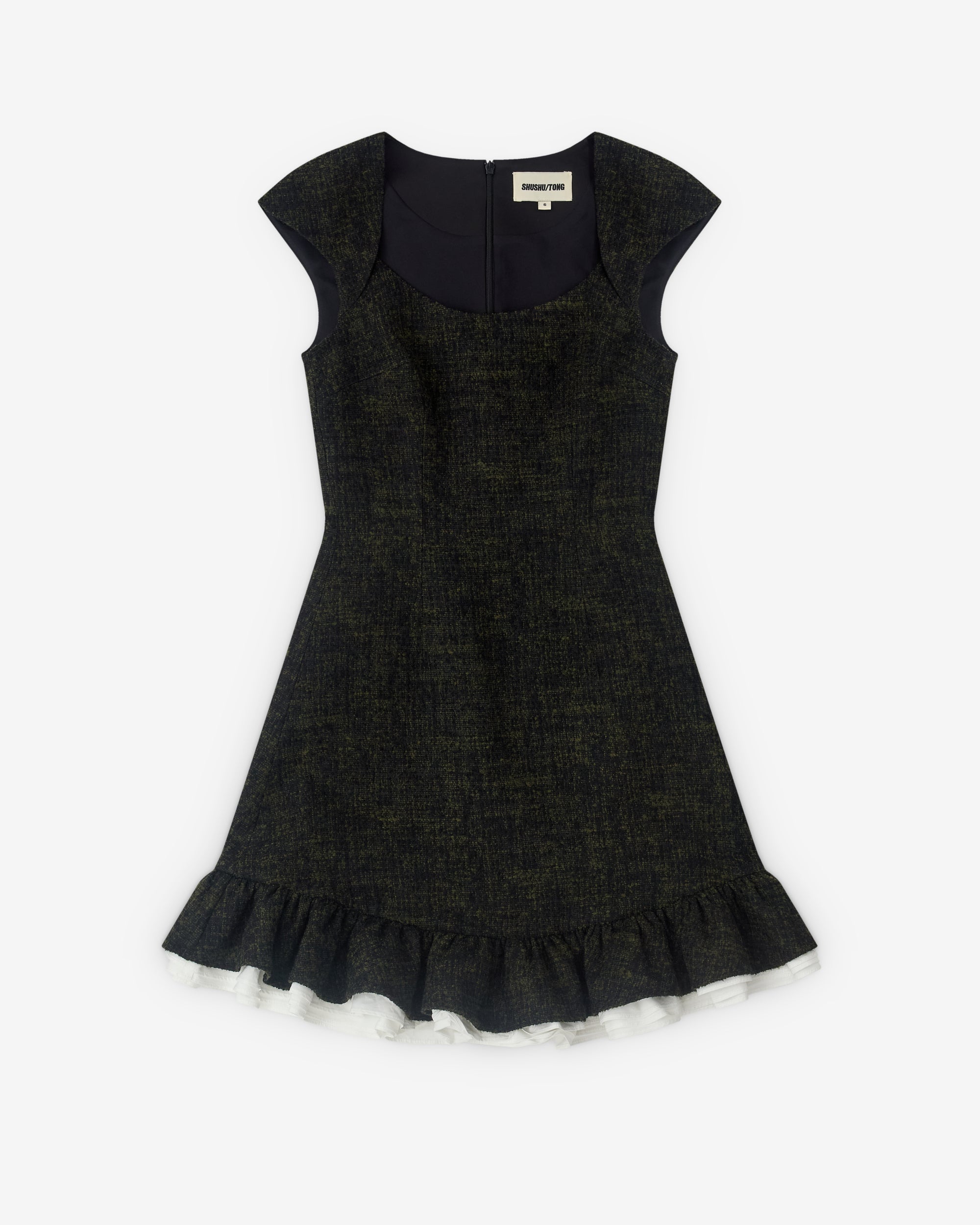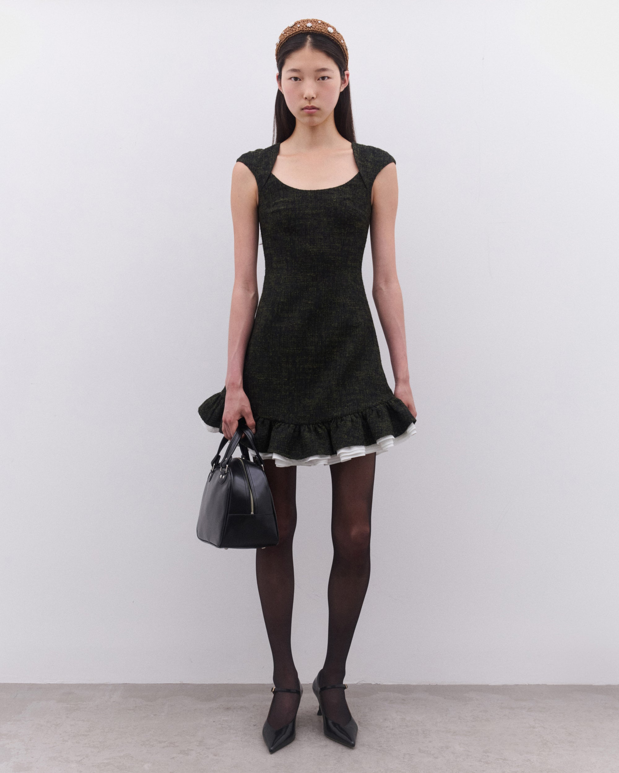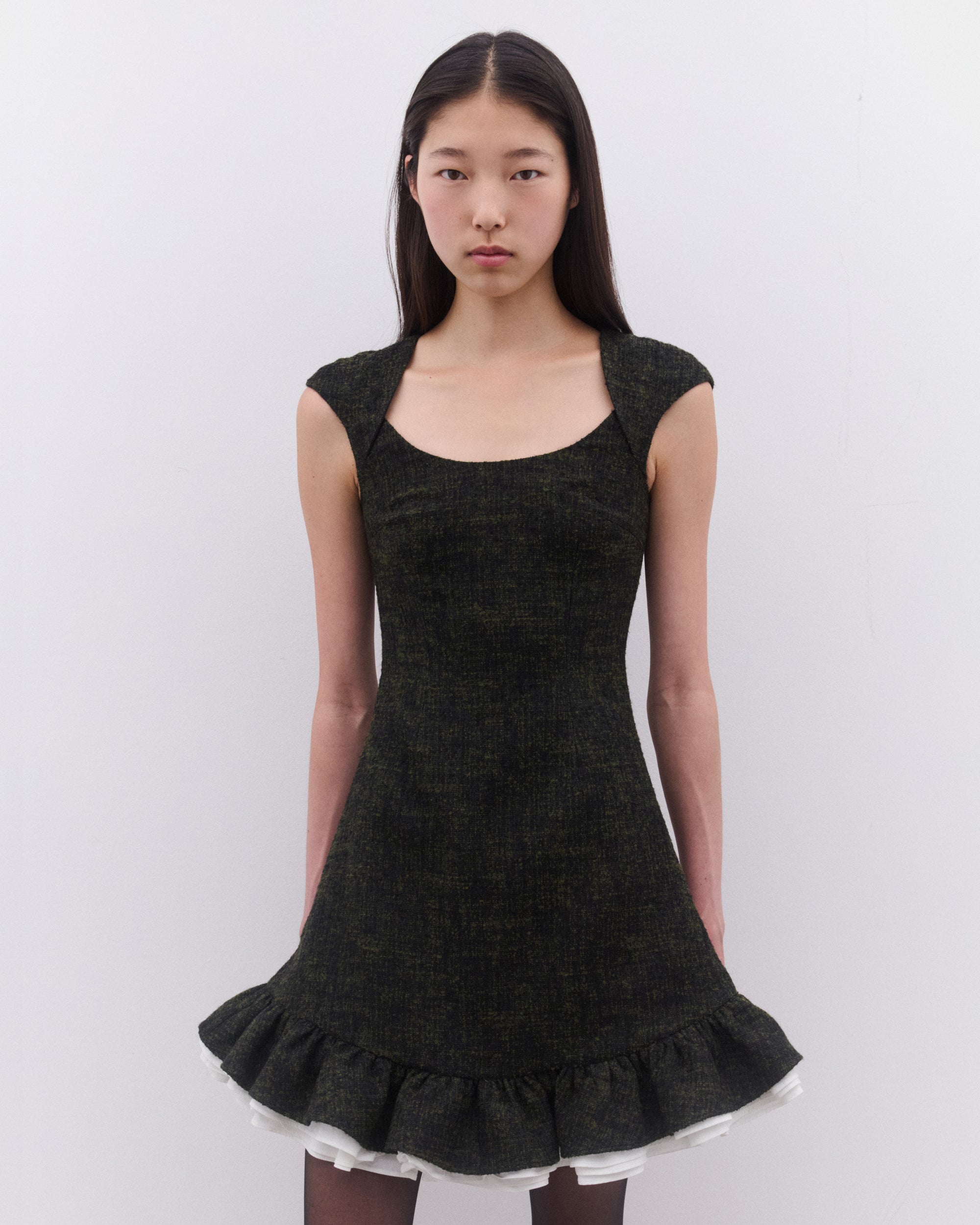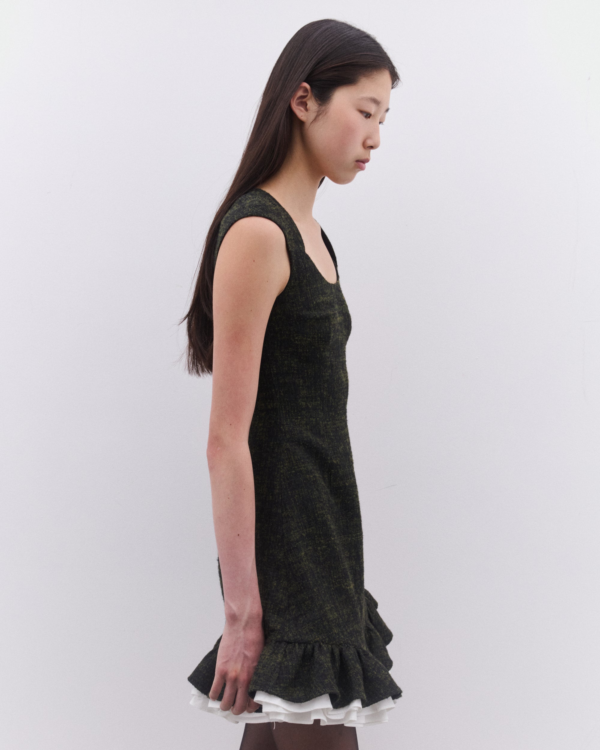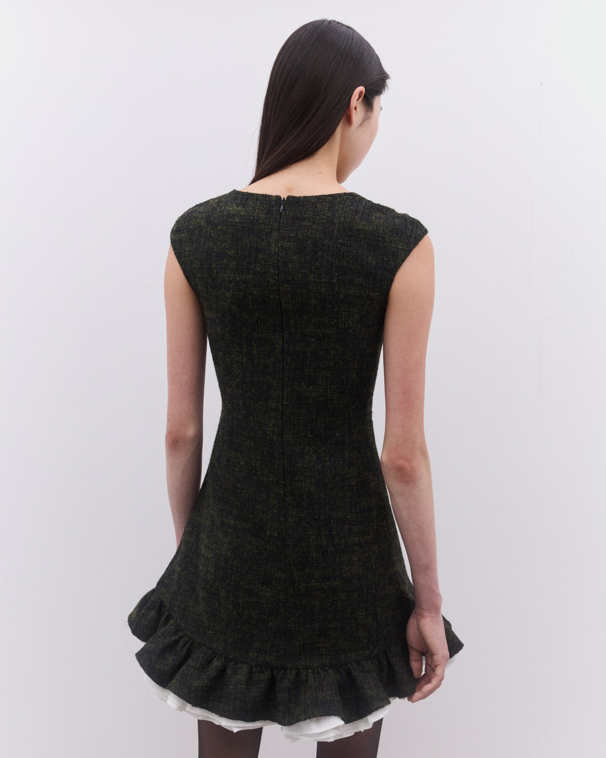 Scoop necklineInternal liningA-line silhouette Layered ruffle at skirtRear zip closure