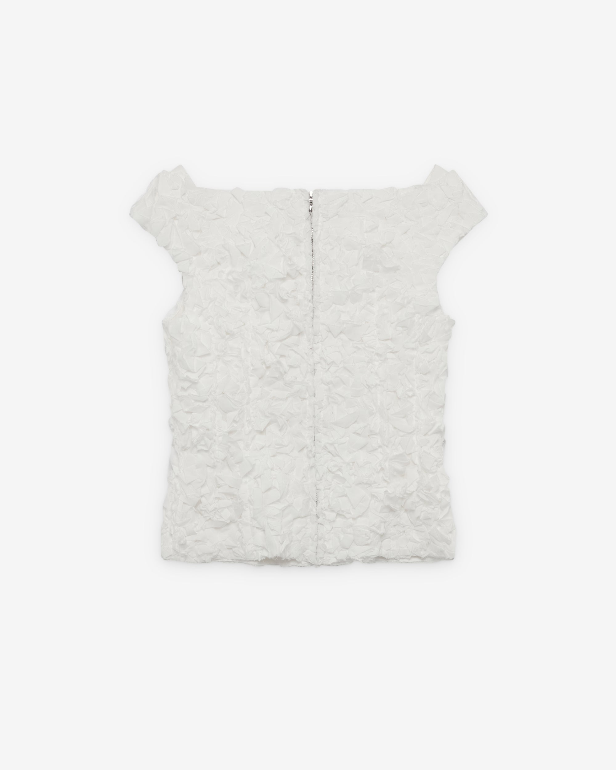 Sleeveless off shoulder topBow detail at chestBack zip closureCut out at chestCropped fit