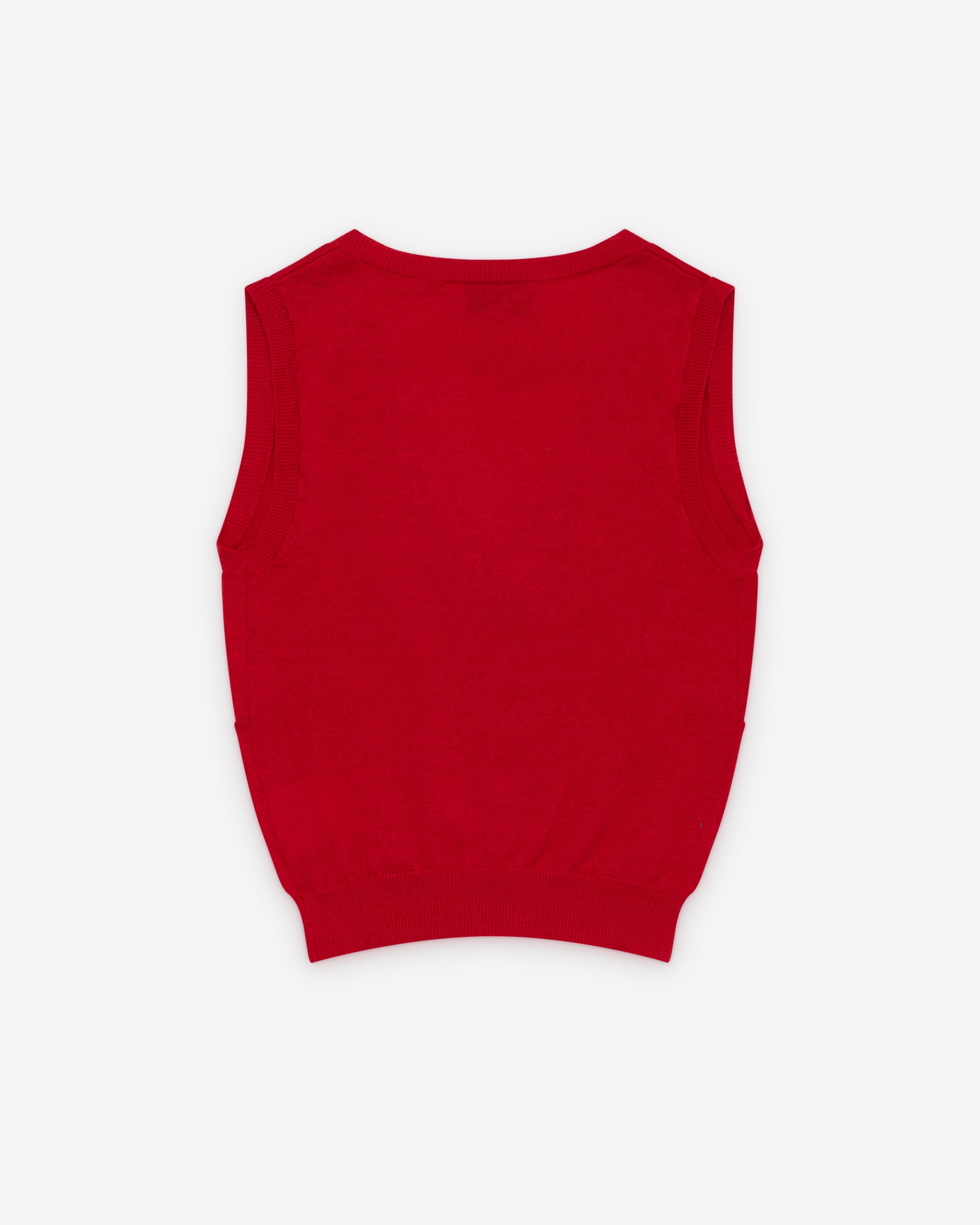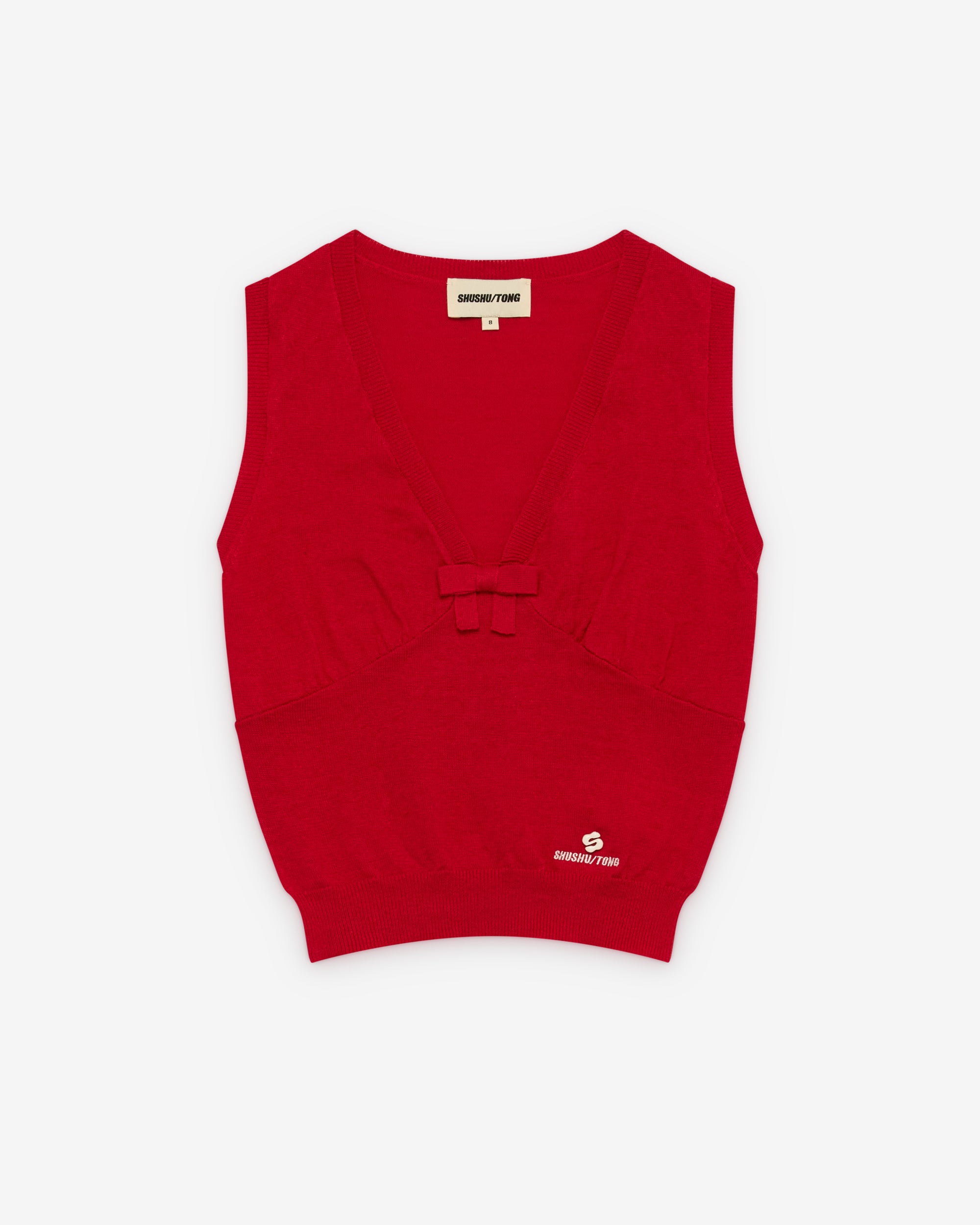 Bow detail at necklineV-necklineSleeveless knit designRibbed knit trimsSlim fitEmbroidered logoCropped length