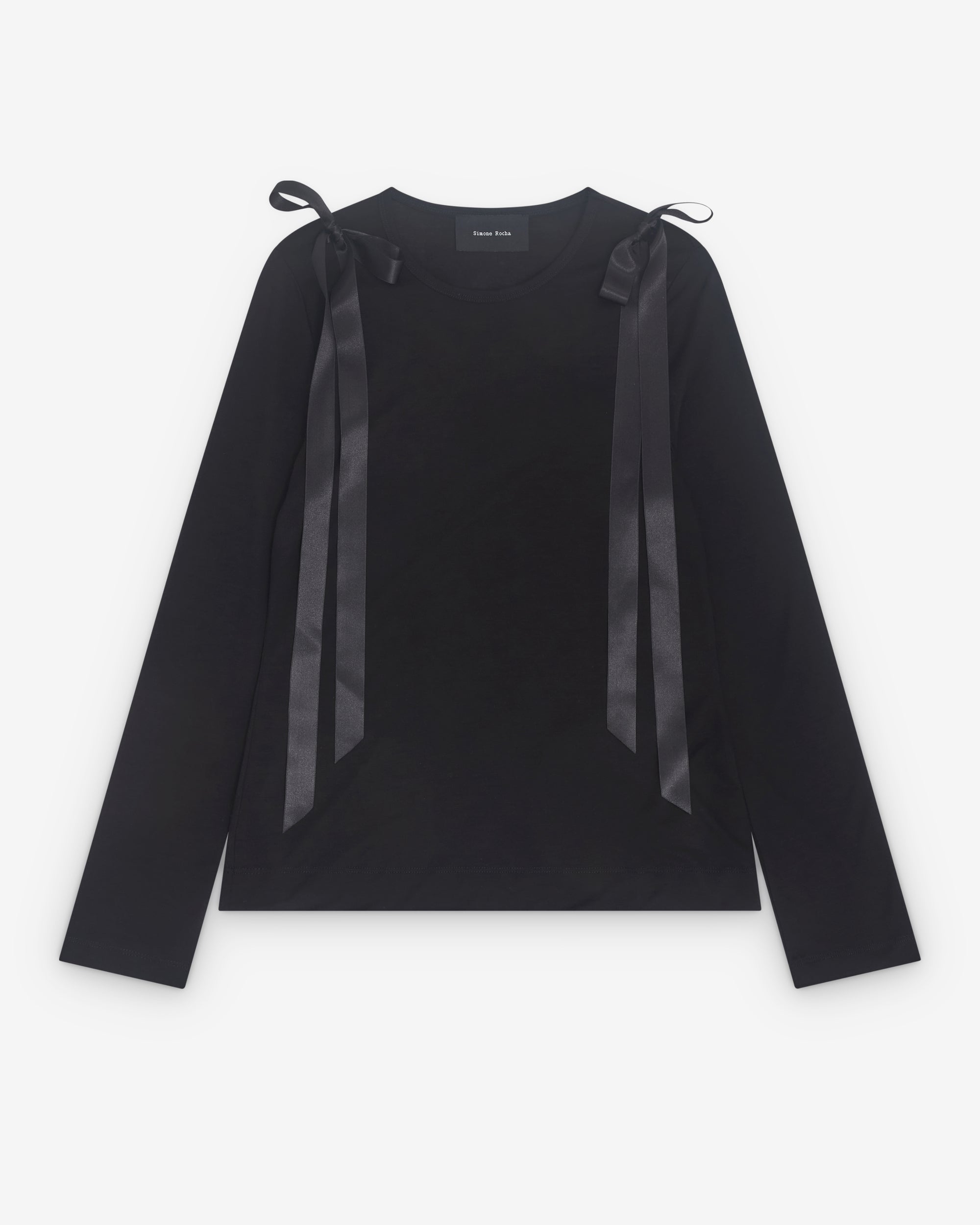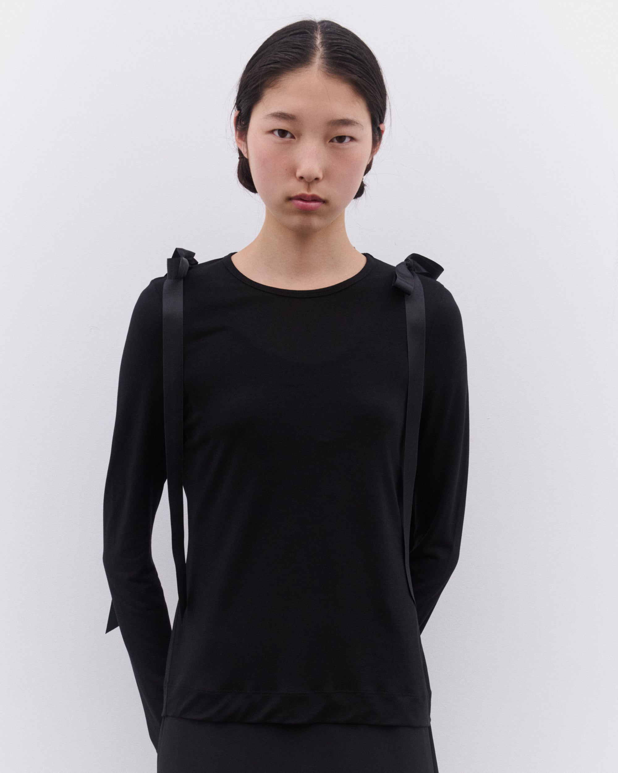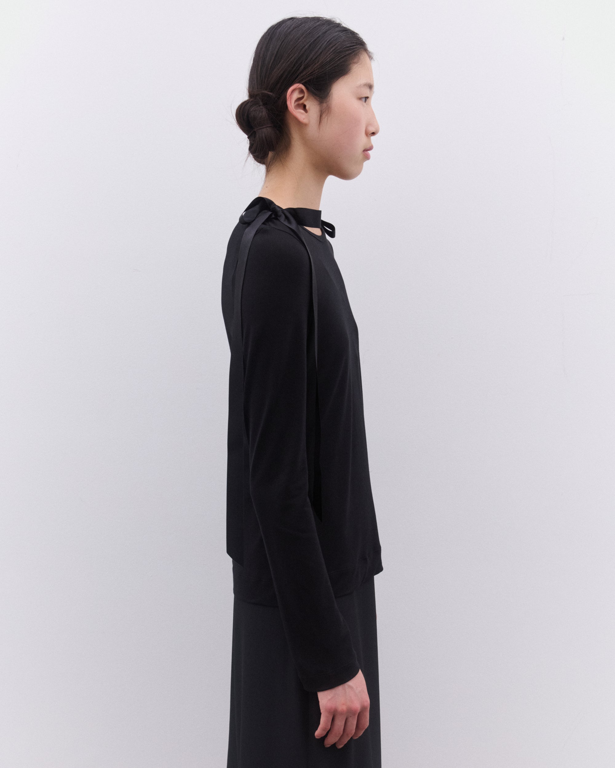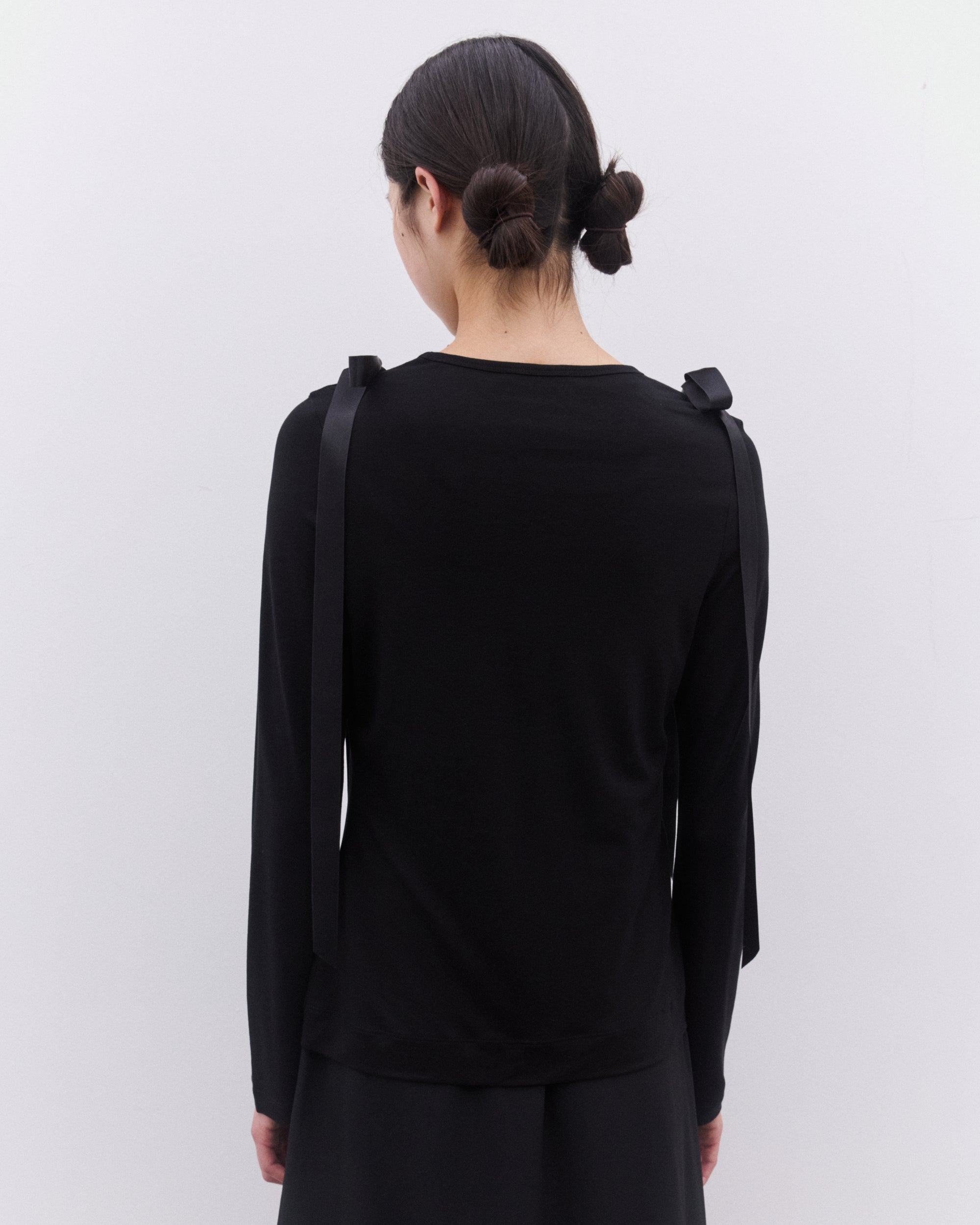 Bow tied ribbon detail at shoulderRound neckLong sleevesStraight hem