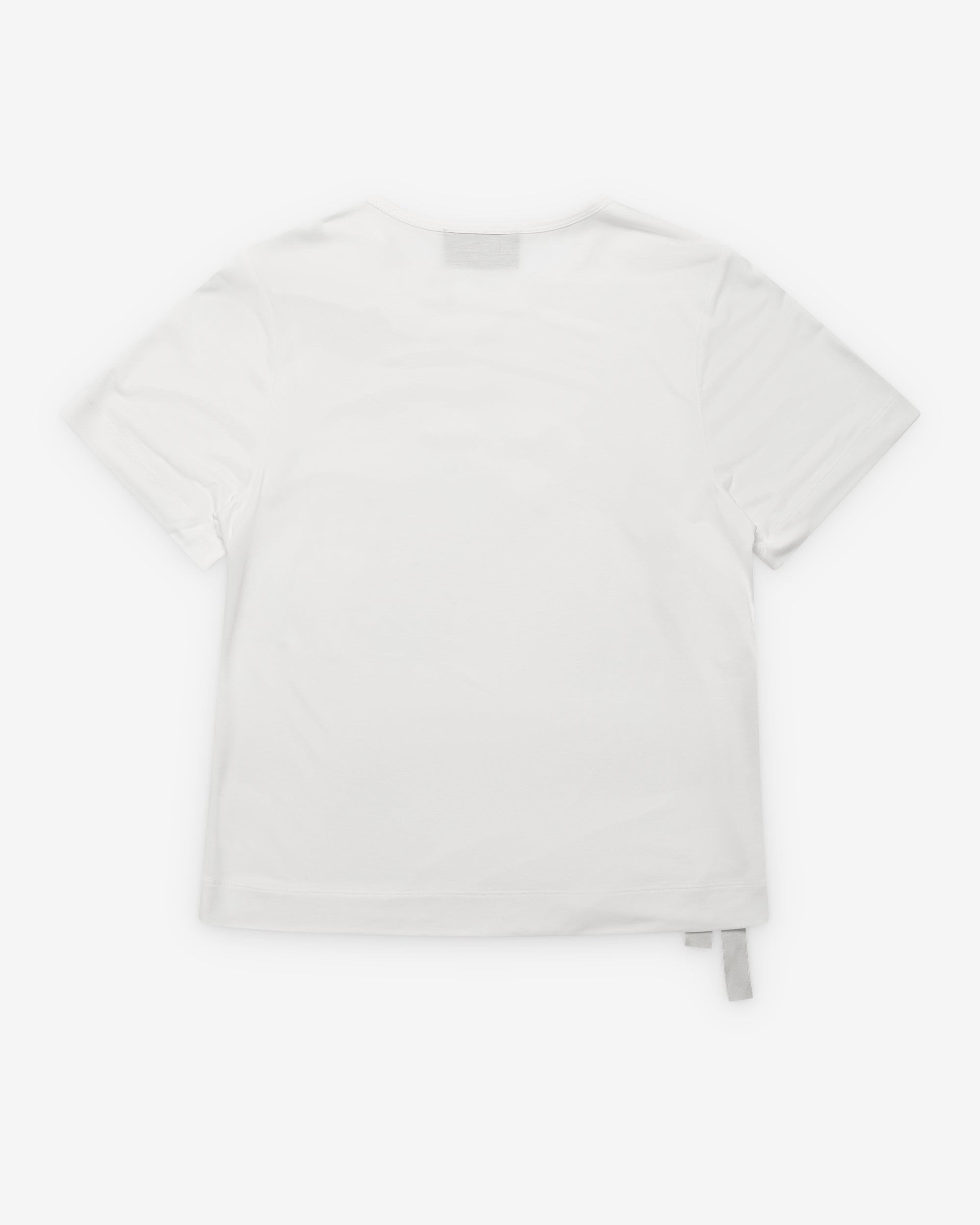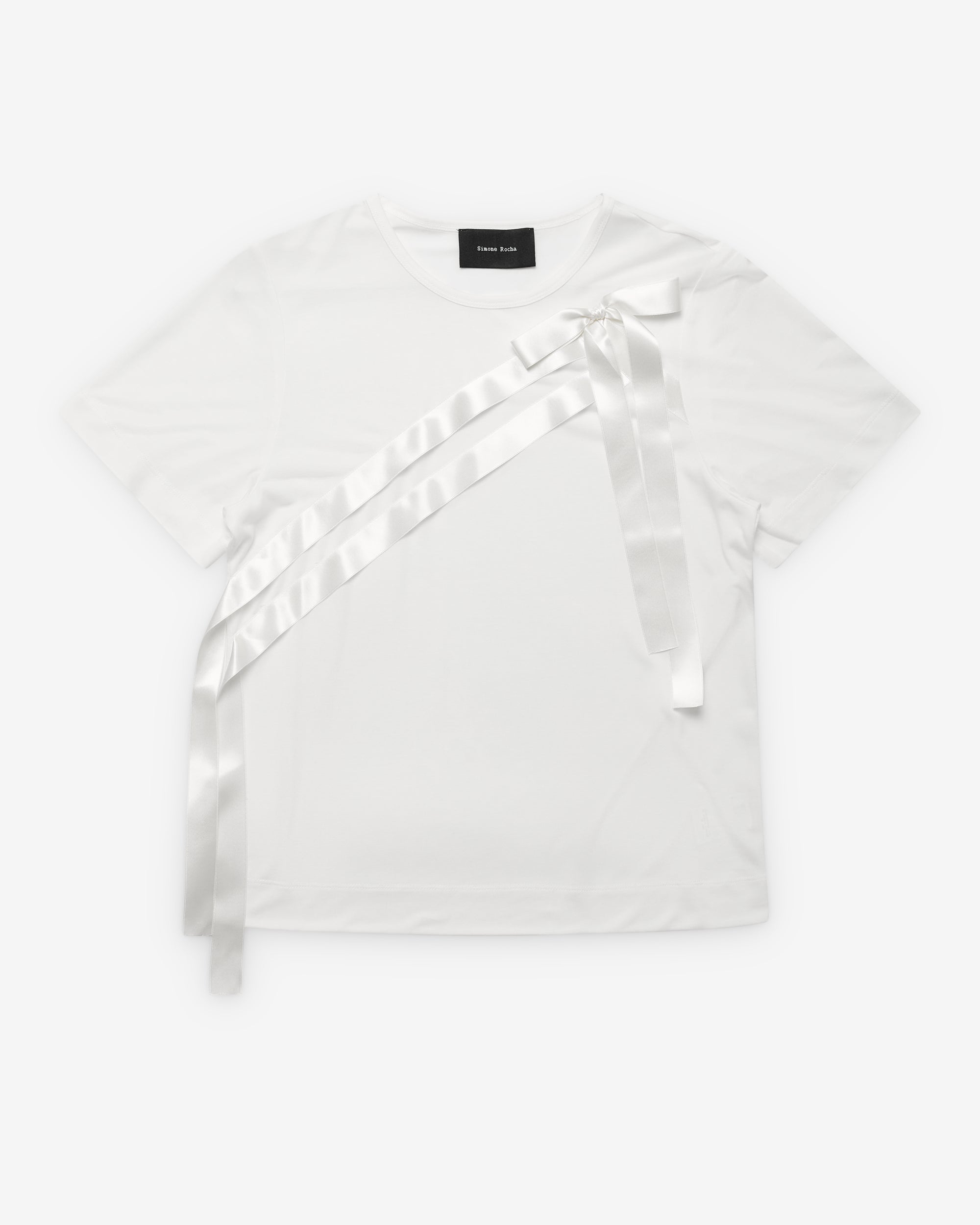 Round neckSatin bow sash detailShort sleevesStraight hem
