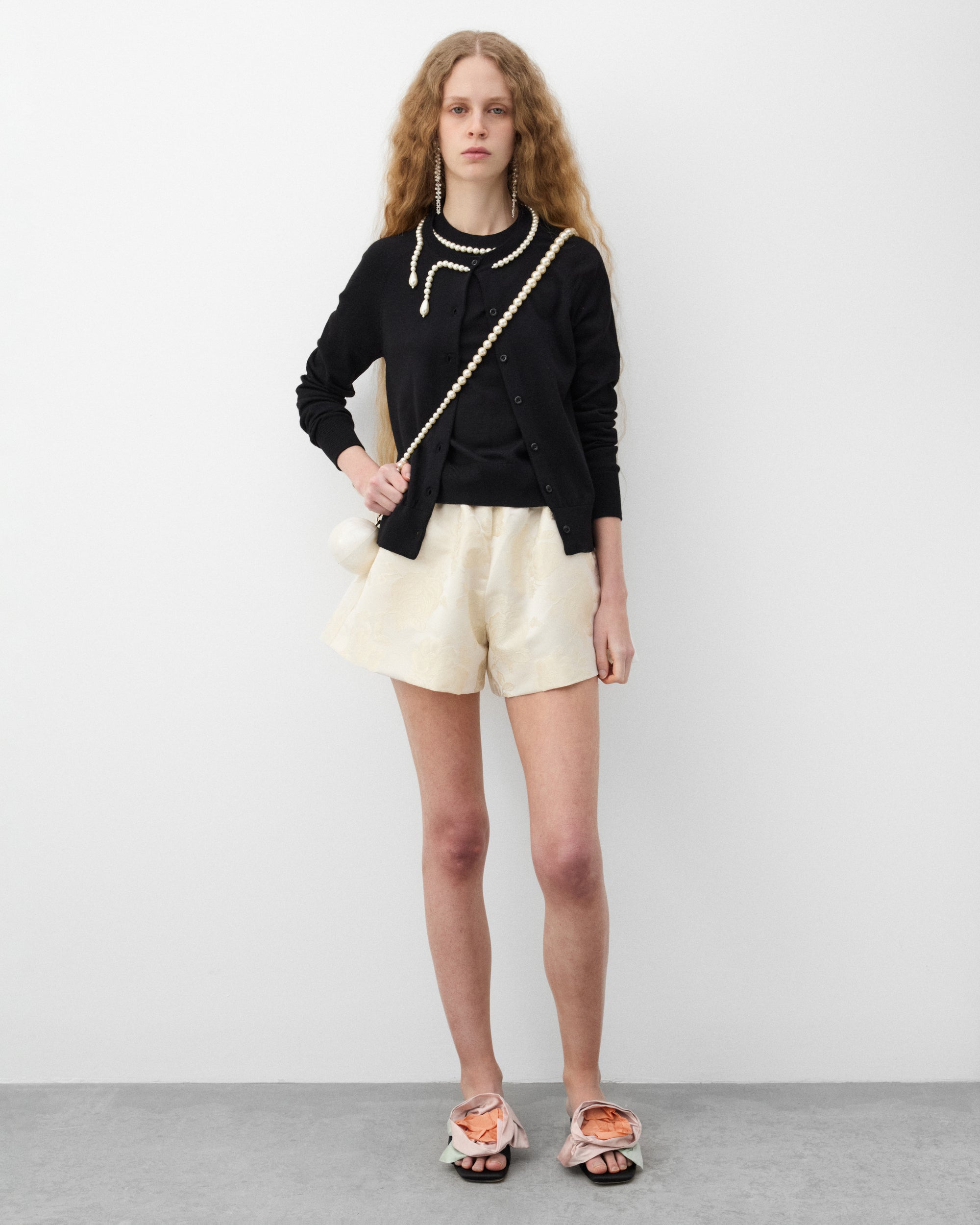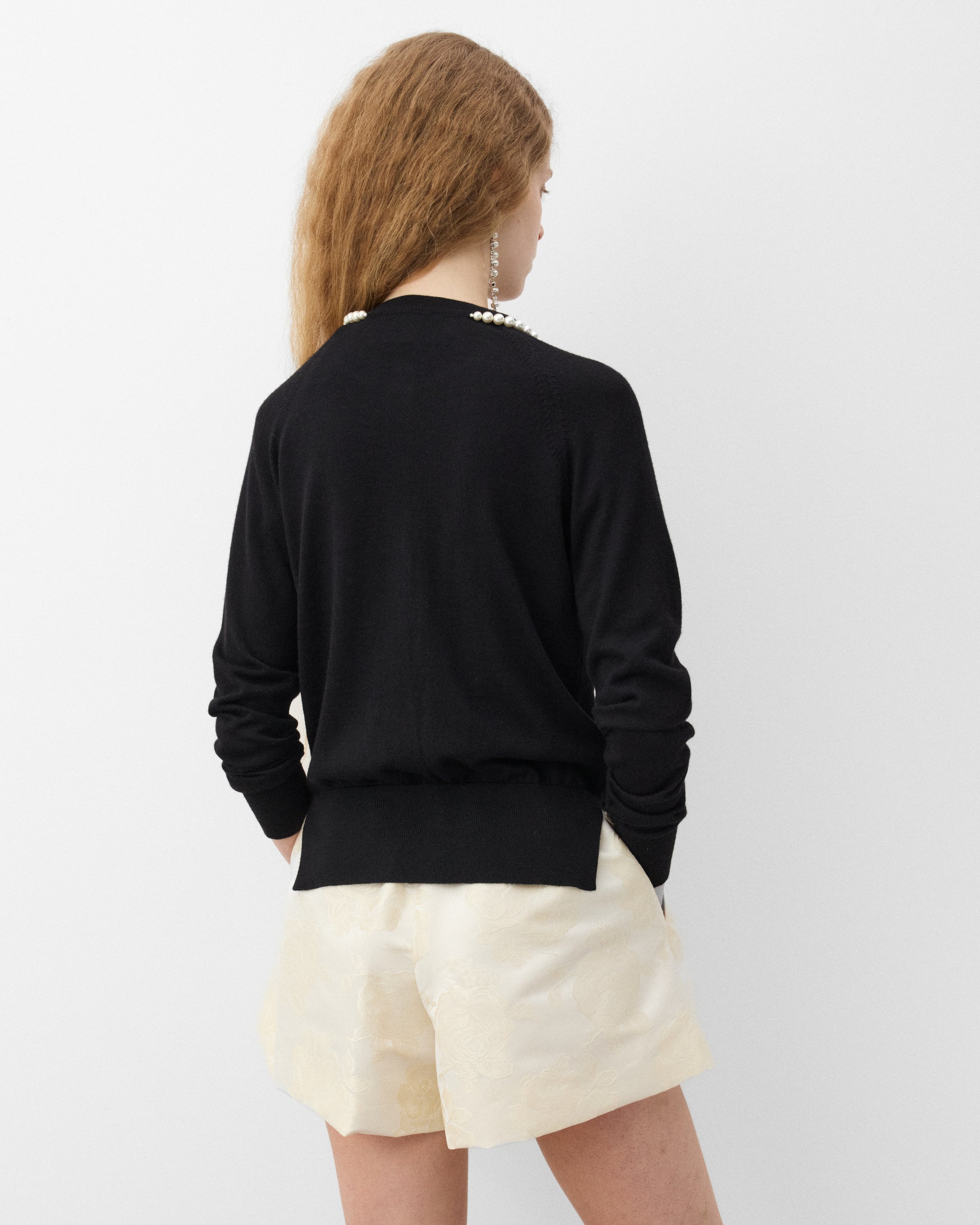 Signature faux pearl beadingFront button placketRib knit neck, hem, and cuffsLong sleevesRounded neckline