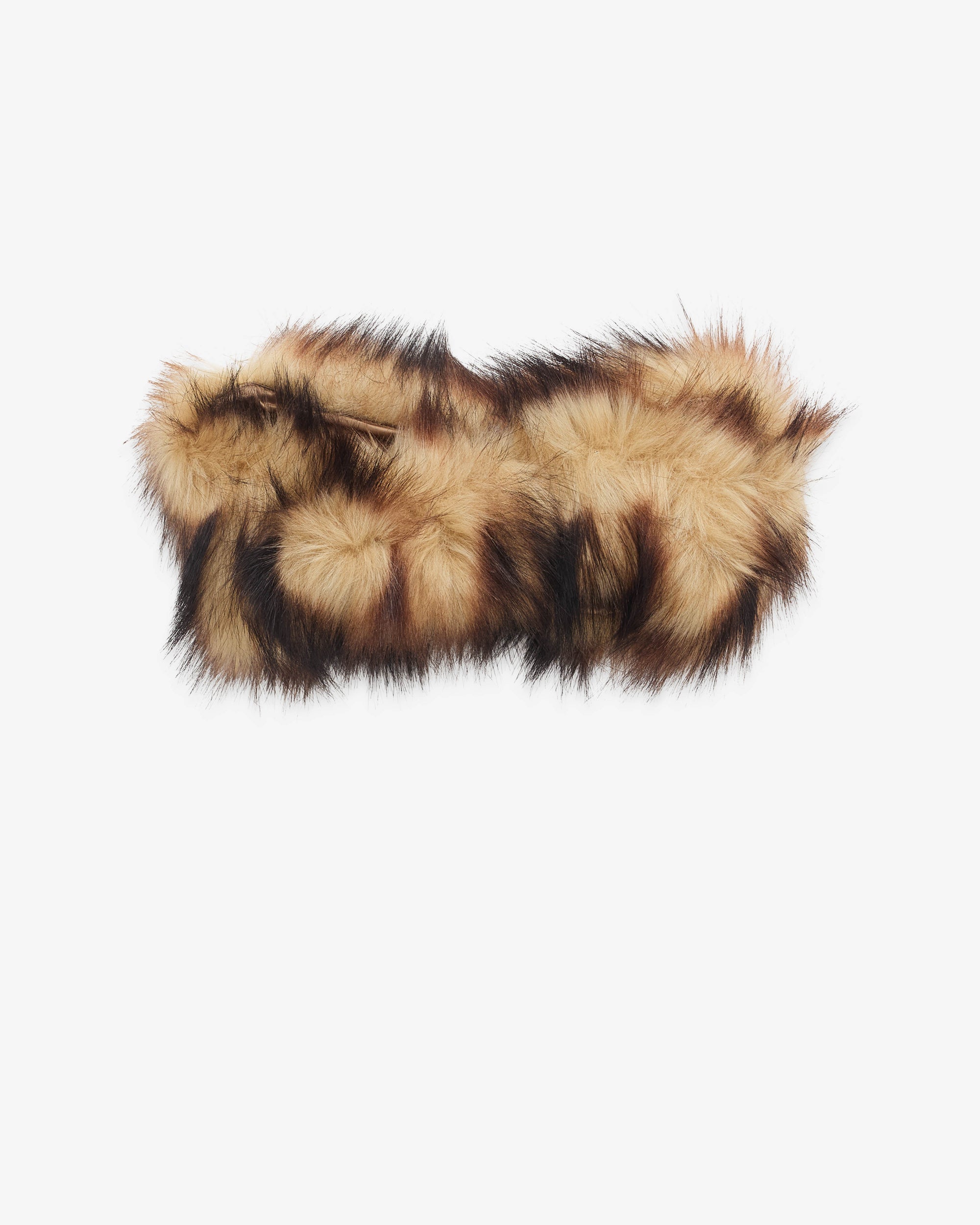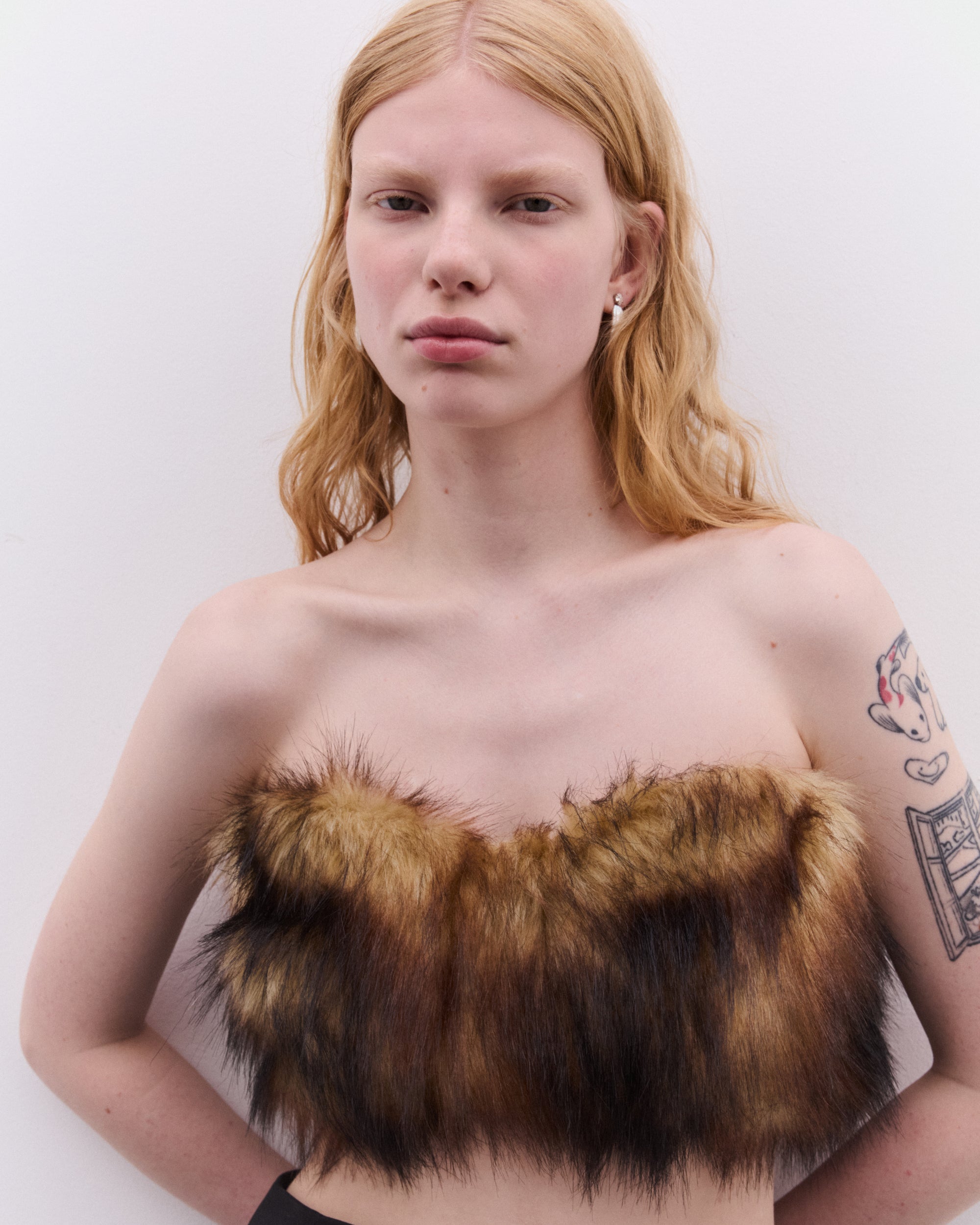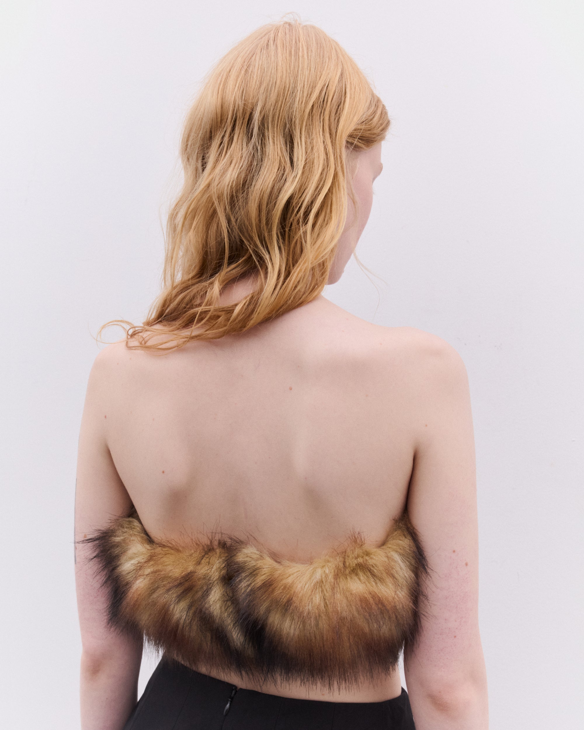 Faux fur composition throughoutSweetheart necklineAdjustable hook-eye fastening at back