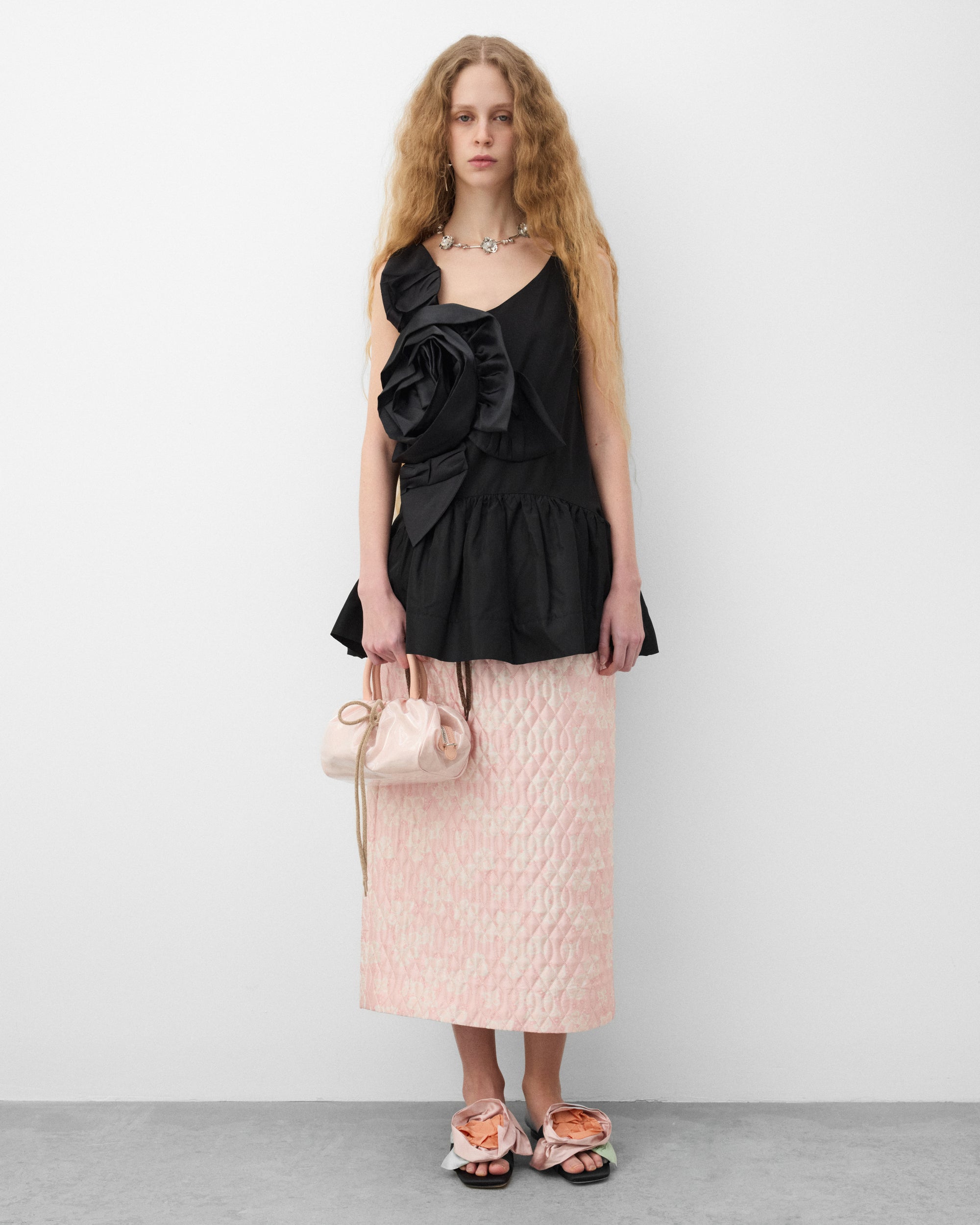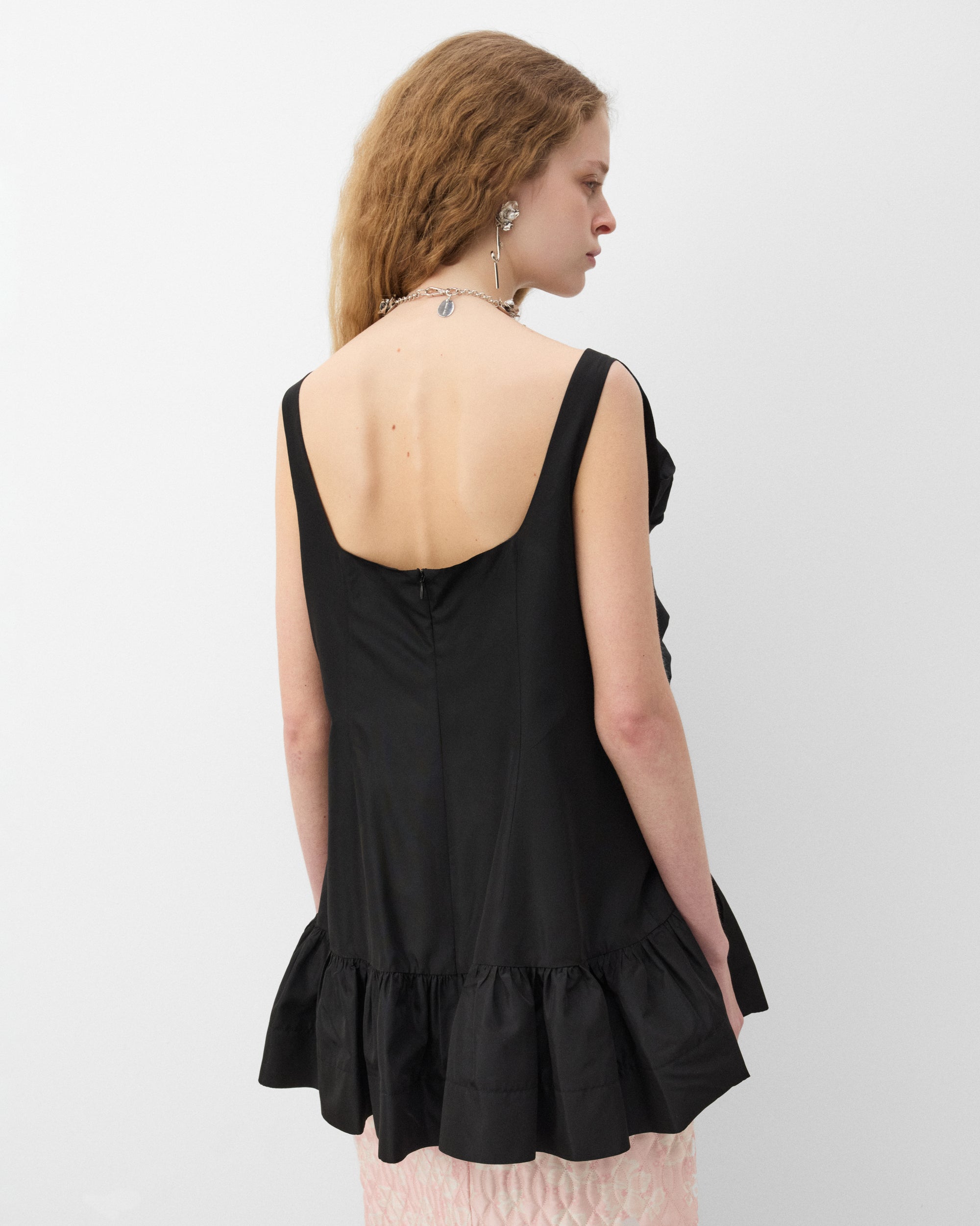 Floral appliquéAsymmetrical necklinePeplum detailBack zip closure
