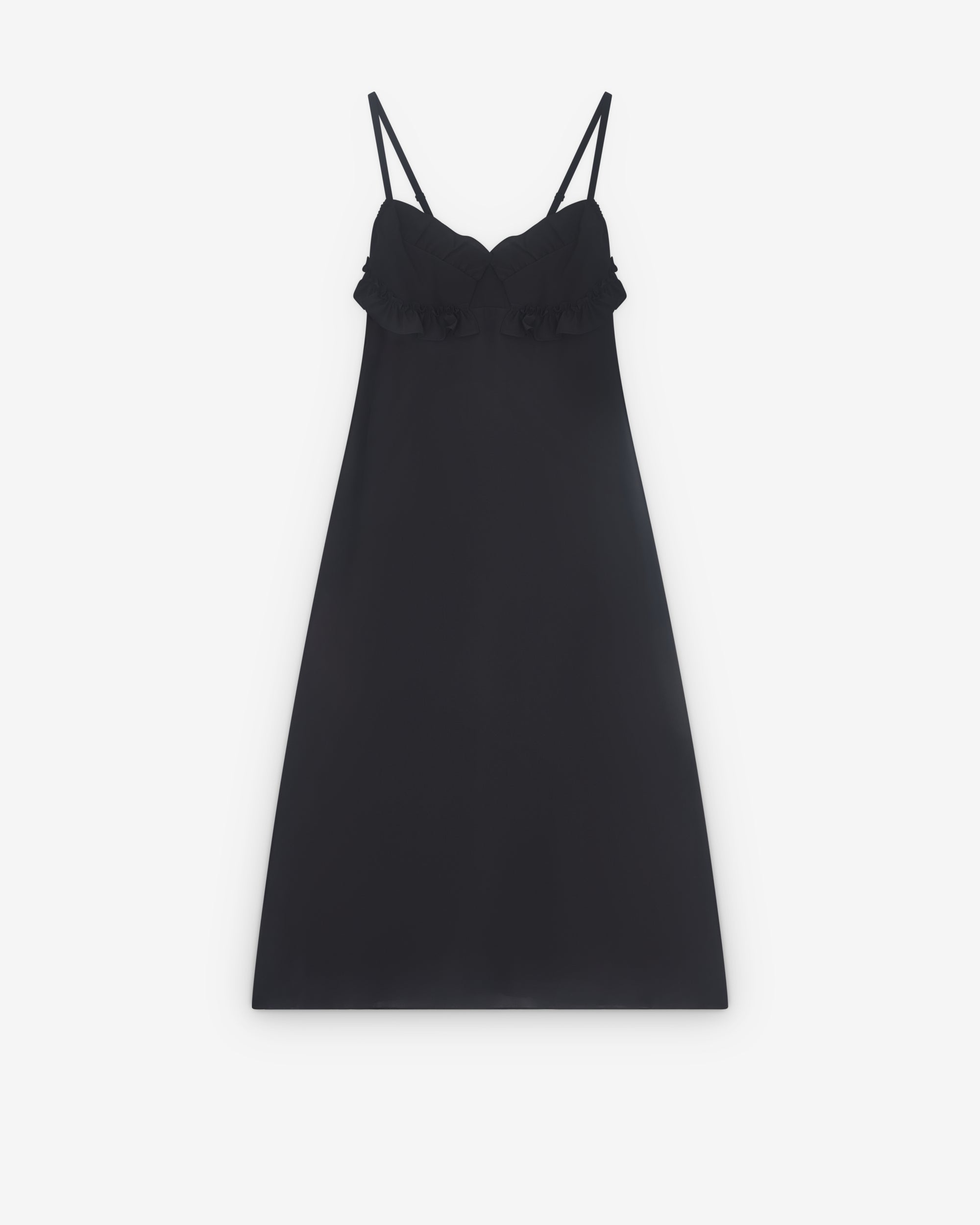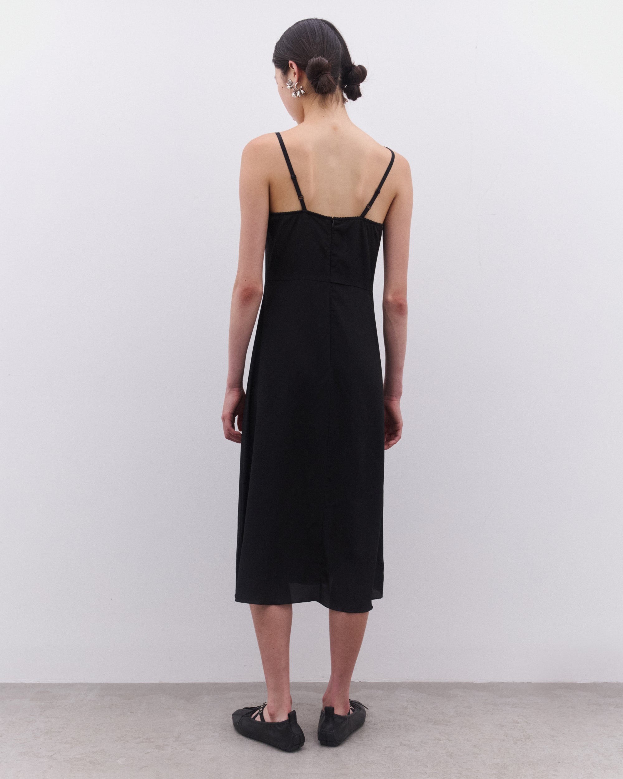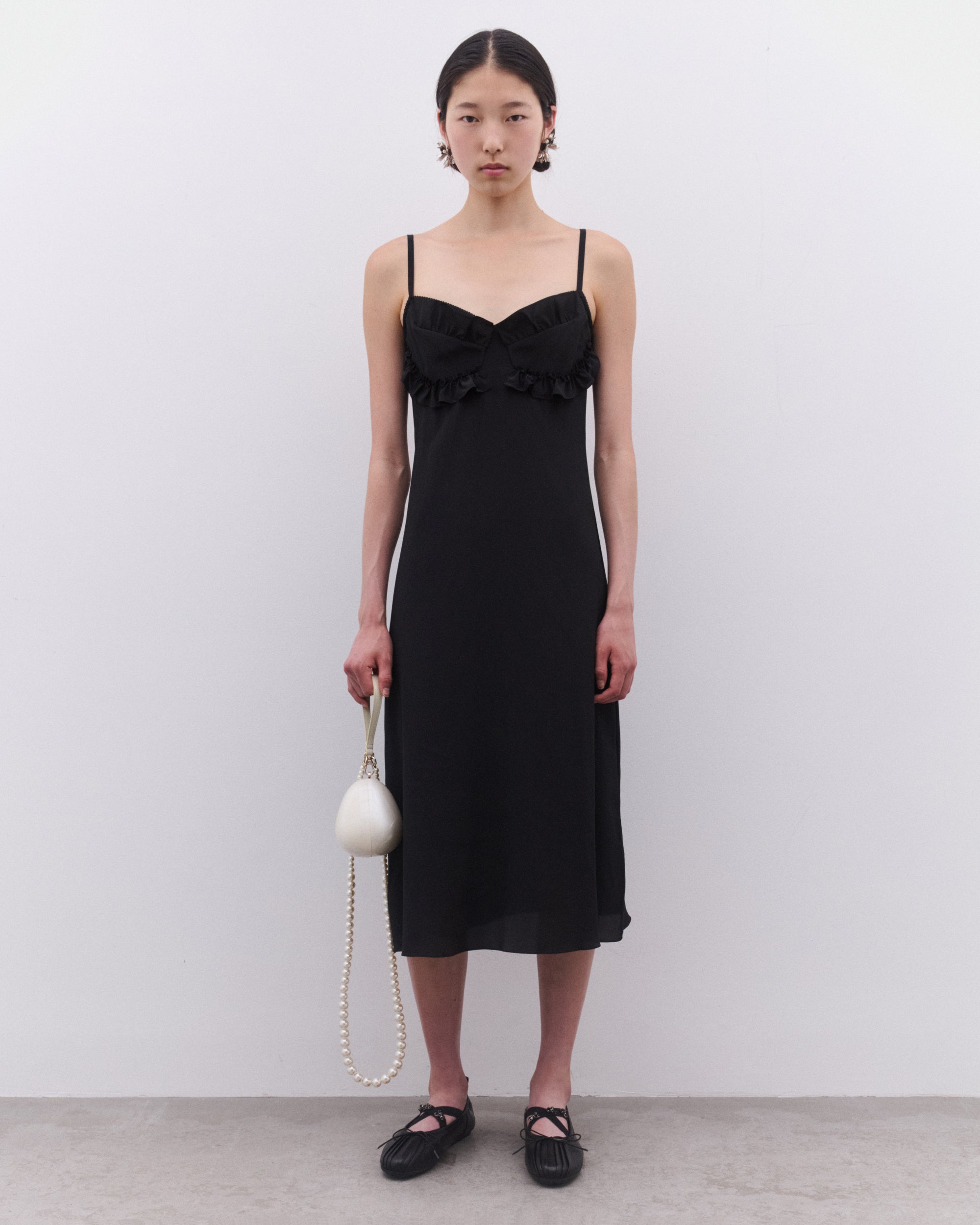Adjustable strapsRuffle detail at bustA-line silhouetteMid lengthStraight hem