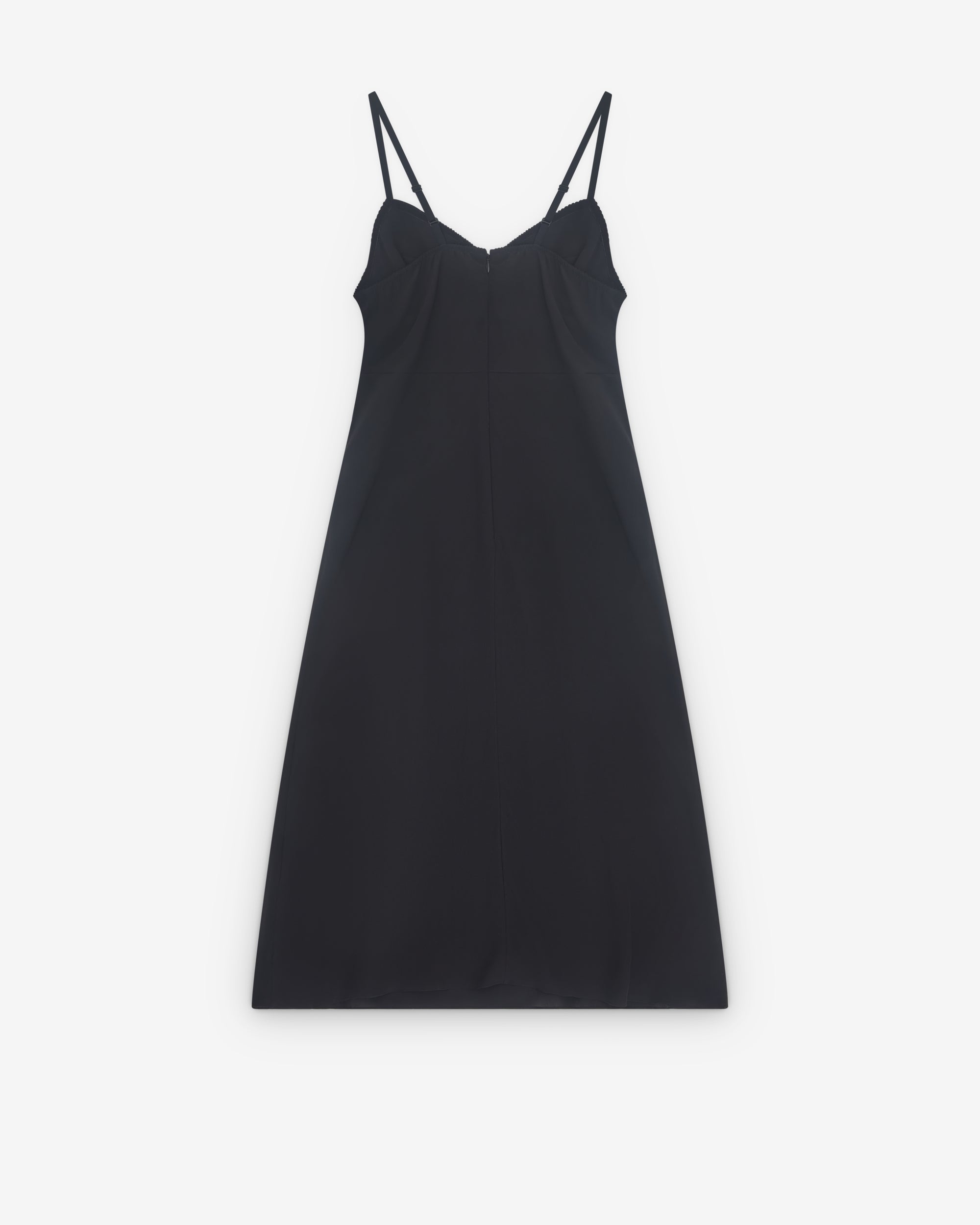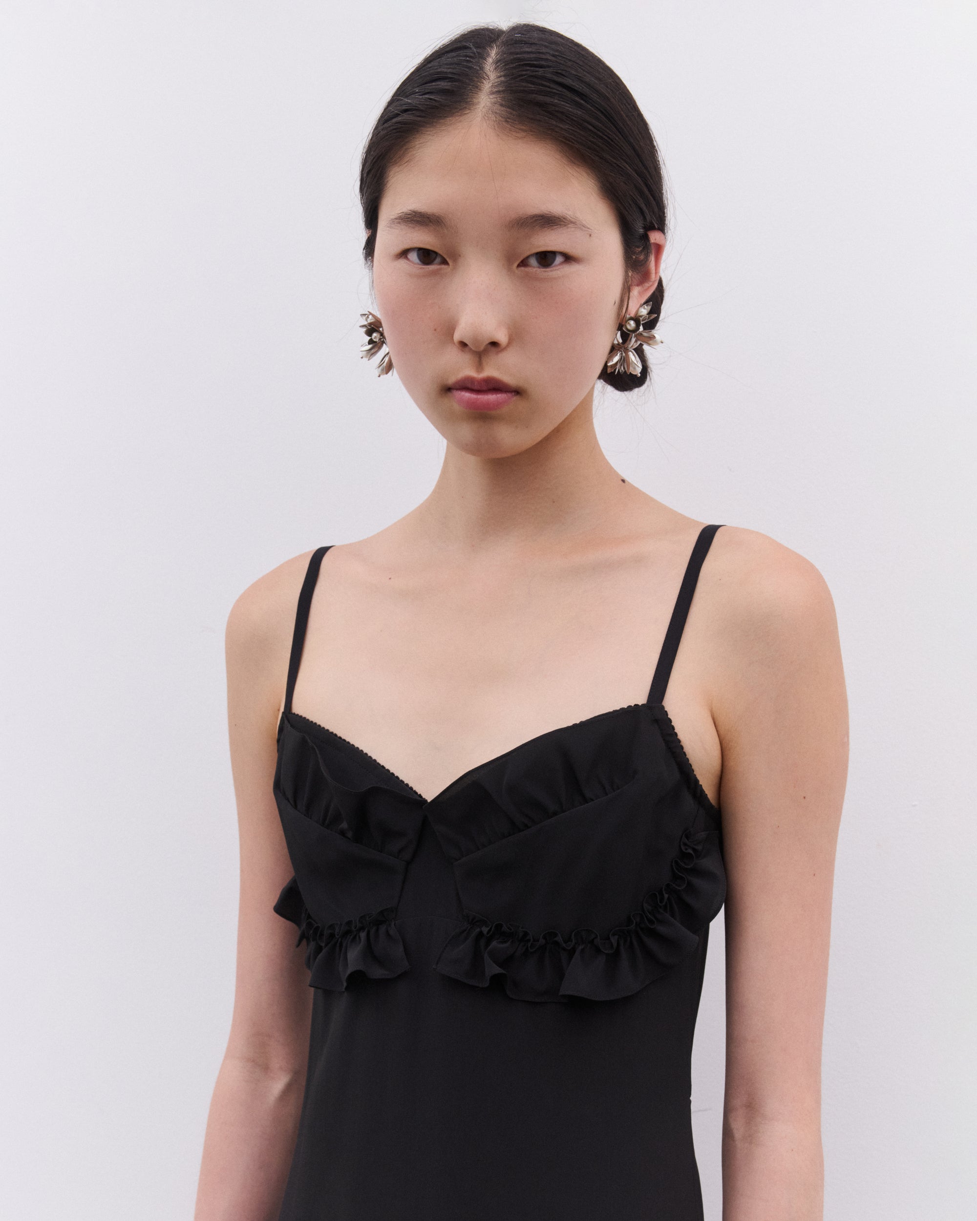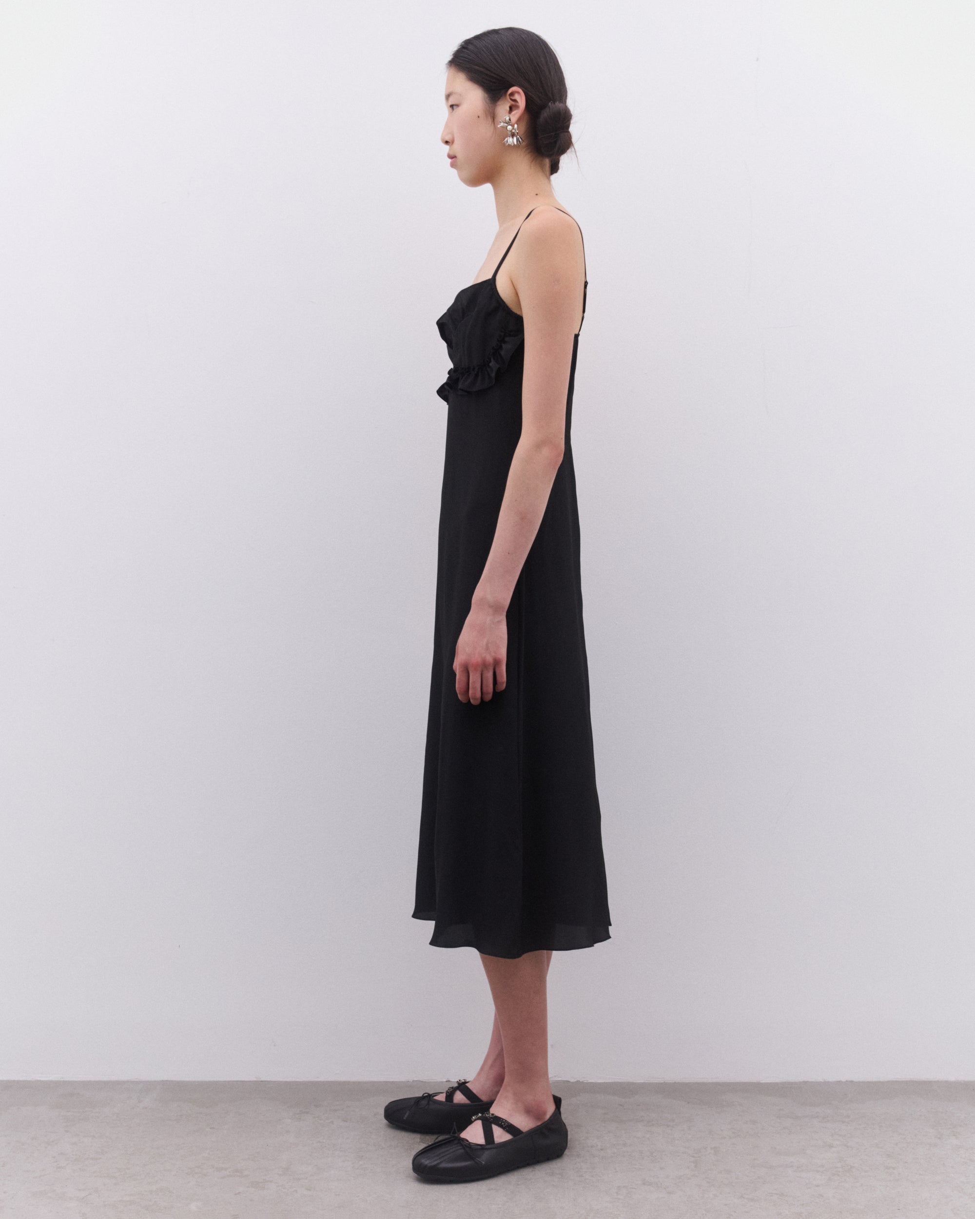 Adjustable strapsRuffle detail at bustA-line silhouetteMid lengthStraight hem