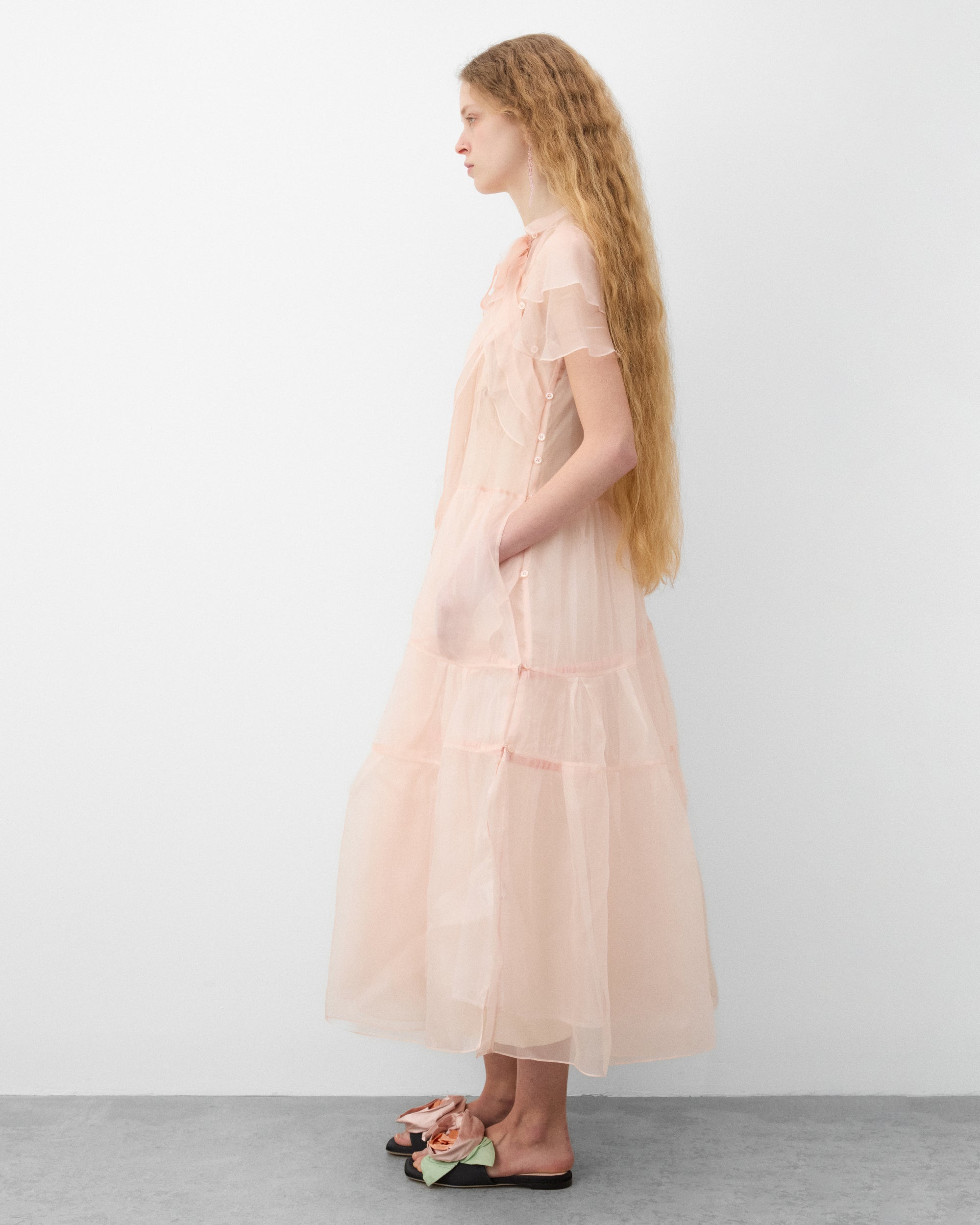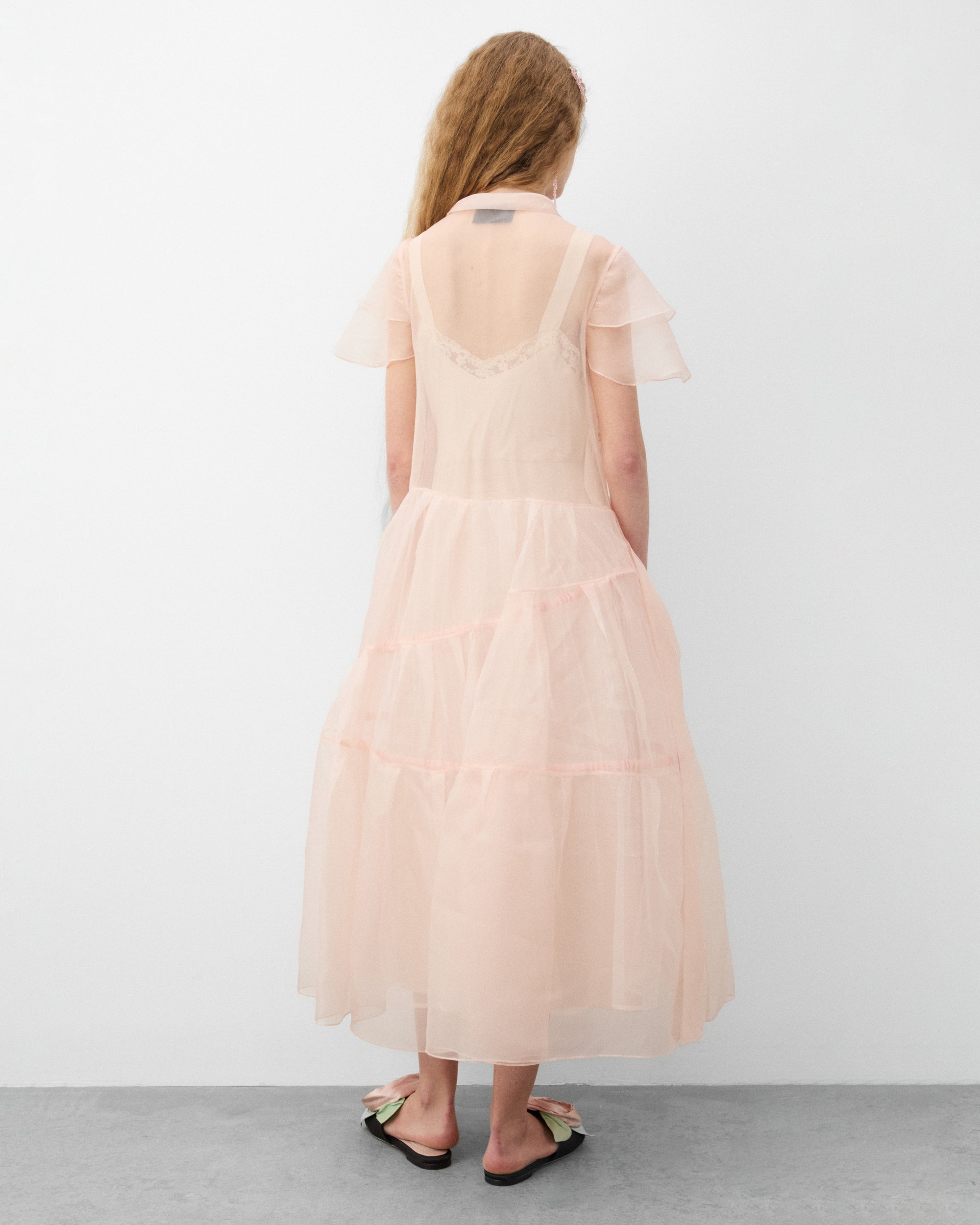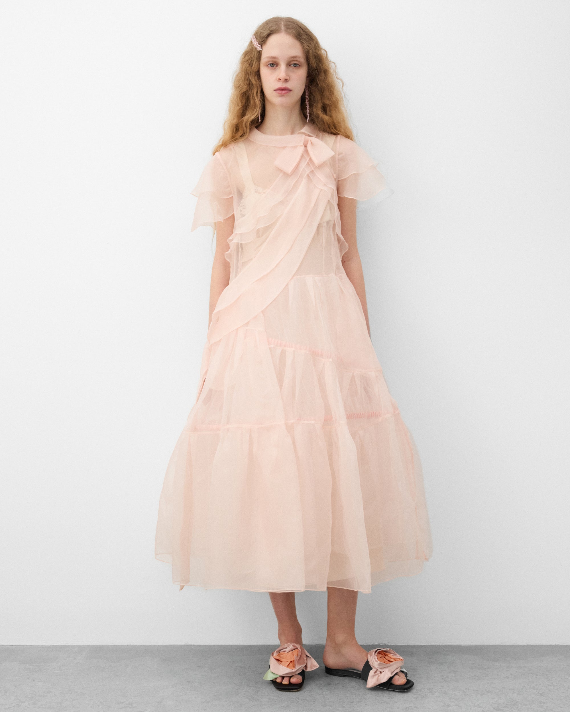 Sheer upper fabricLayered tulle skirtShort sleevesRounded necklineMidi lengthFront button sash