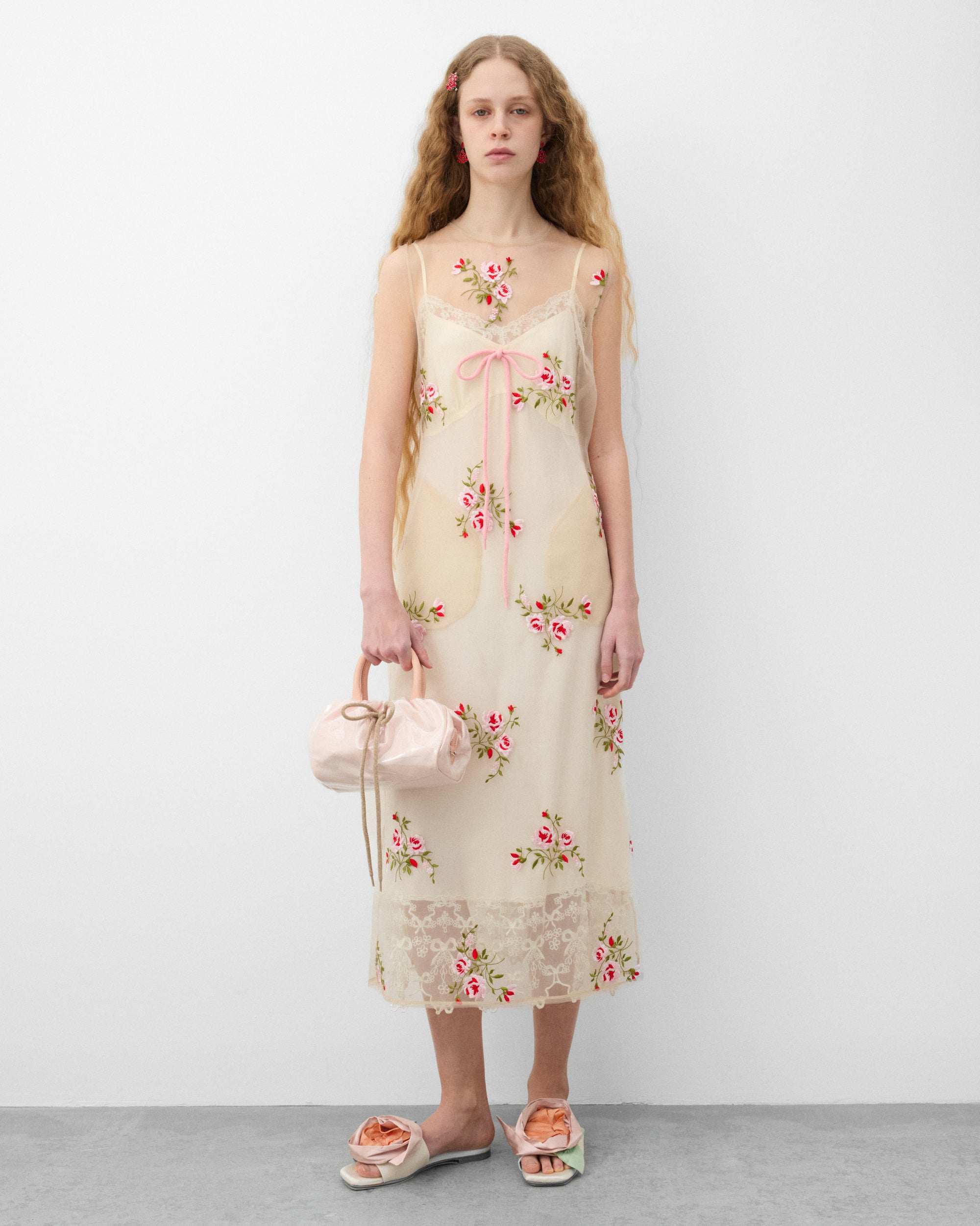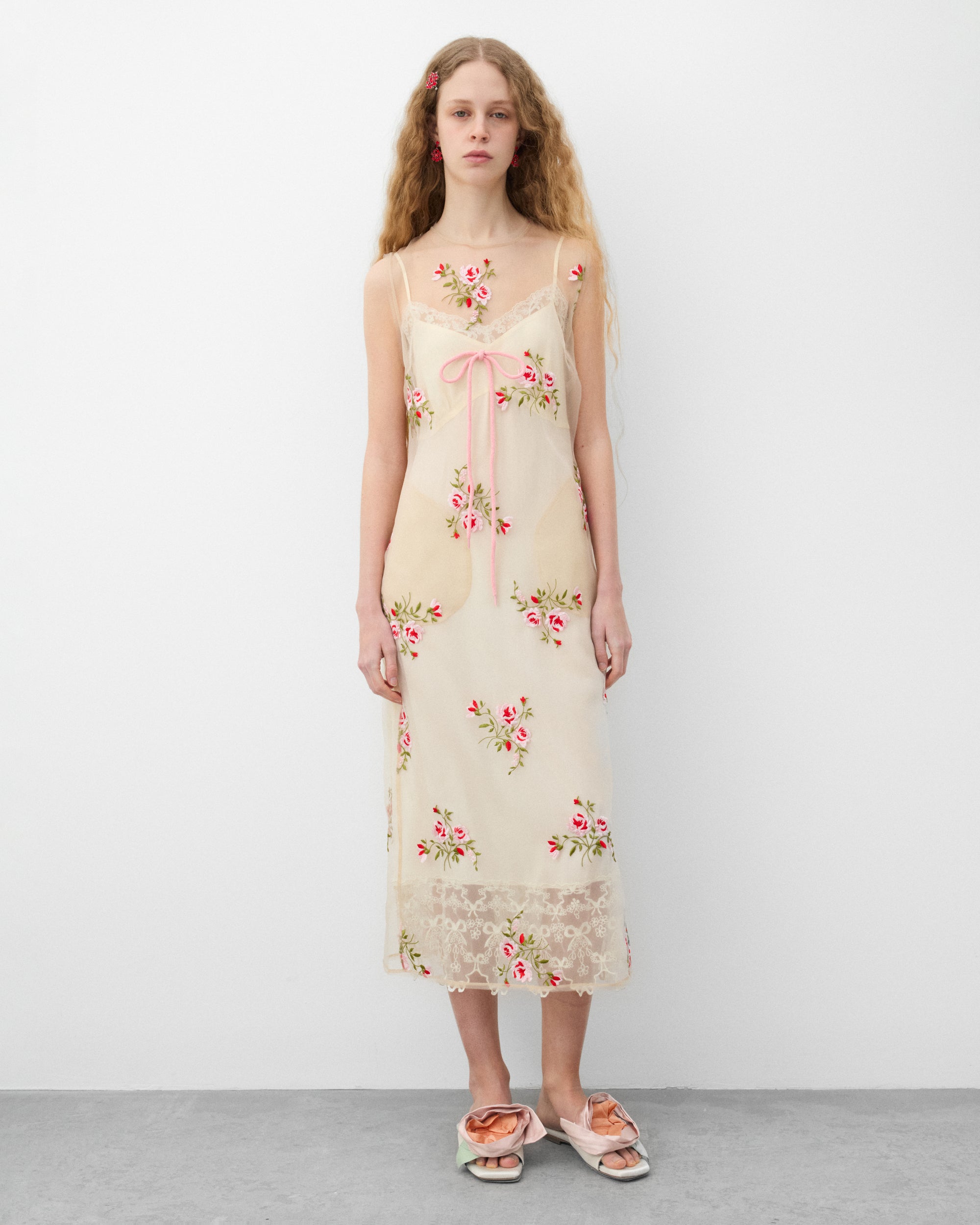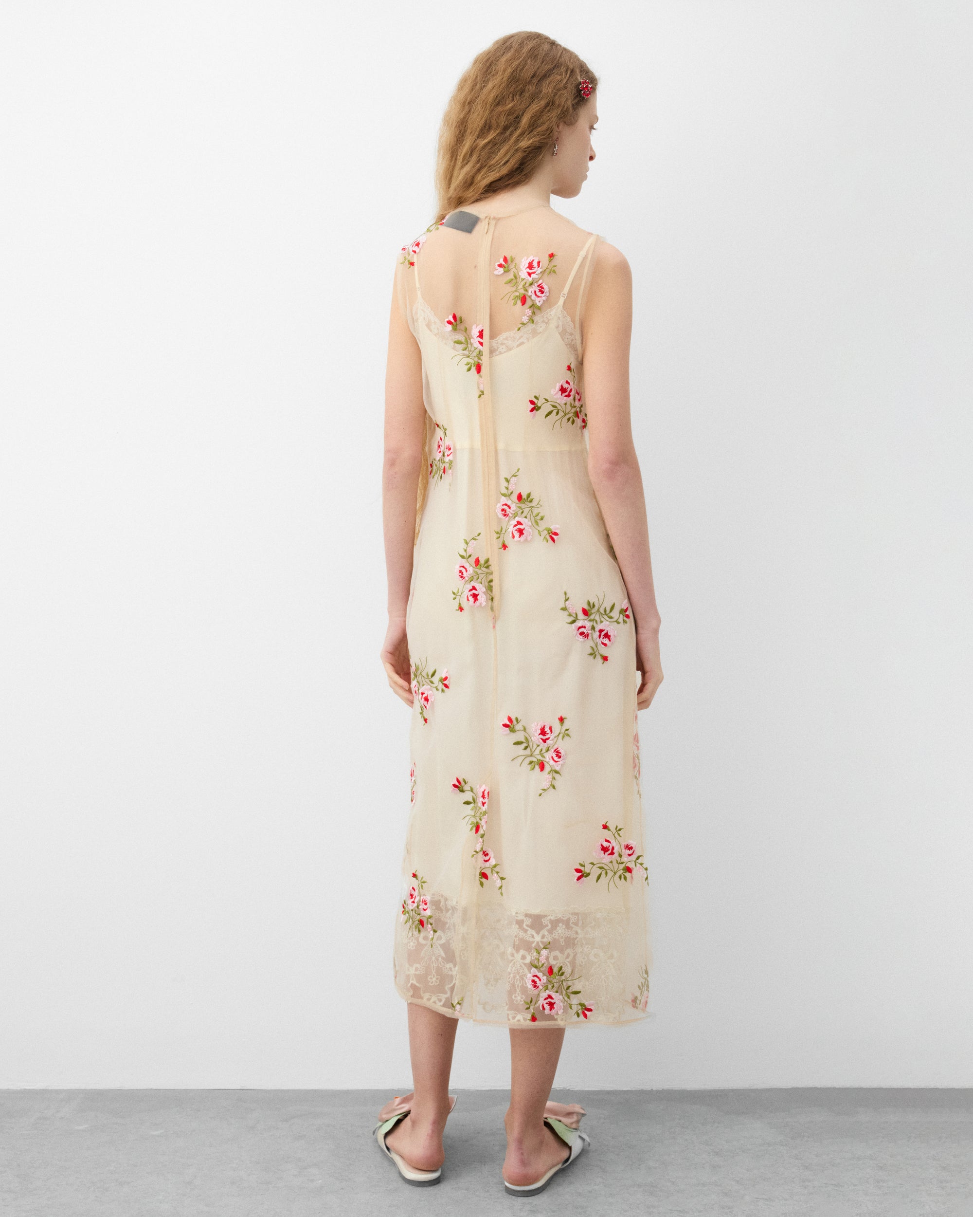 Sheer organza dressFloral embroideryZip back closureVent at back hemDarts at bustMidi length