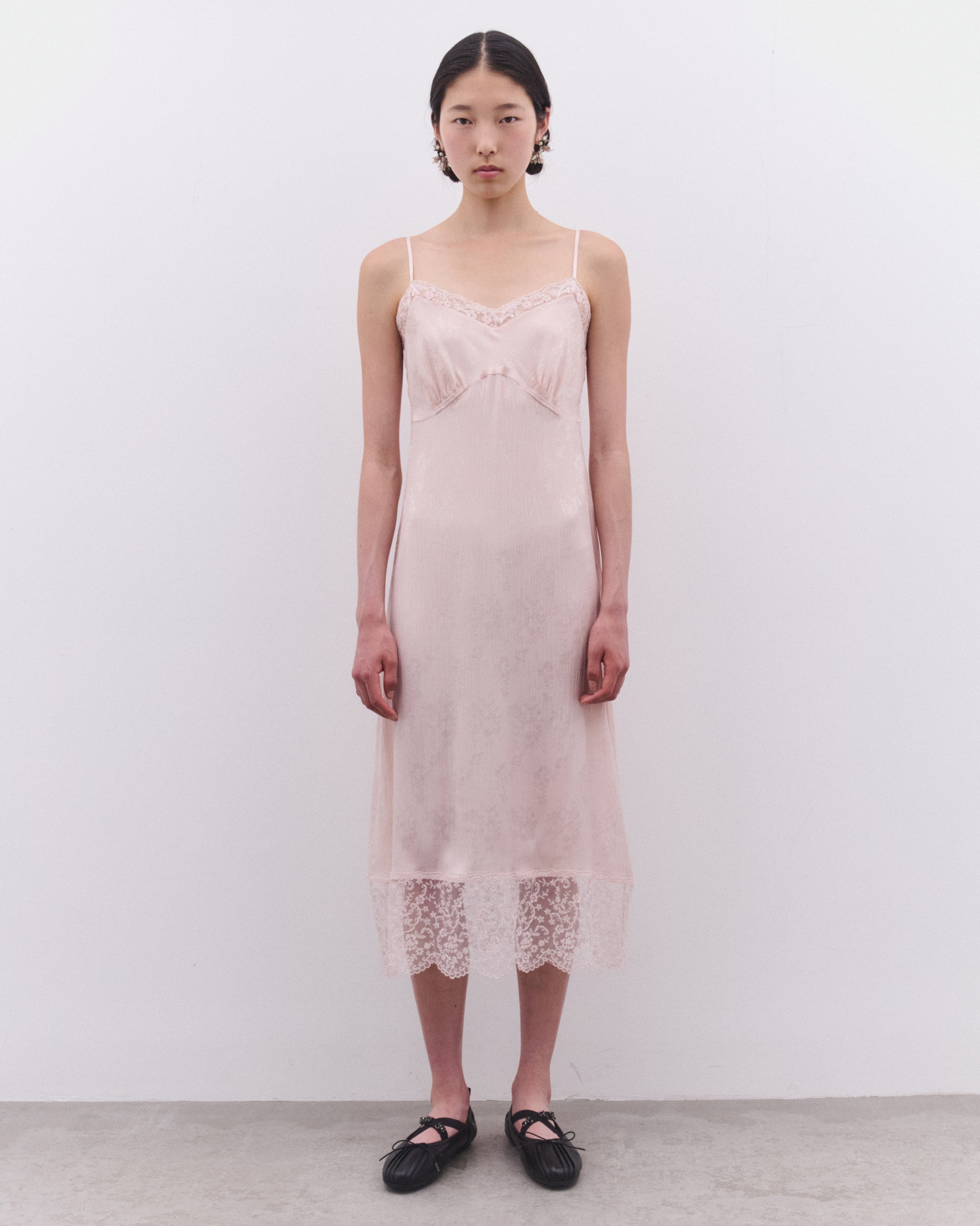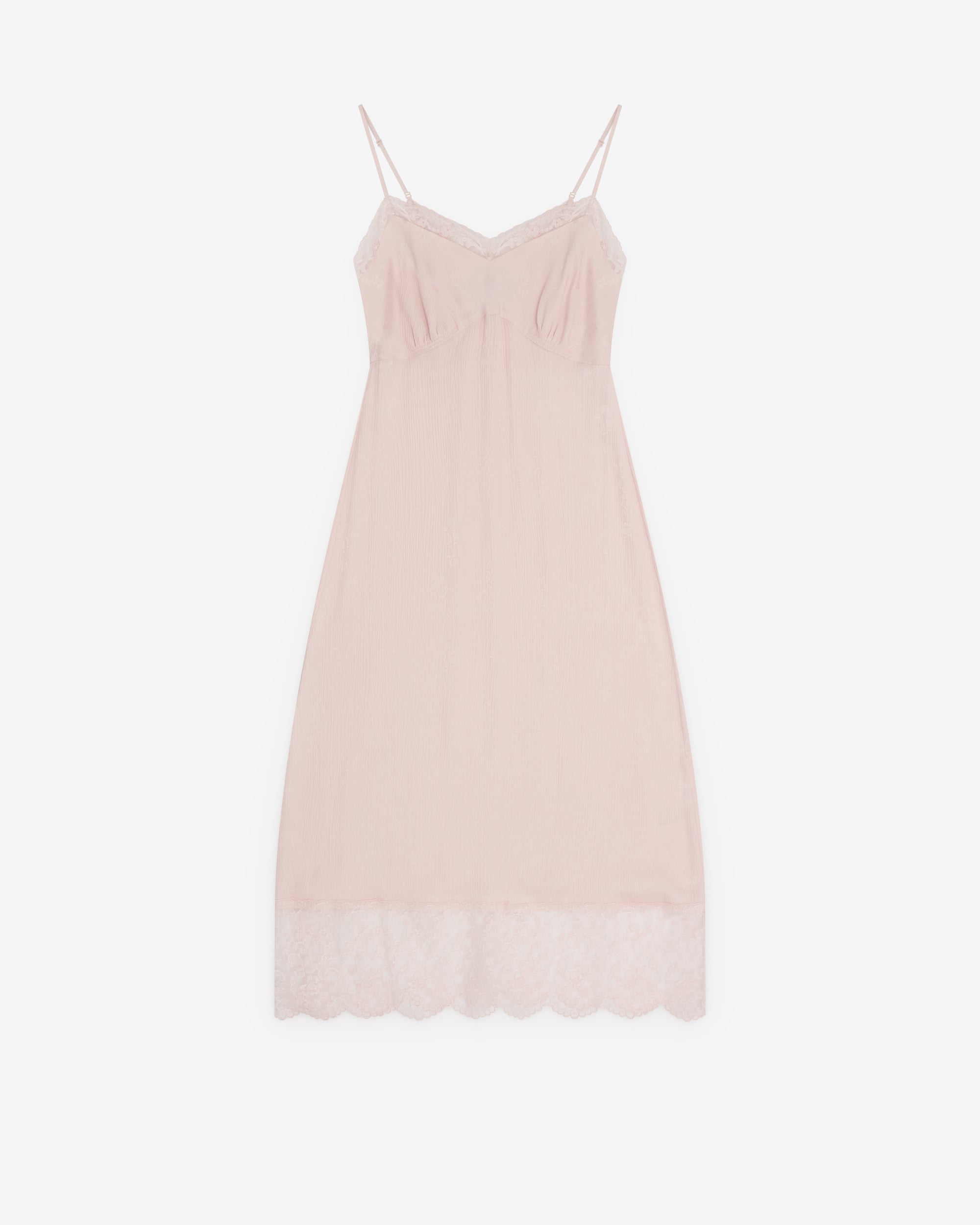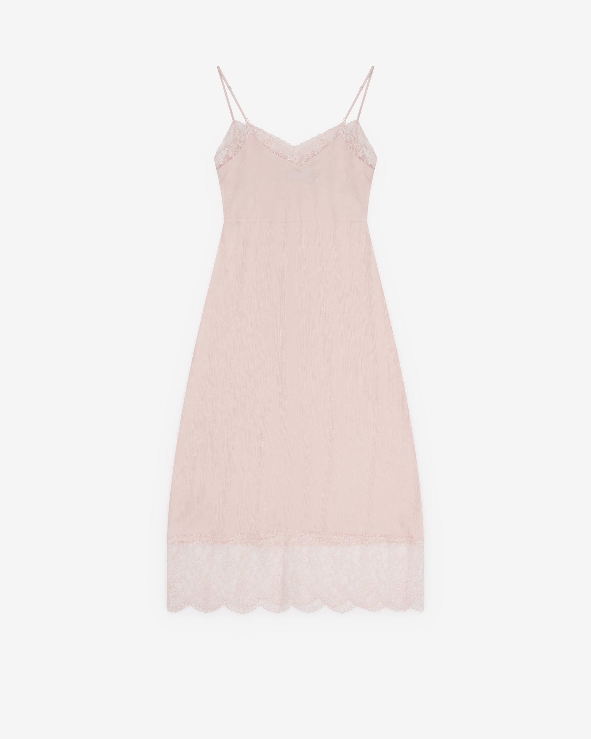 Slim strapsLace trim at neckline and hemEmpire waistline with gathering at bustA-line silhouetteMid-length