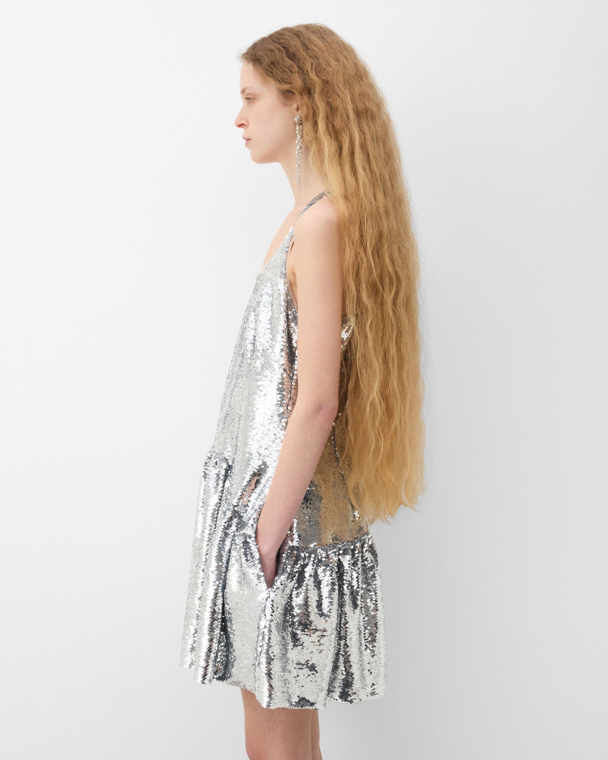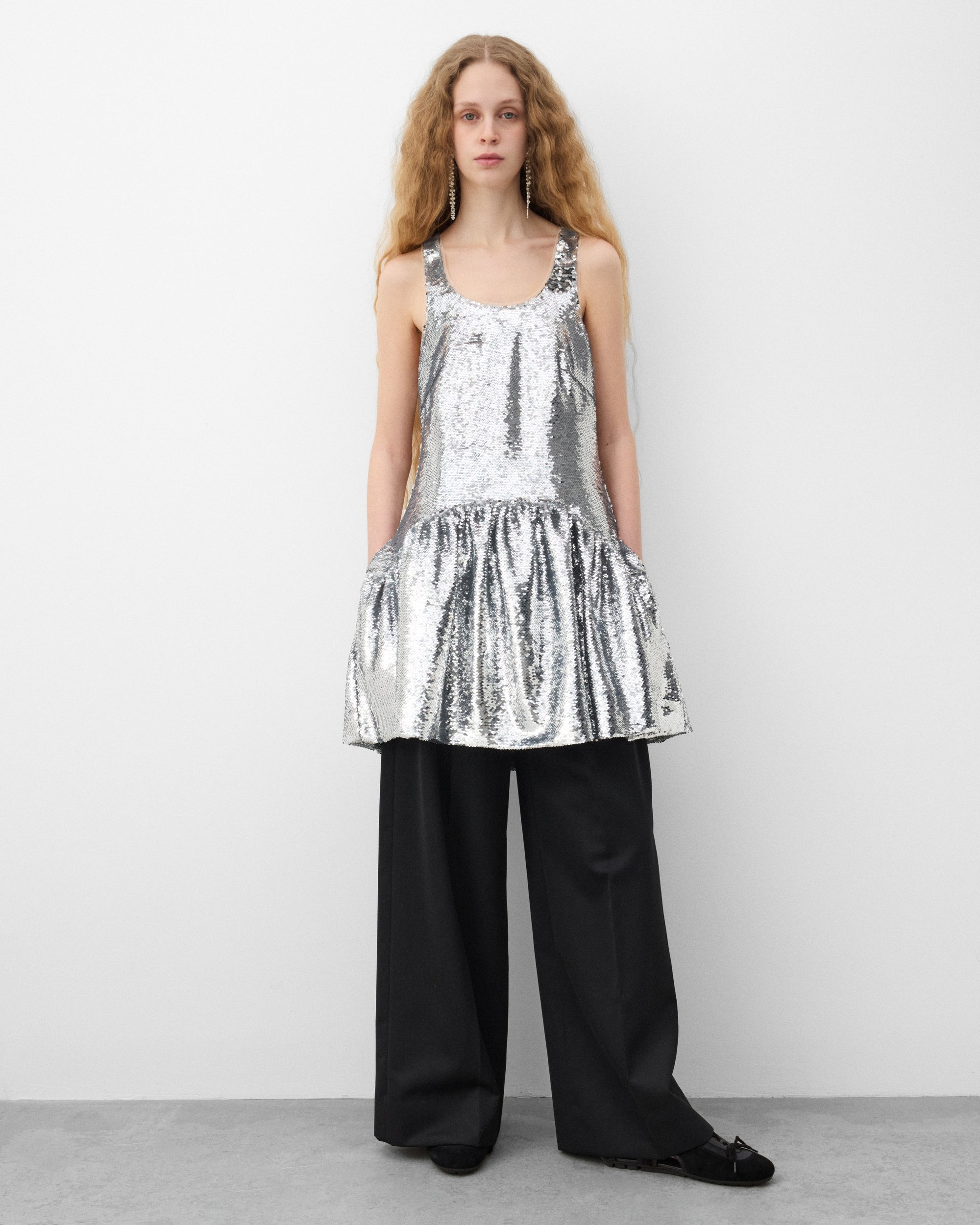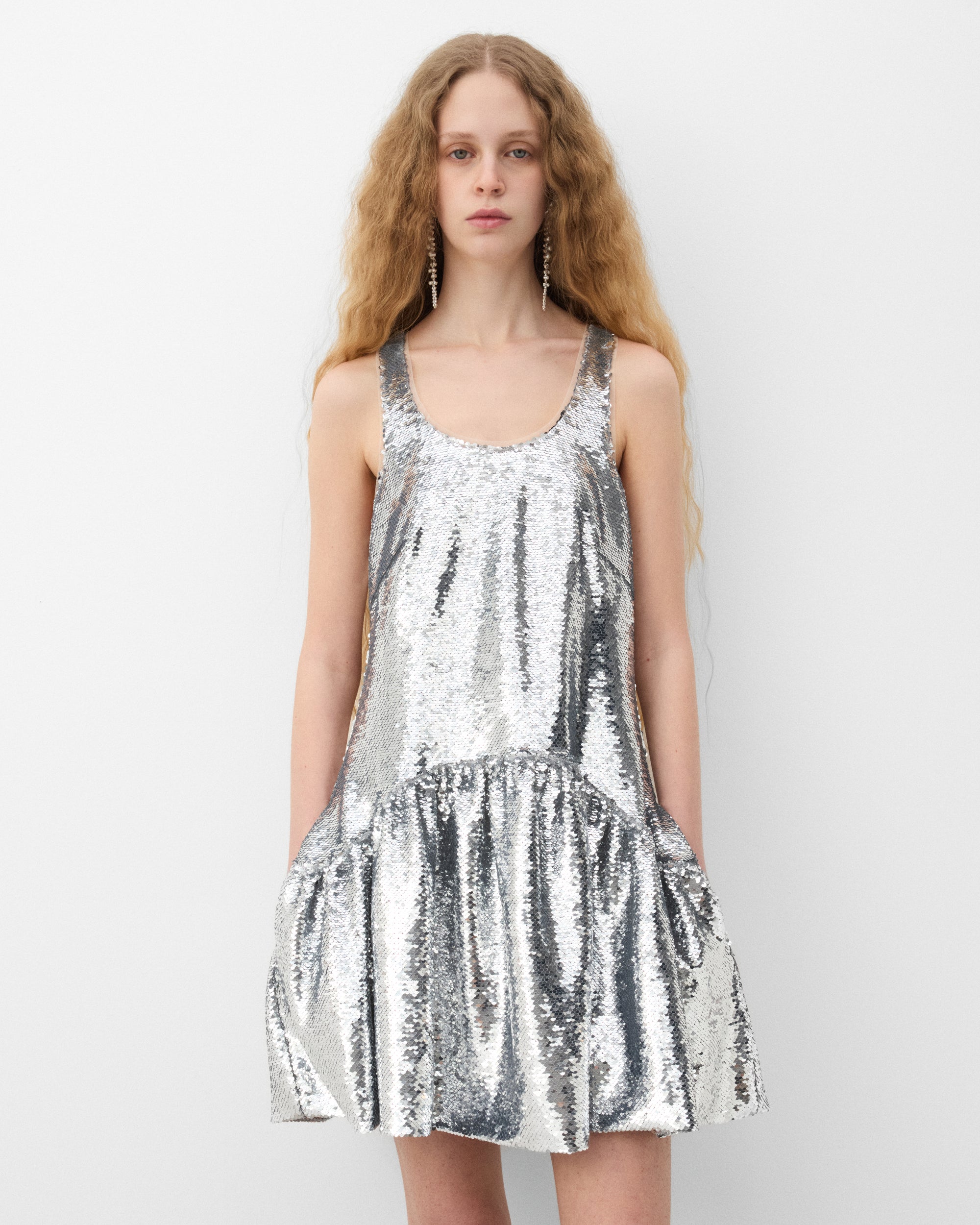 Scoop necklineSleeveless Sequin fabricInternal liningRuffled skirtBack zip closure