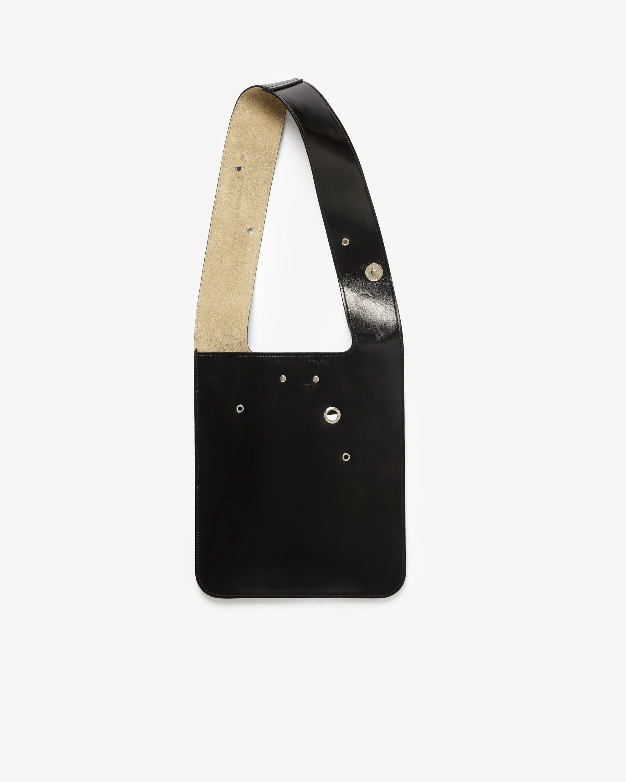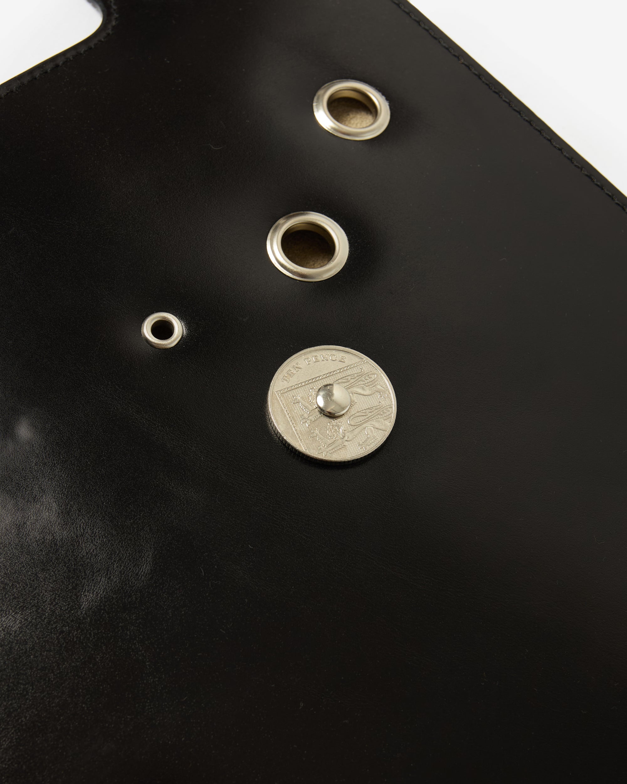 Shiny worn calf leatherBonded suede lining2 riveted sterling coins9 eyeletsUnfastened openingHand madeHeight: 24.5cmWidth: 21cmDrop: 25cm