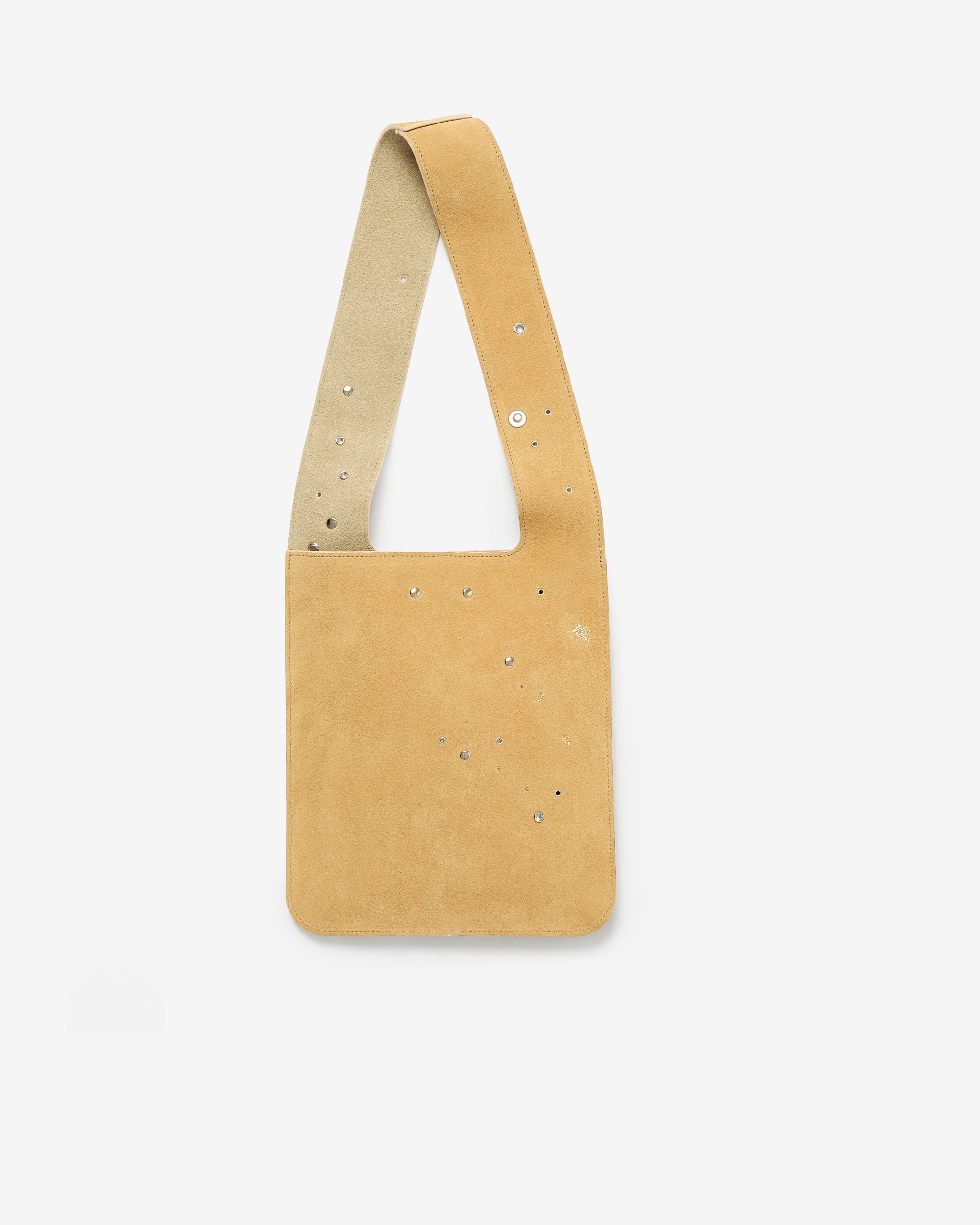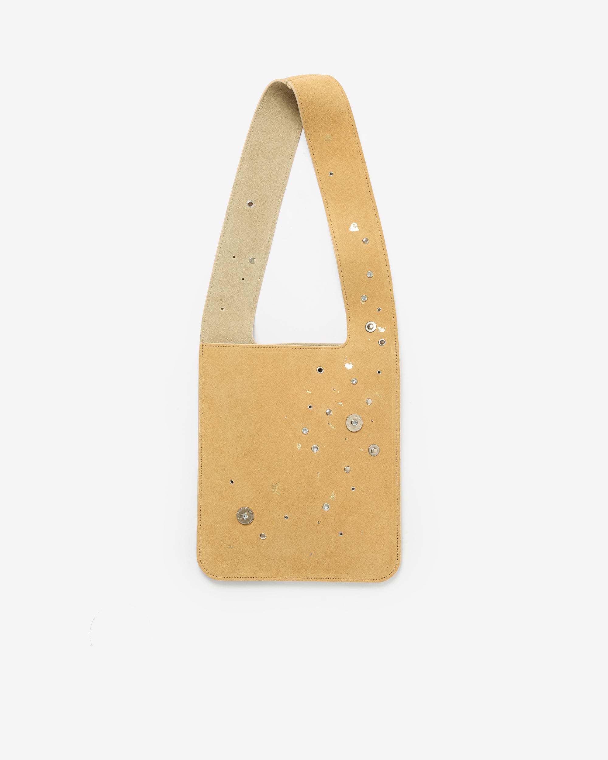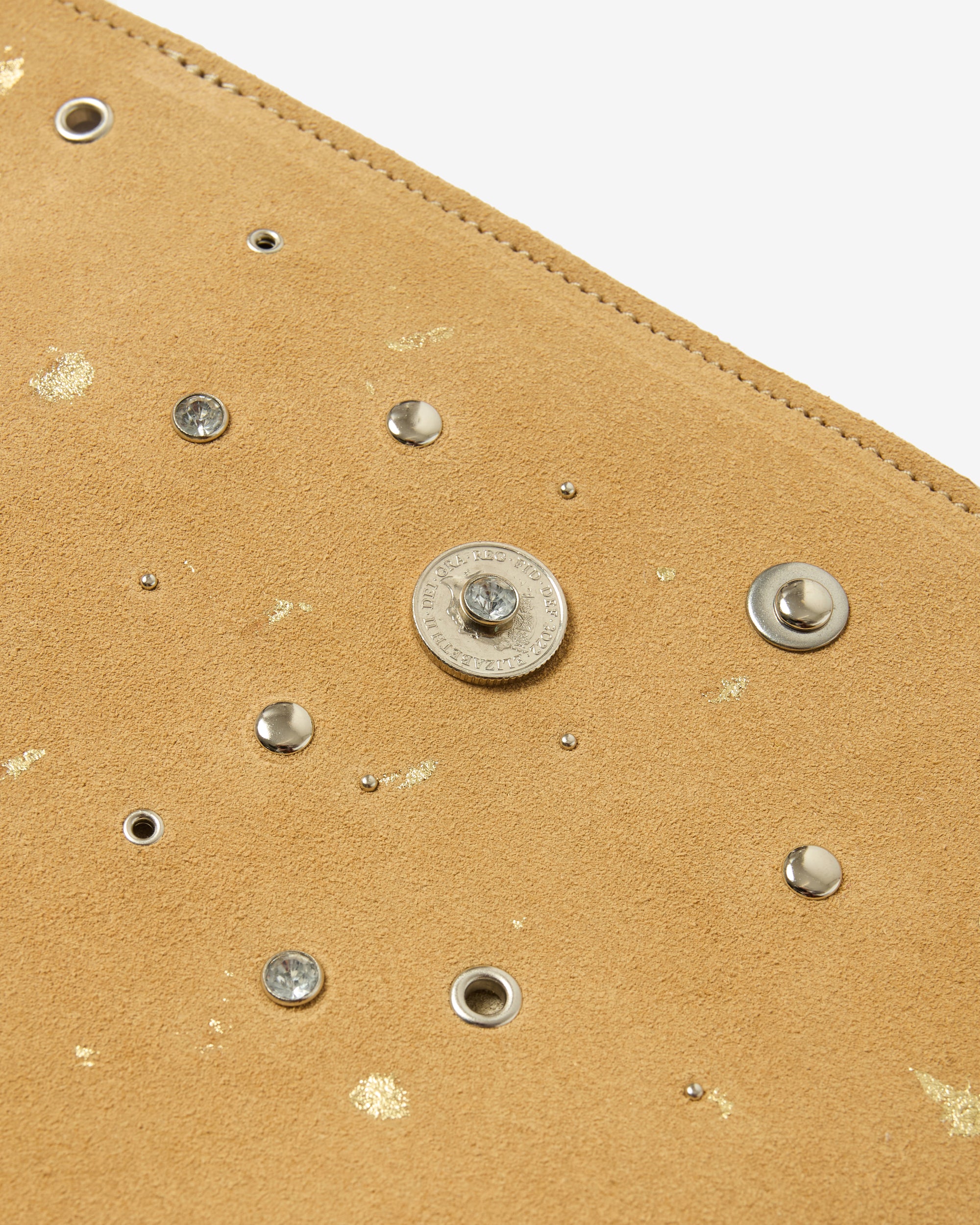 Sand suede Hand foiledScattered crystal and metal studsBonded suede liningUnfastened openingHand madeHeight: 24.5cmWidth: 21cmDrop: 25cm