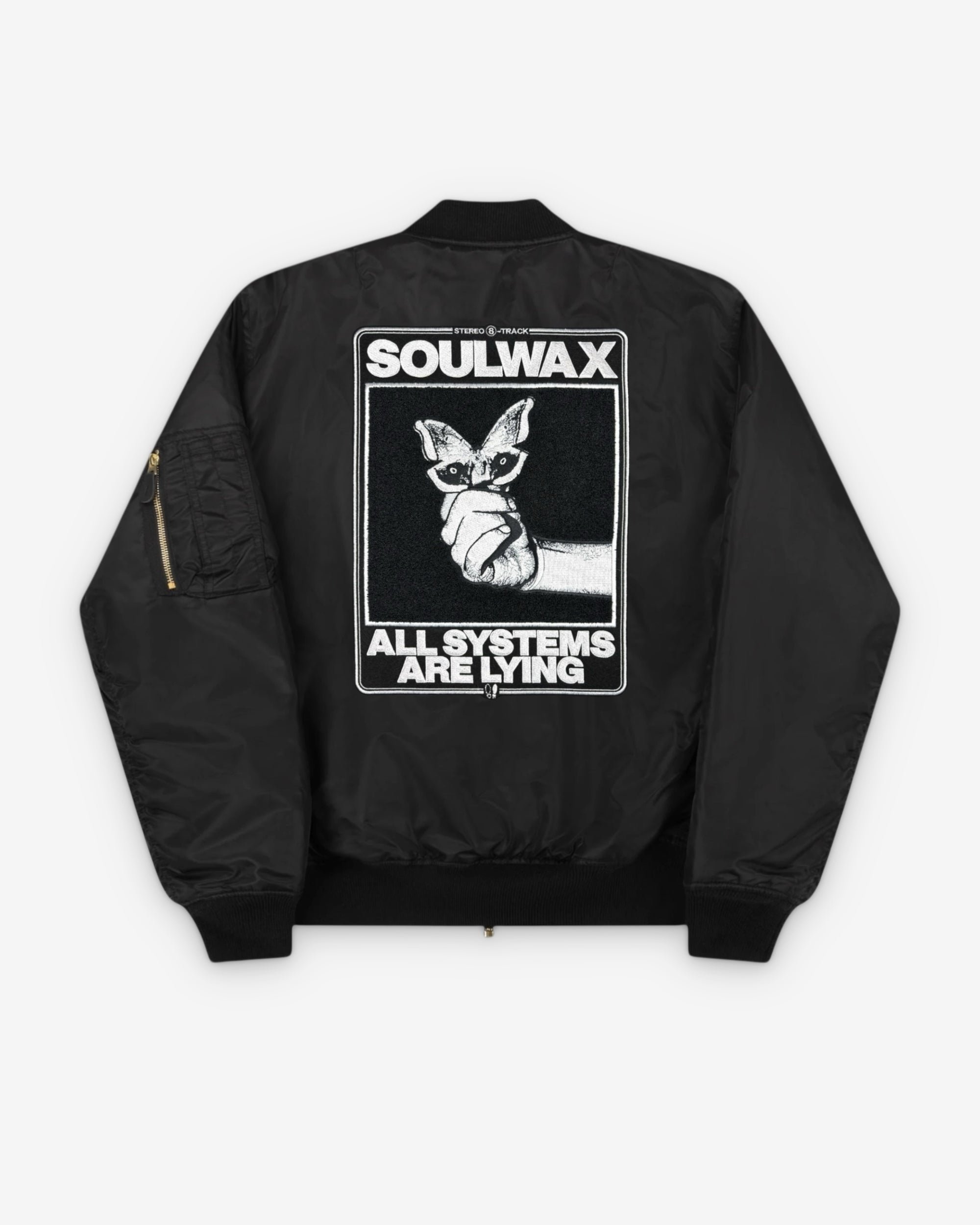 Ribbed bomber collarNylon fabricMetal front zip closureTwo front flap close pocketsGraphic patches at chest and backRibbed cuffs and hemZip arm pocket