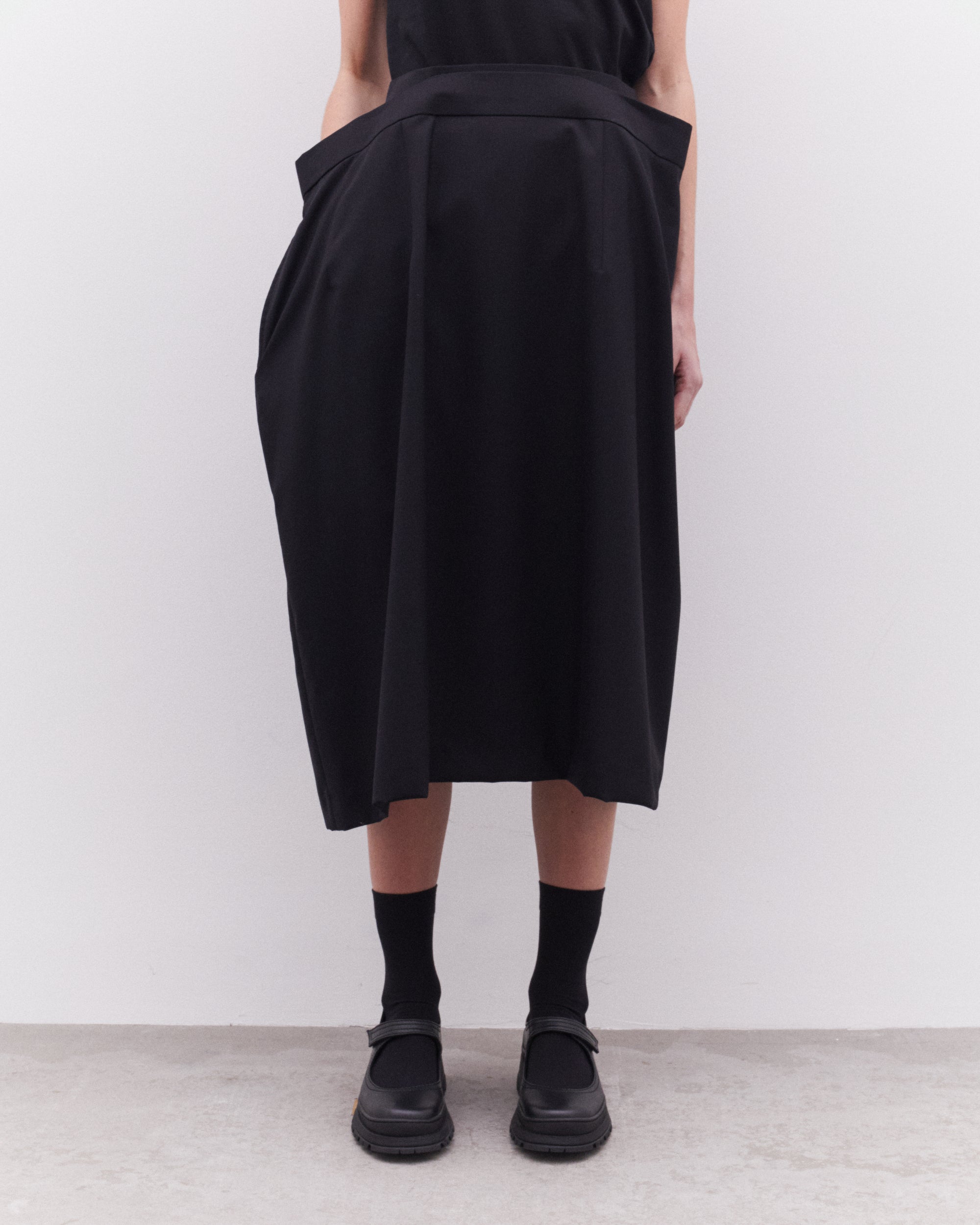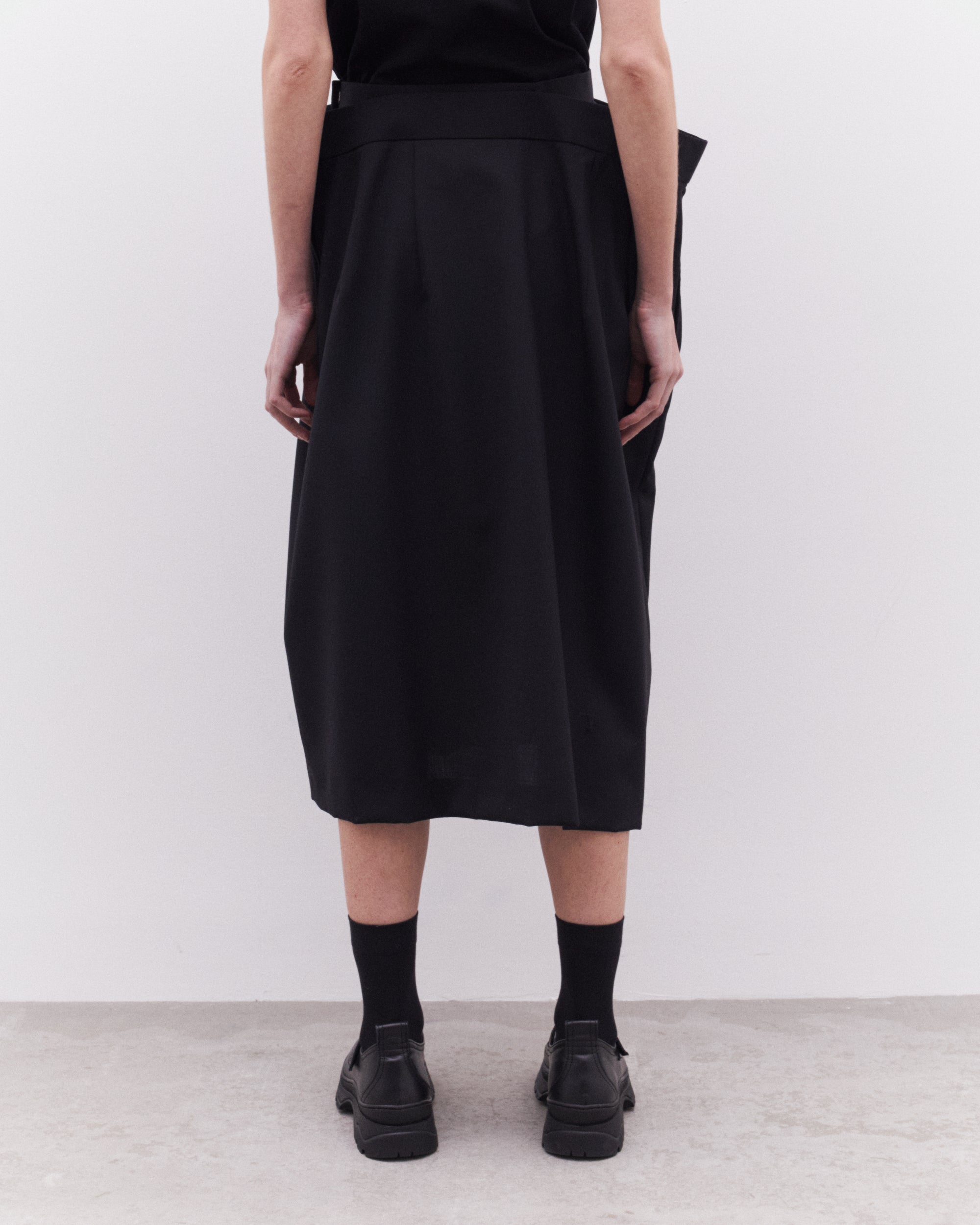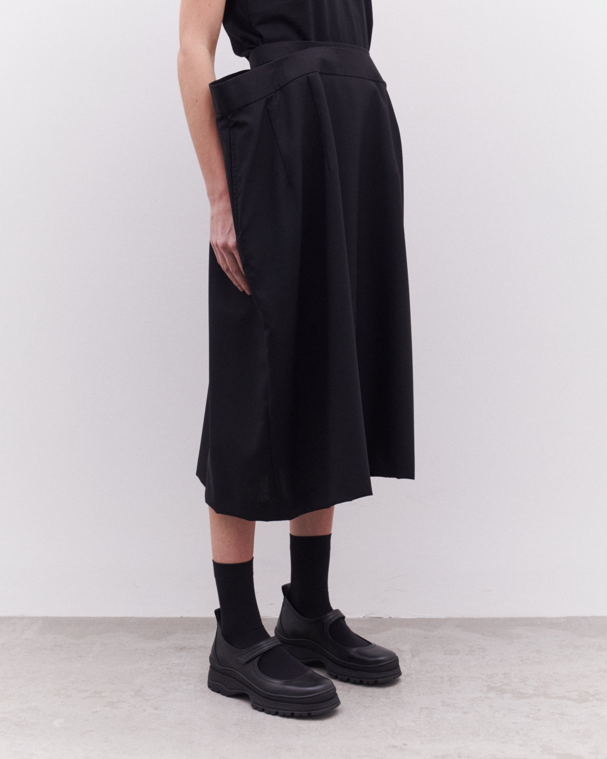 Double waistbandDrape at waistMid-lengthSide zip fasteningSide seam pockets100% WoolMade in Japan