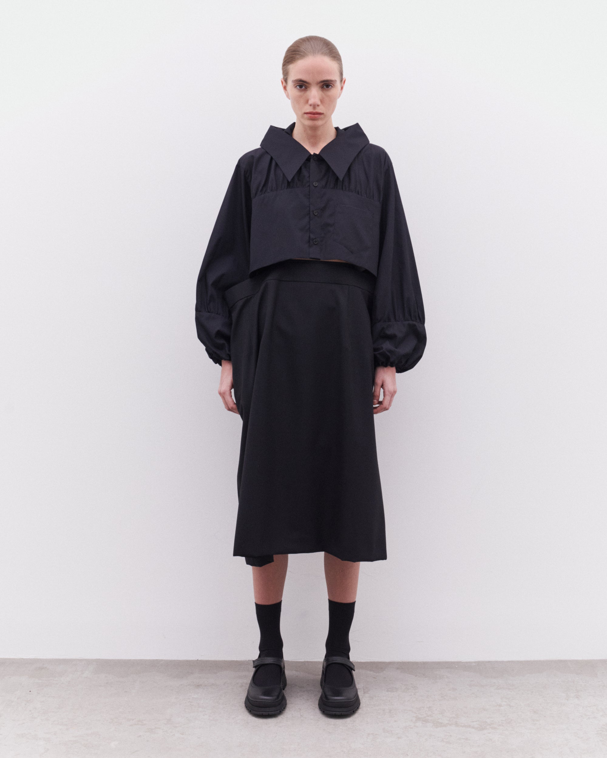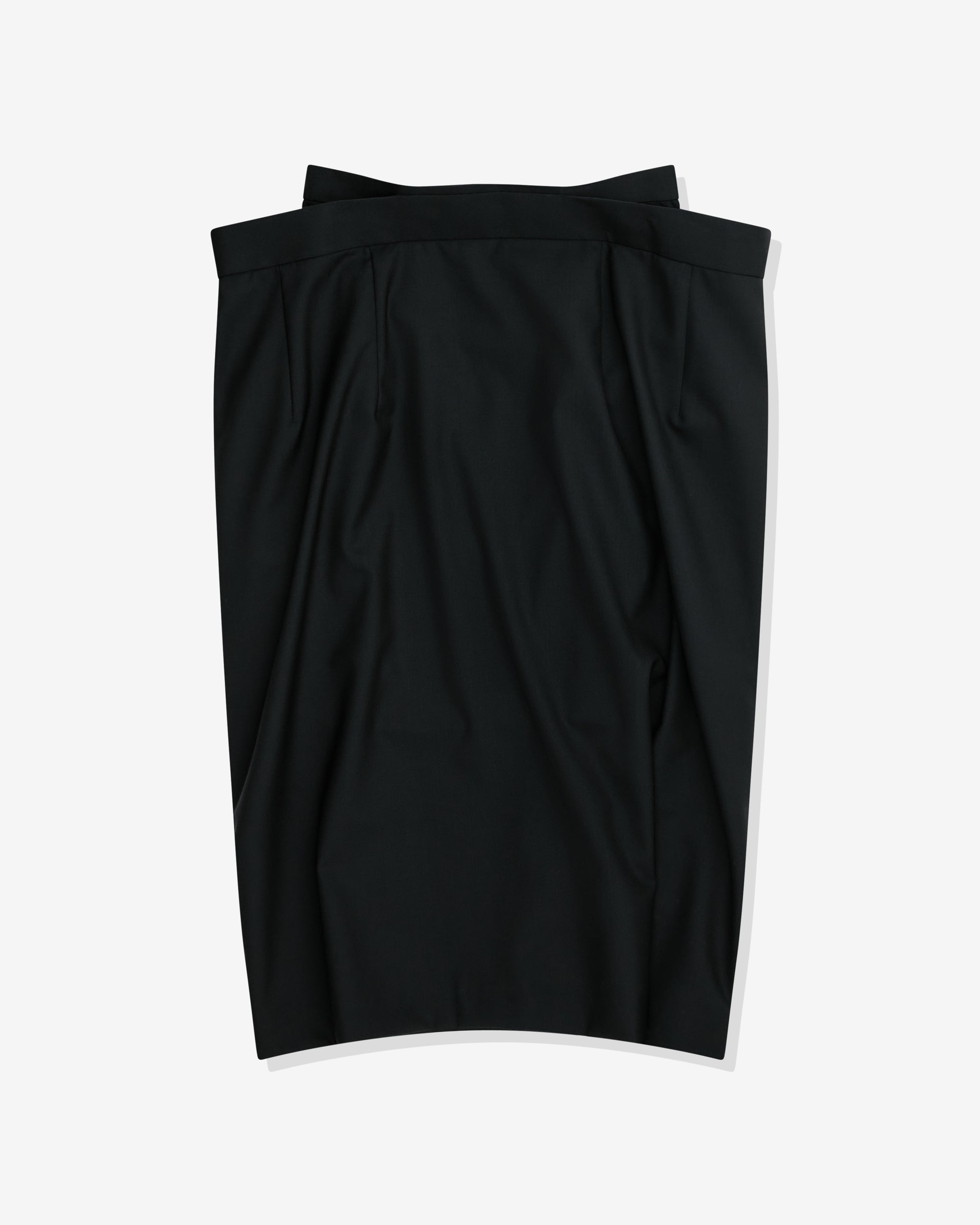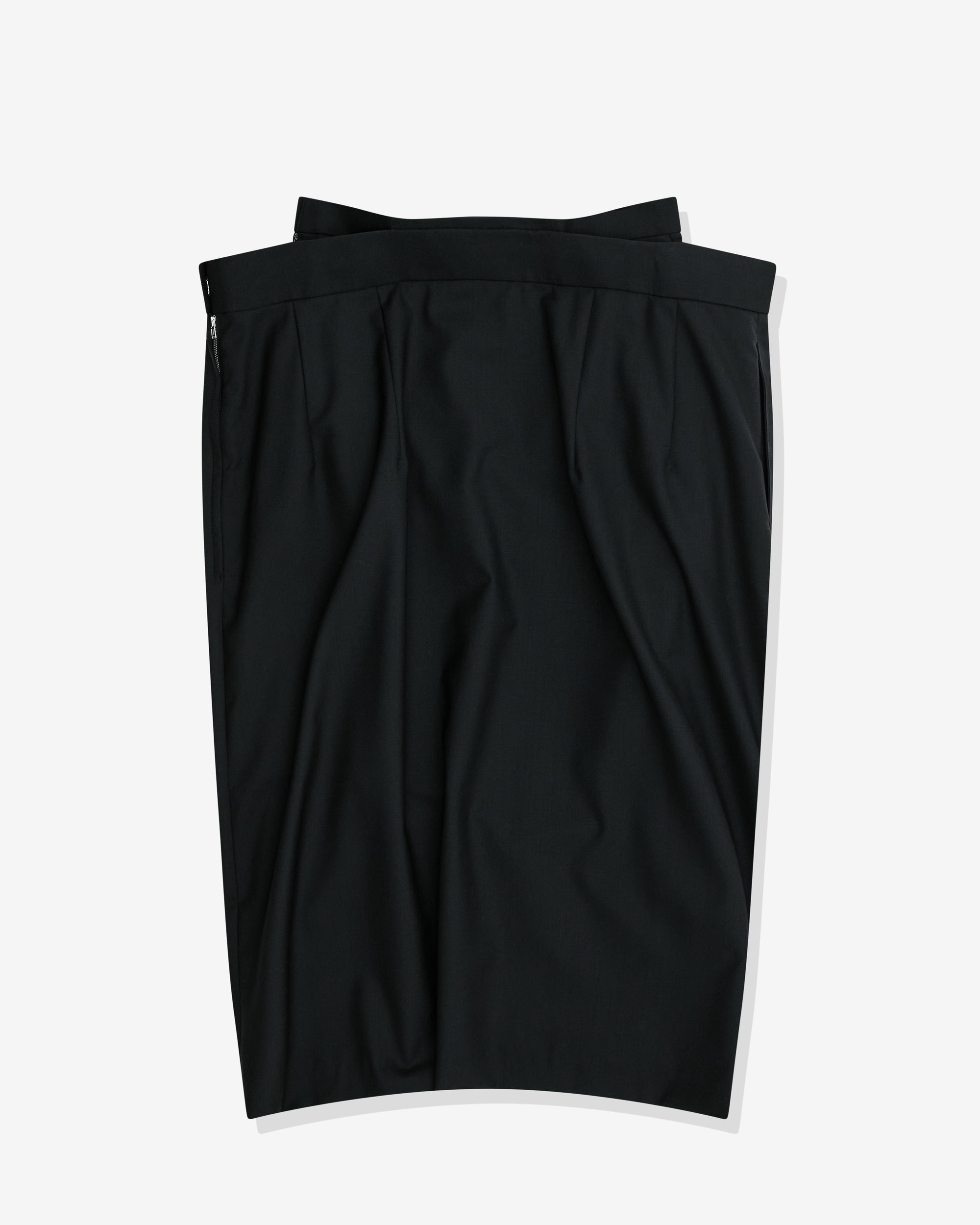 Double waistbandDrape at waistMid-lengthSide zip fasteningSide seam pockets100% WoolMade in Japan