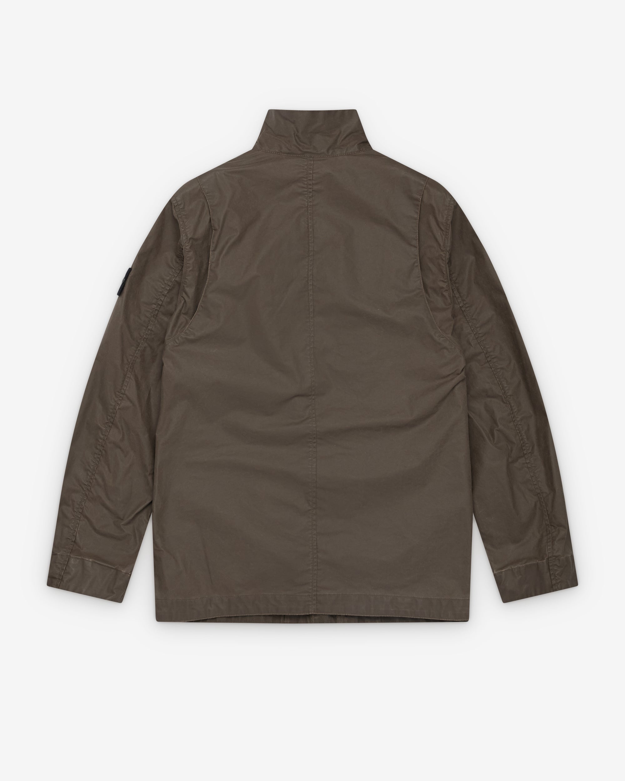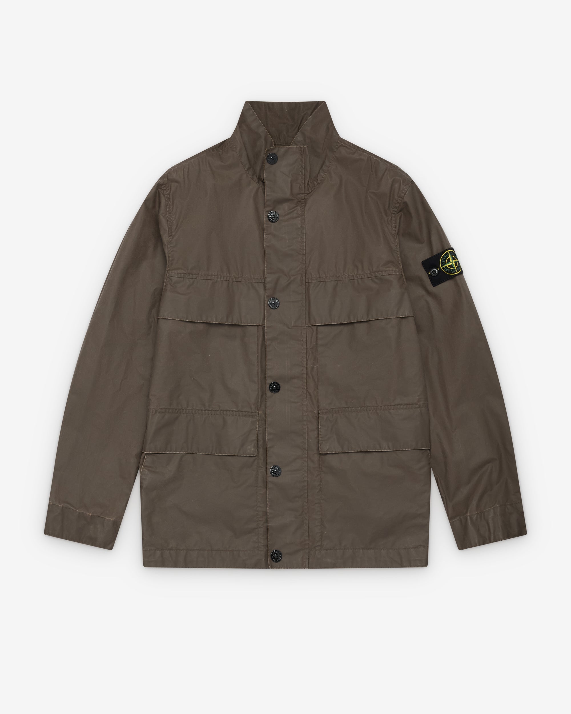 Concealed zip closure with button placketStand collar necklineTwo chest pocketsTwo flap close pocketsStone Island badge at sleeveCoated fabric