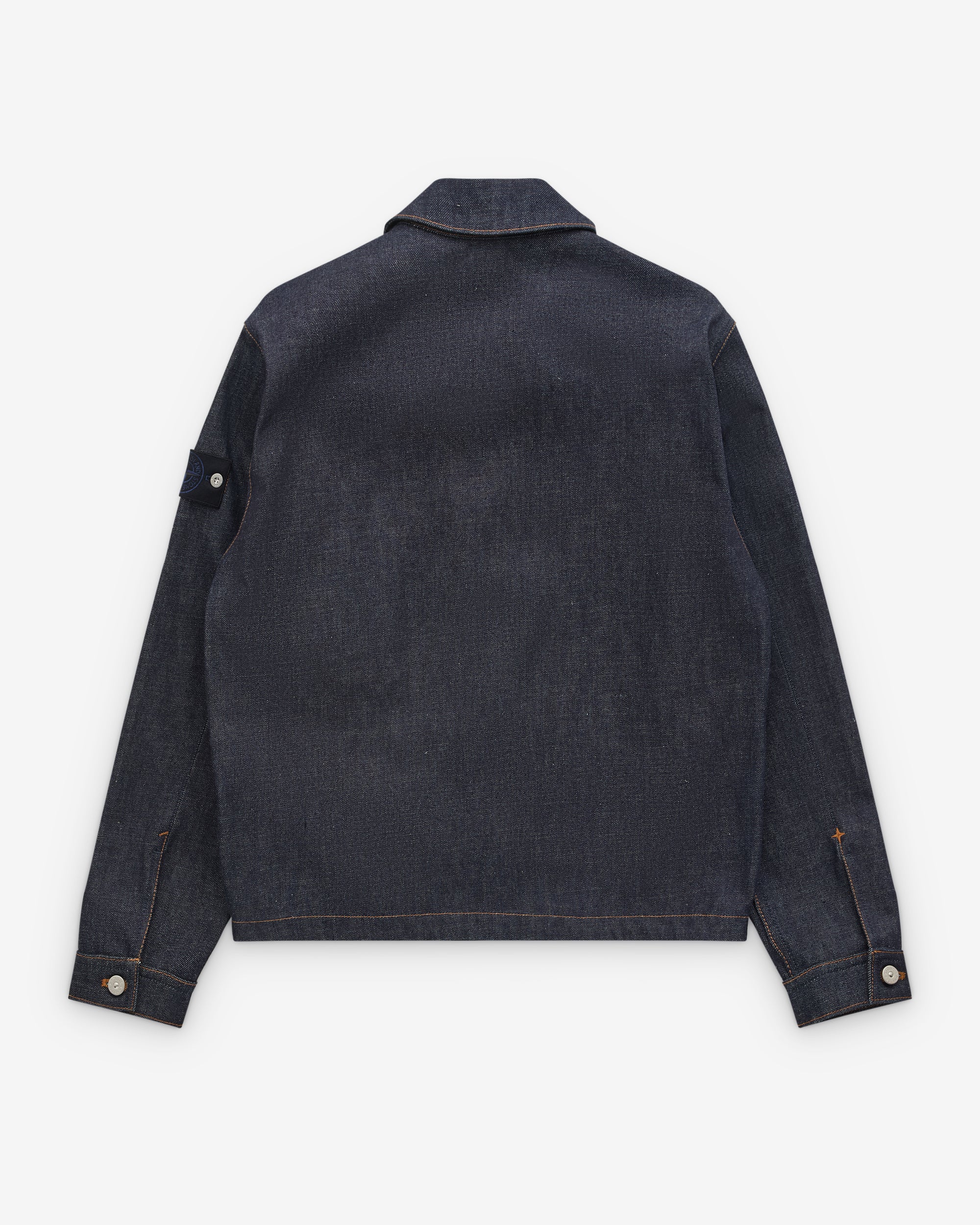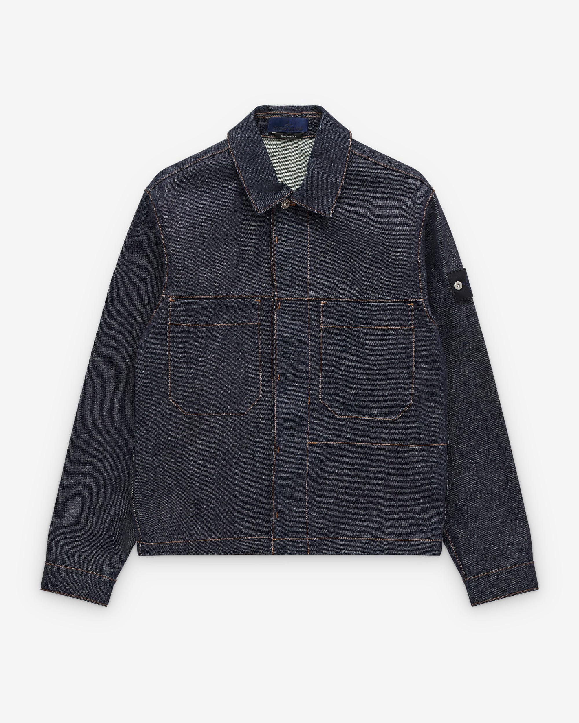 13.5 oz raw indigo denim fabricFront patch chest pocketsClassic jacket collarDenim research Stone Island badge at frontContrast stitching throughoutConcealed button closureStraight hem