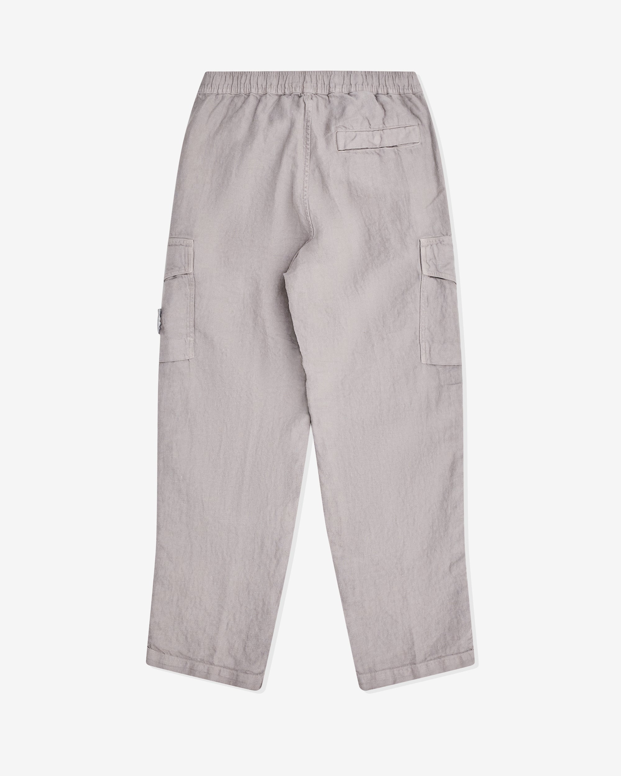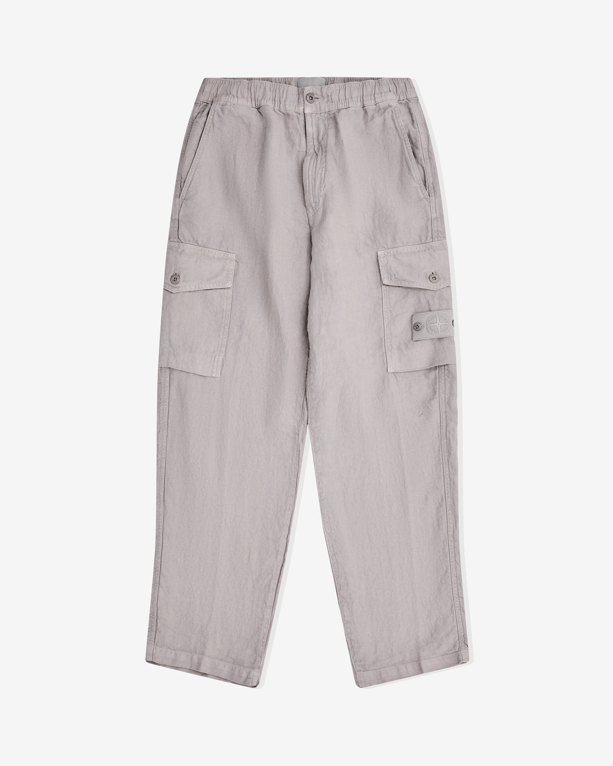 Elasticated button waistInternal drawstringGarment dyed linen fabricCargo pocketsSlant pocketsStone Island Ghost badge at left legStraight fit