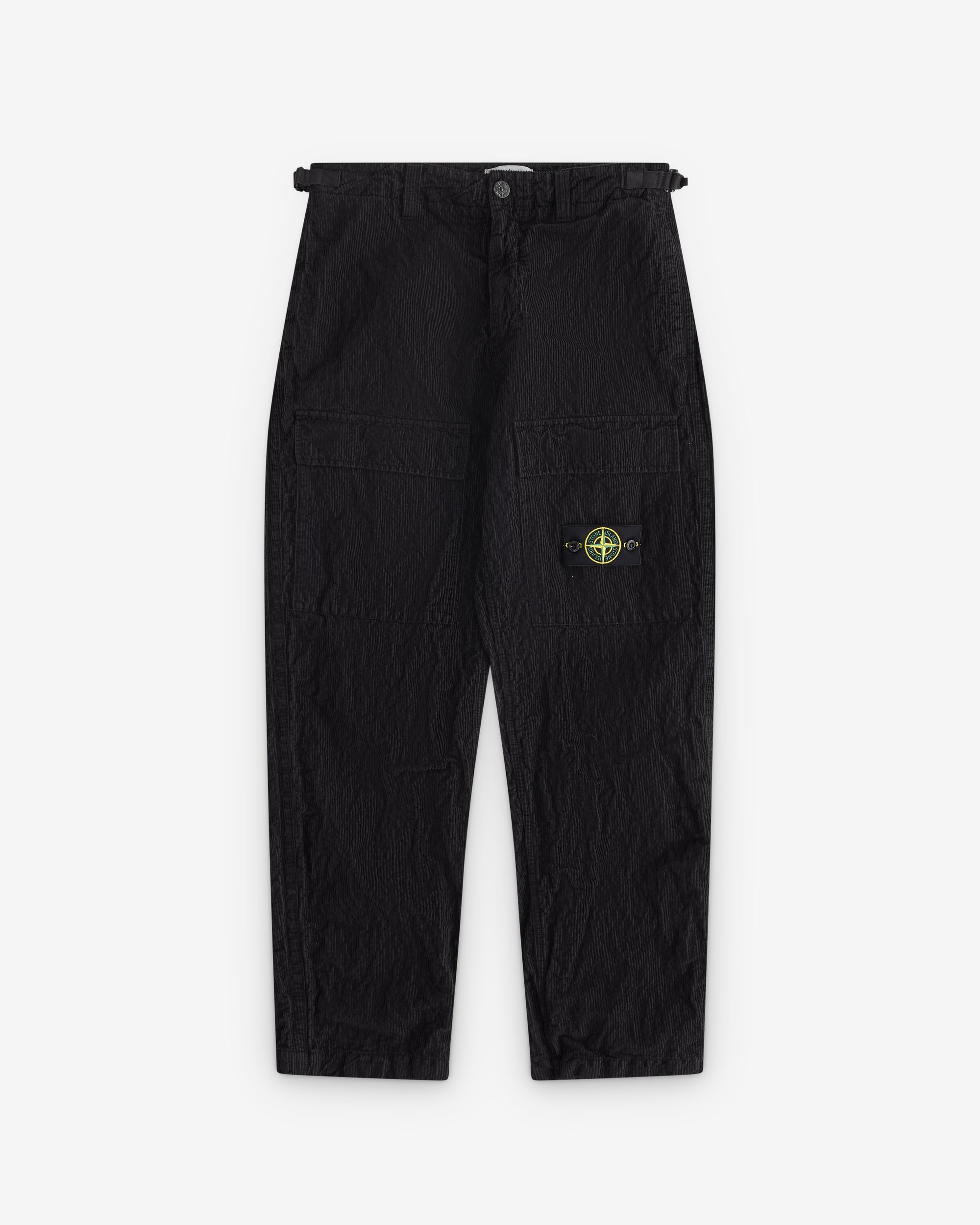 Button waist, zip flySide seam slip pocketsAdjustable waist strapsCargo pockets at legGarment dyed corduroy fabricLoose fitStone Island badge at leg
