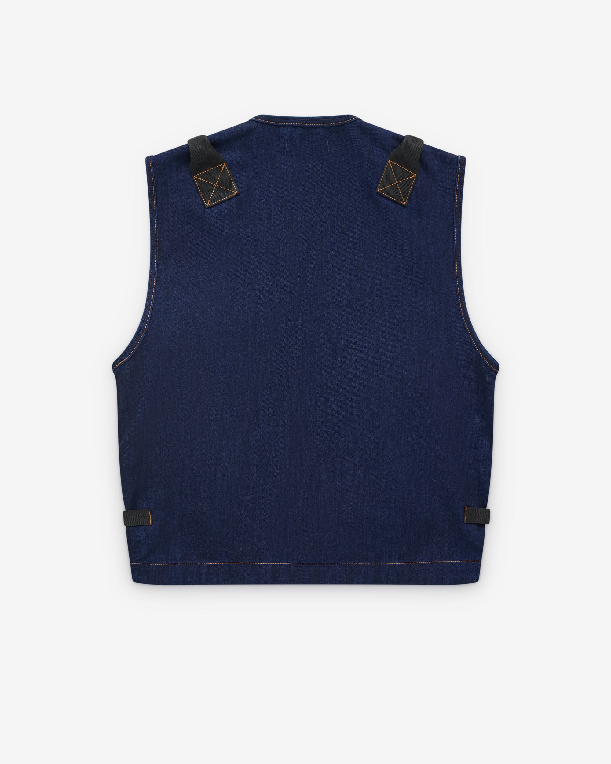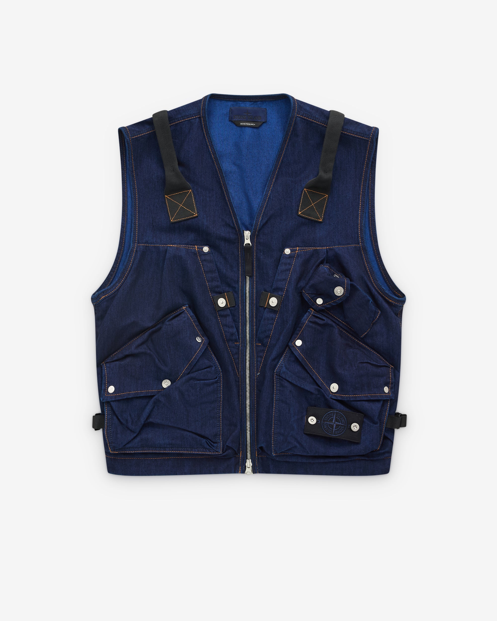 V-NecklineFront zip closureIndigo dyed denim tela fabricMultiple pockets at frontMetal rivet detailsDenim research Stone Island badge at frontContrast orange stitching