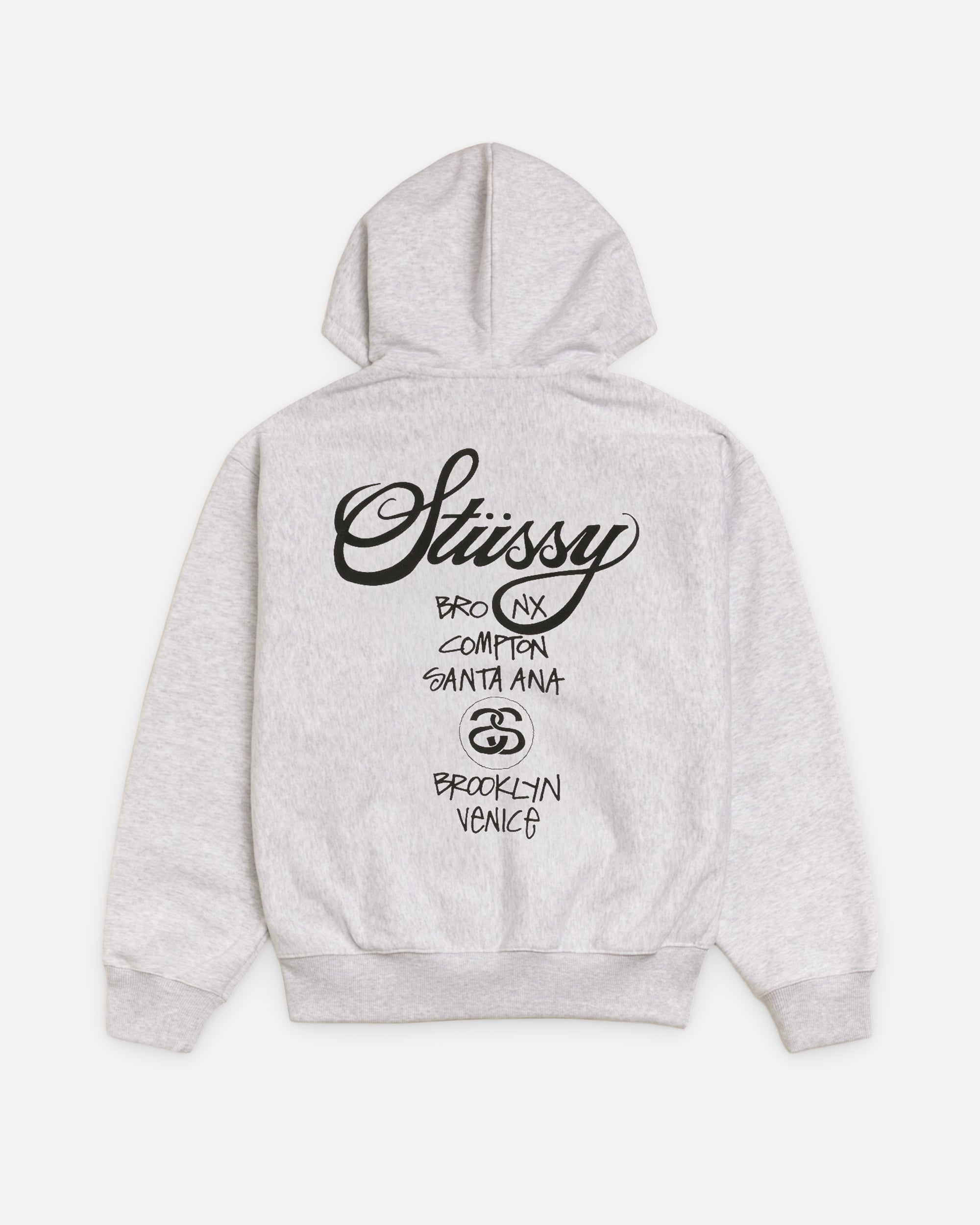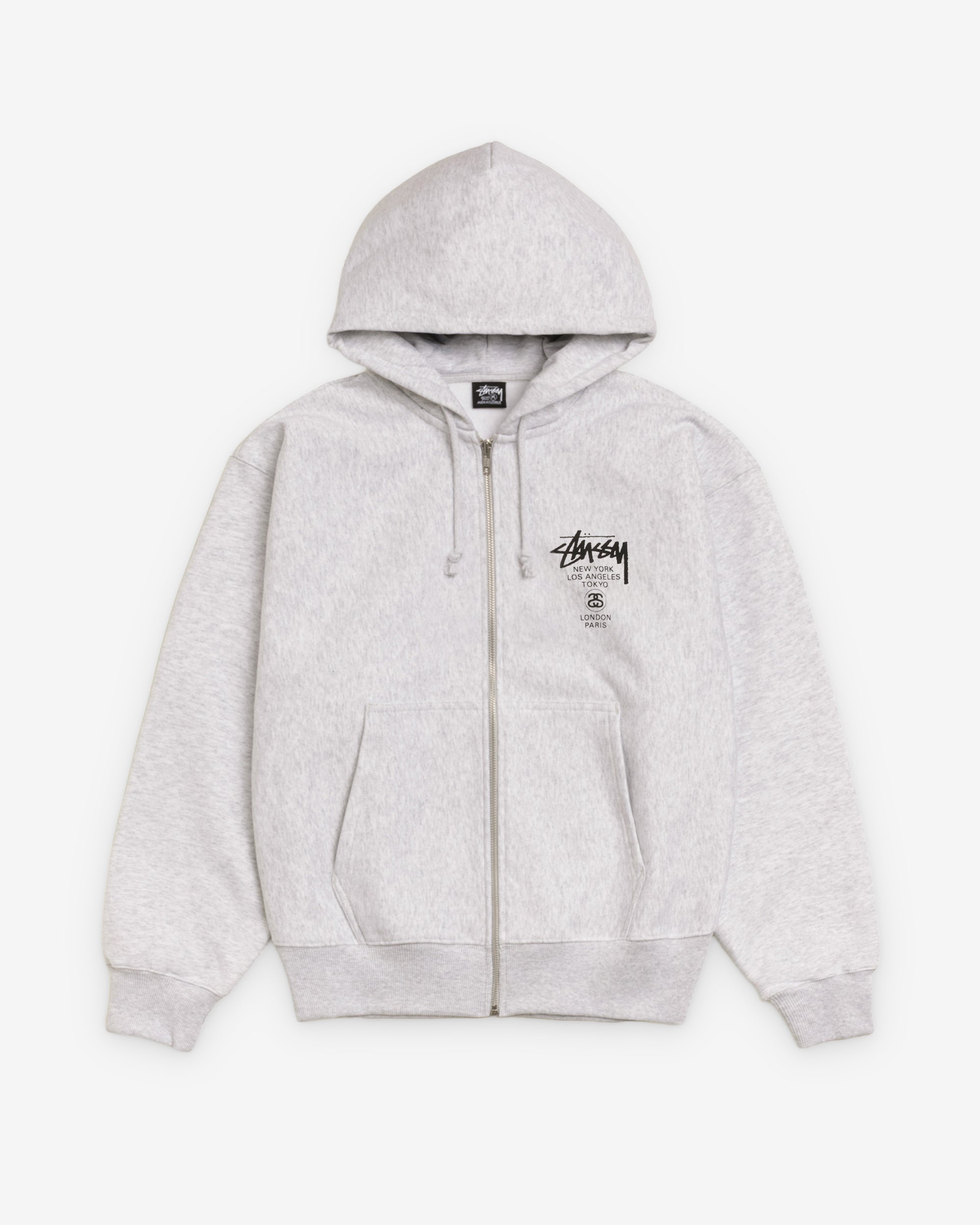 Relaxed fit zip-front fleece hoodieHeavyweight 430gsm cotton blendYKK zip front closureScreen printed artworkRound drawcord in hoodRibbed cuffs and hemPatch pocketsUnisex