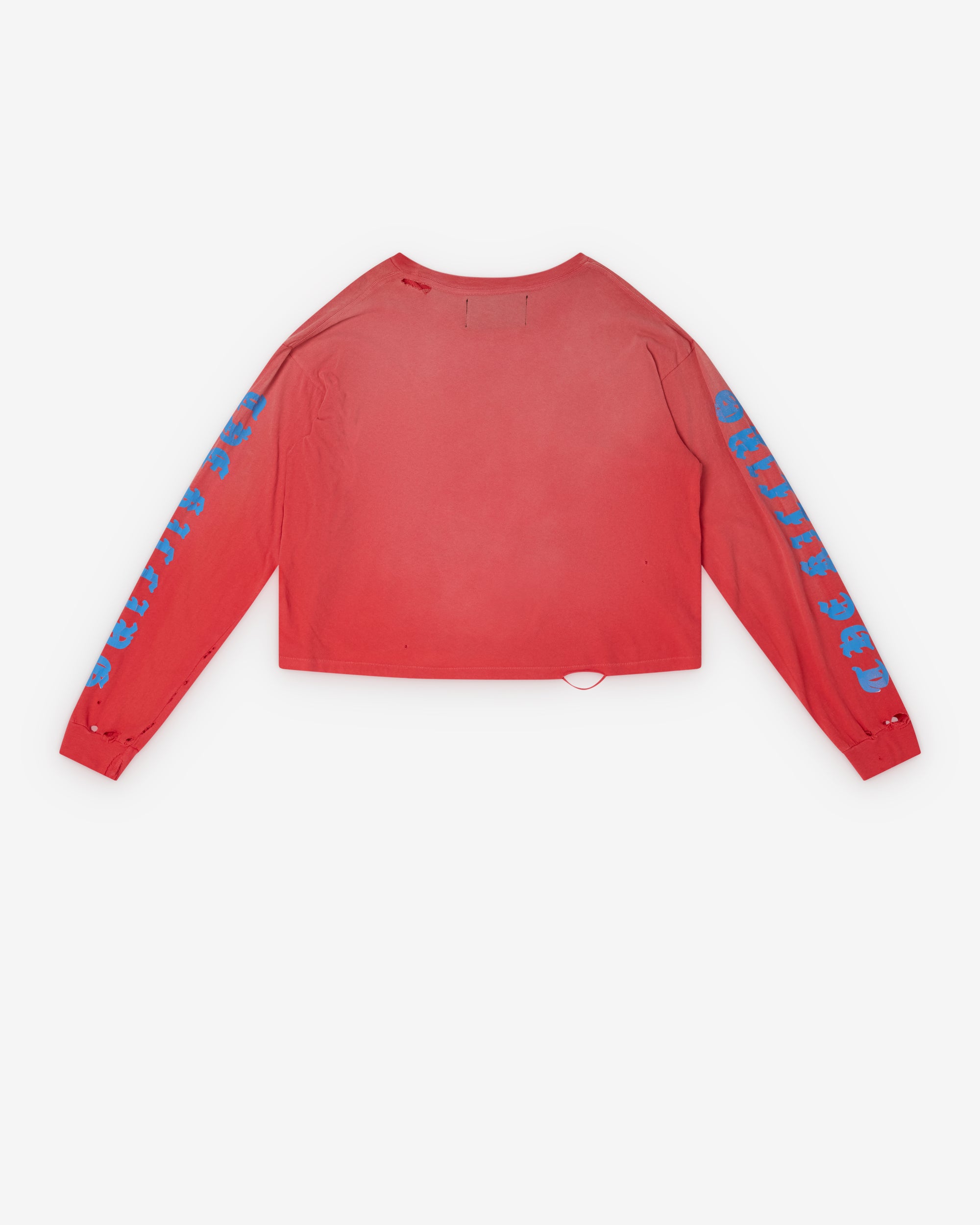 Ribbed crew neckline Printed front and sleeve graphics Distressed details throughout Long sleeve designBoxy fit