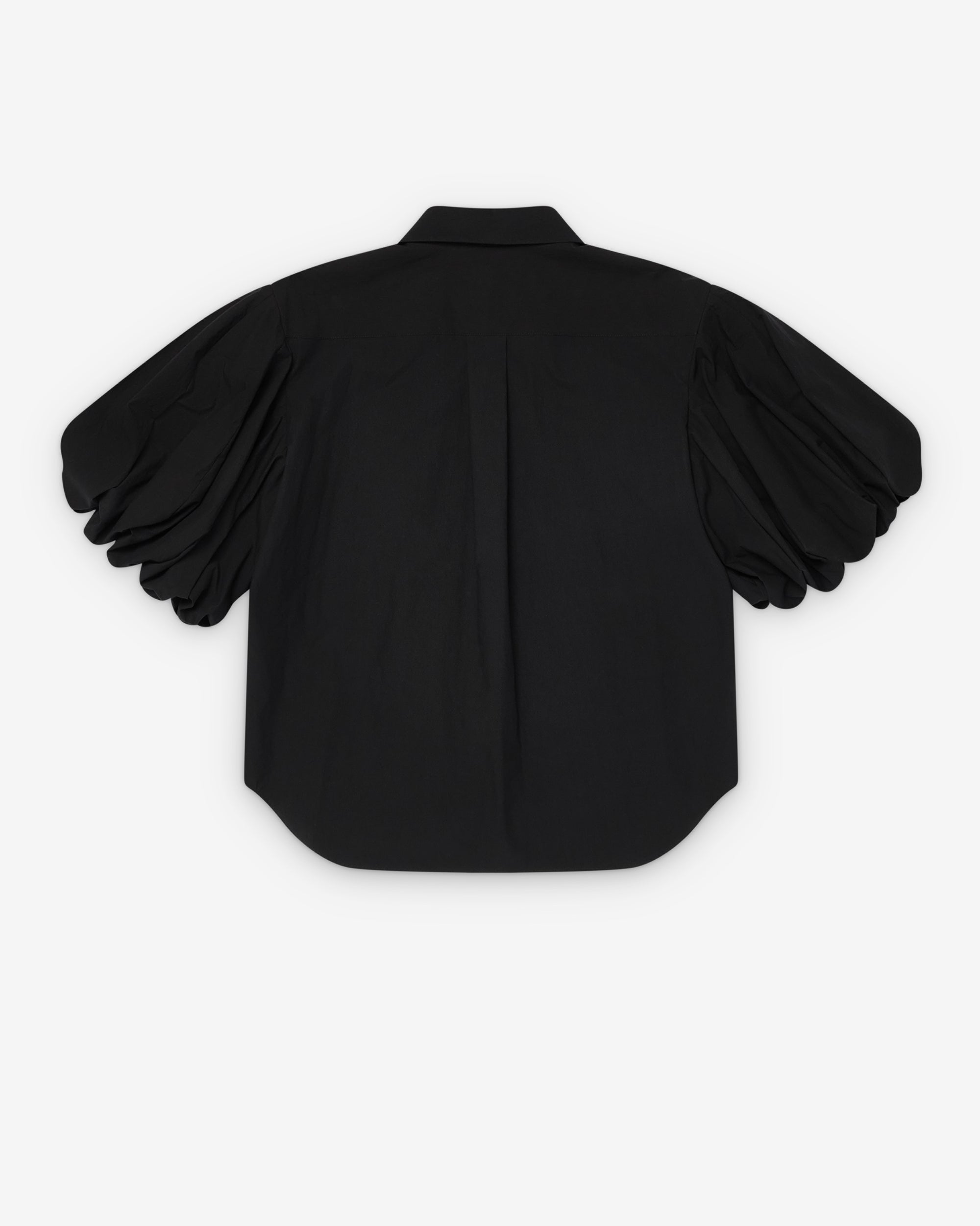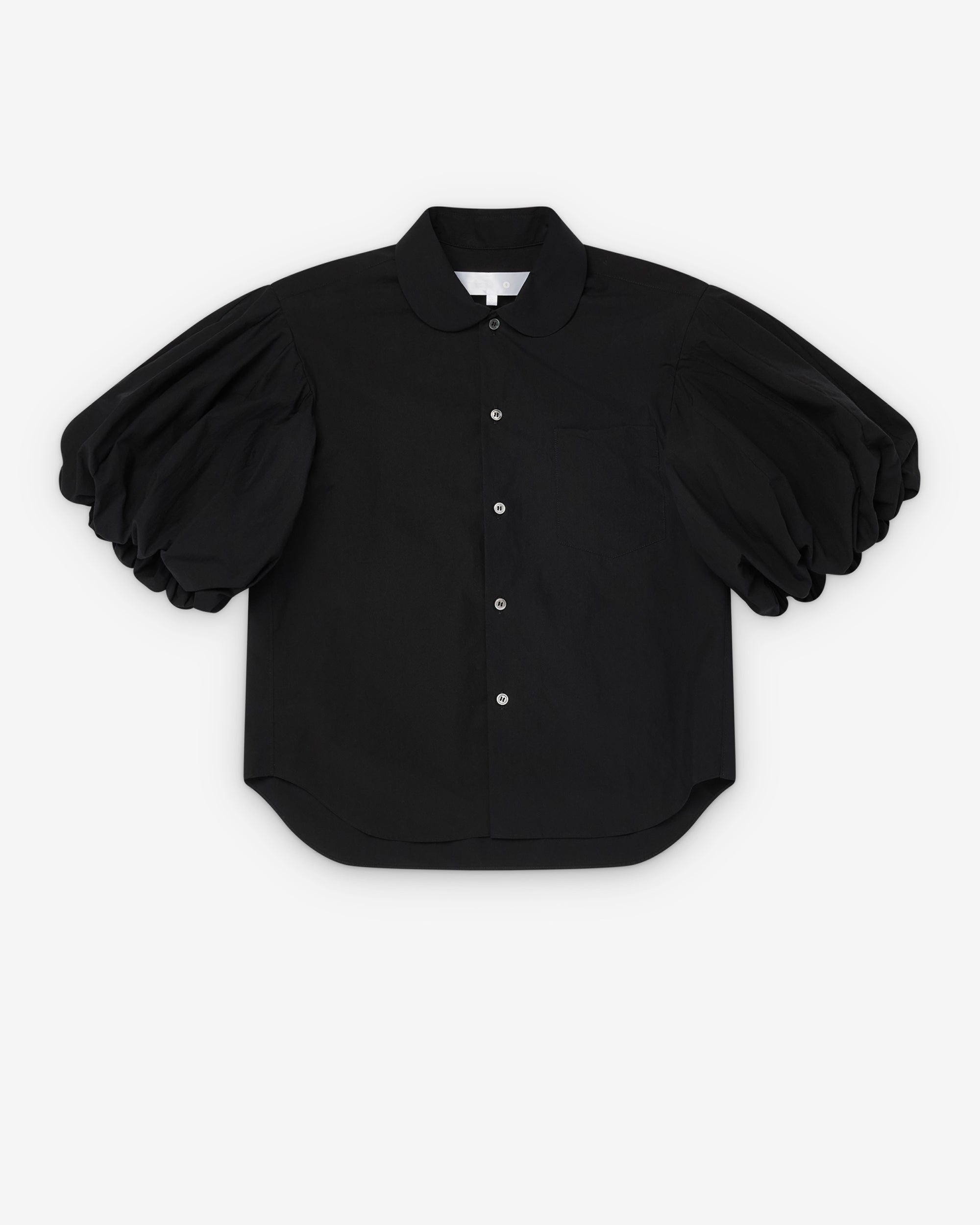 Peter pan collarButton front closureContrast buttonsRuffled, short sleevesChest patch pocket100% CottonMade in Japan
