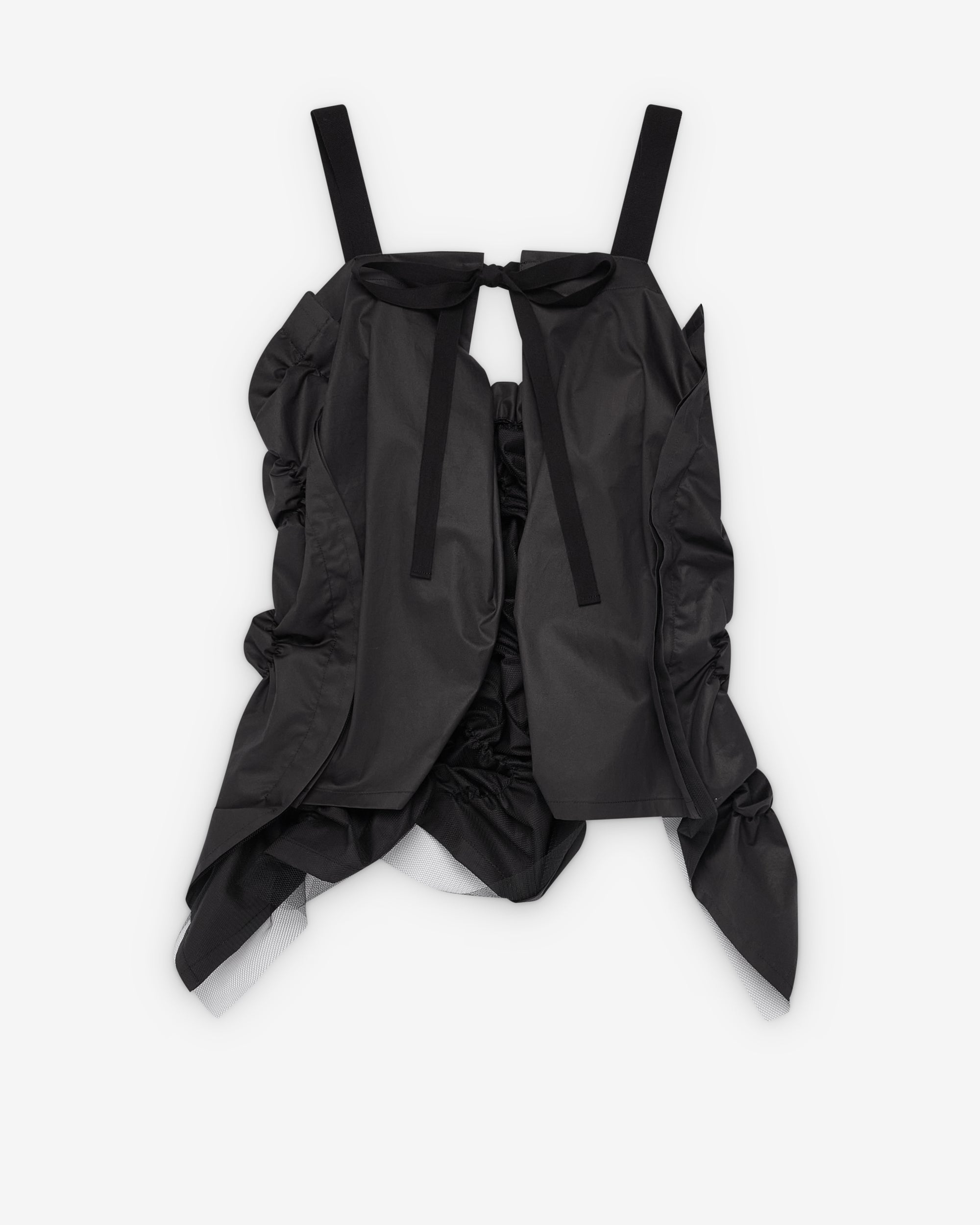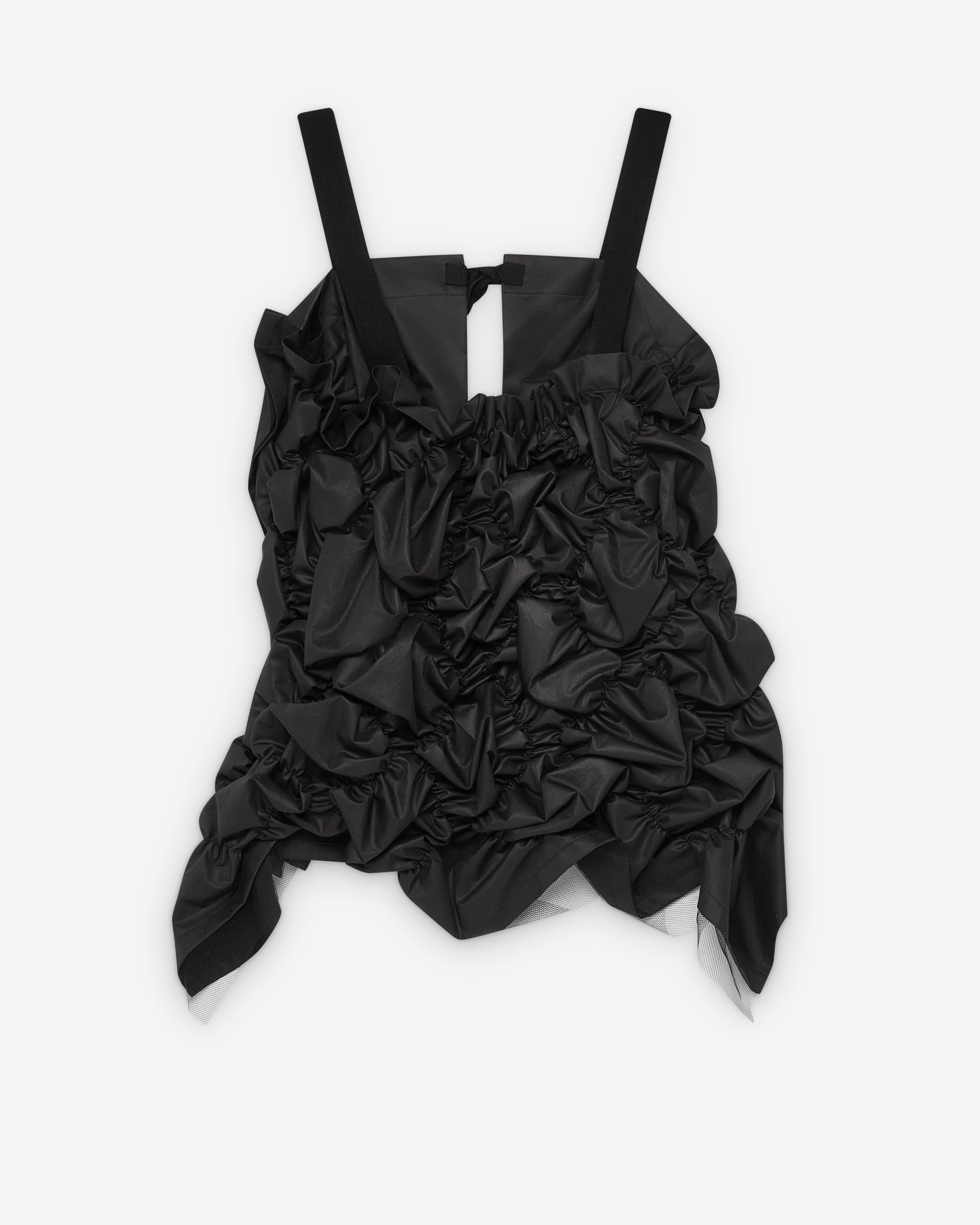 Thin shoulder strapsBow tied closure on backGathered ruffle design
