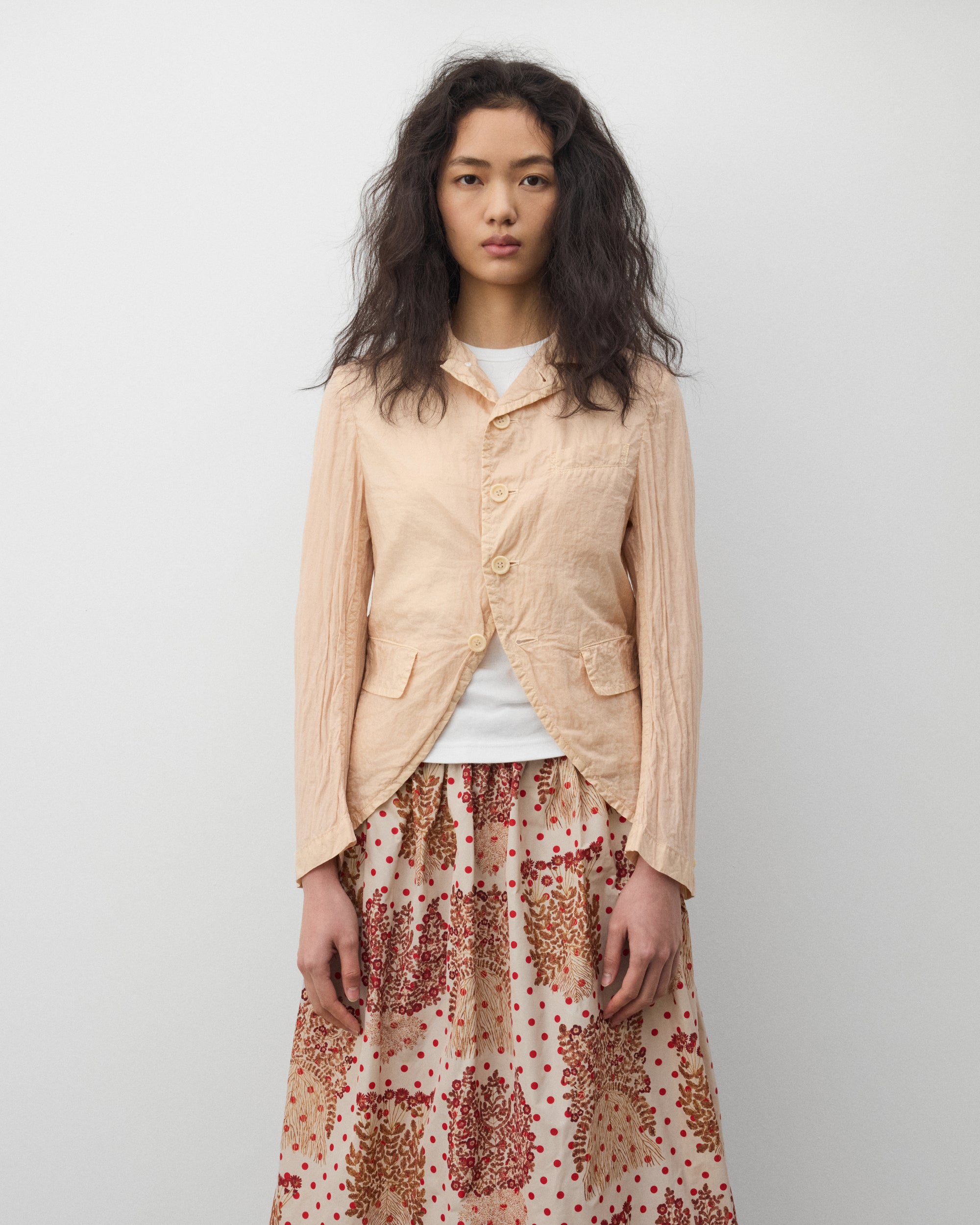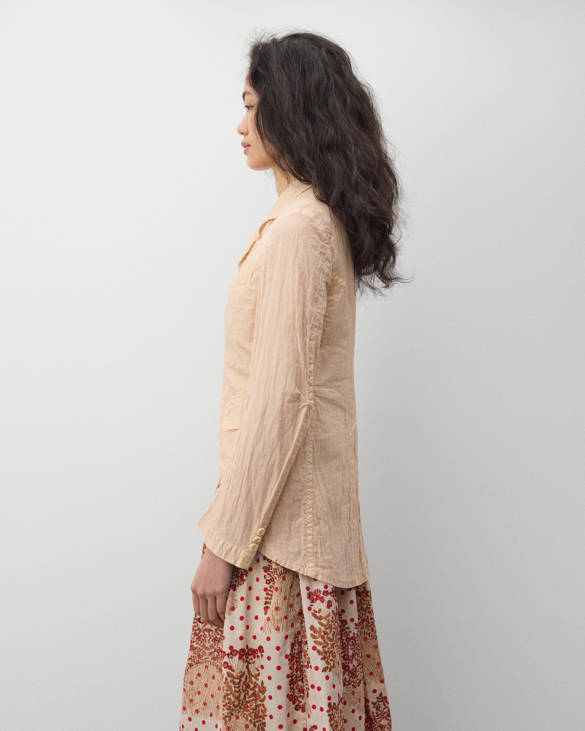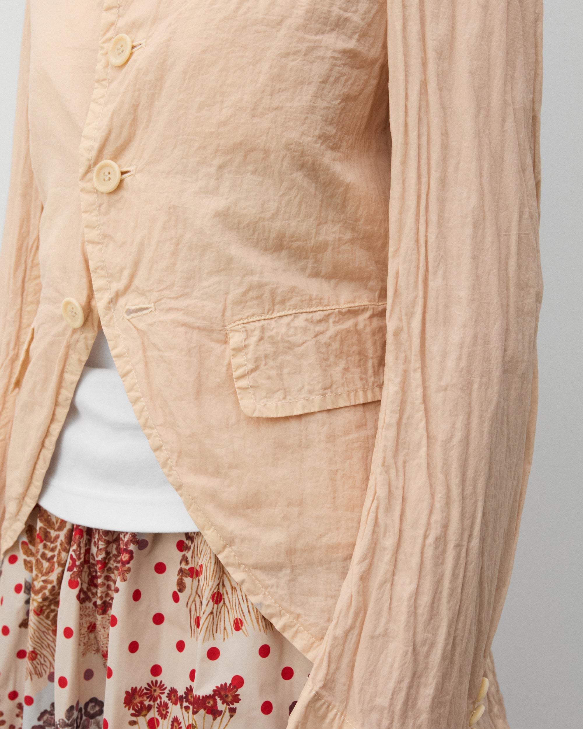 Notched lapel collarFour button front closureFront patch pocketsCrinkled fabricSplit rear shirttail seam