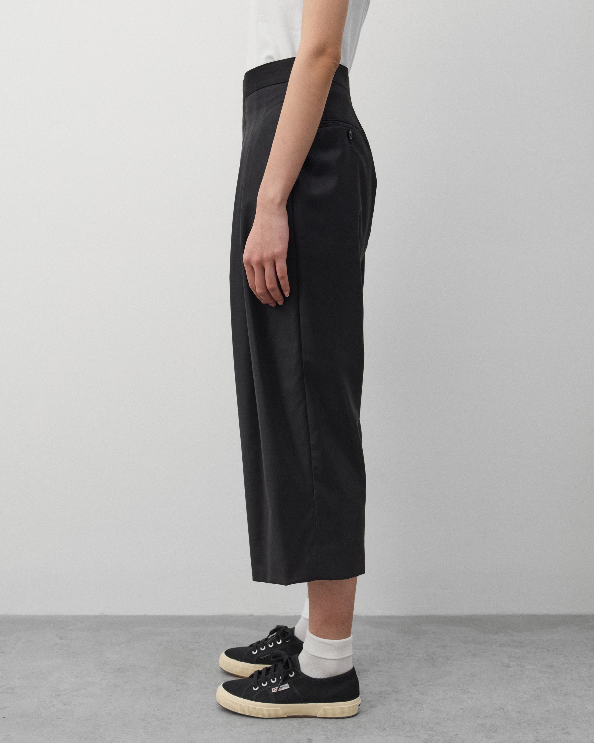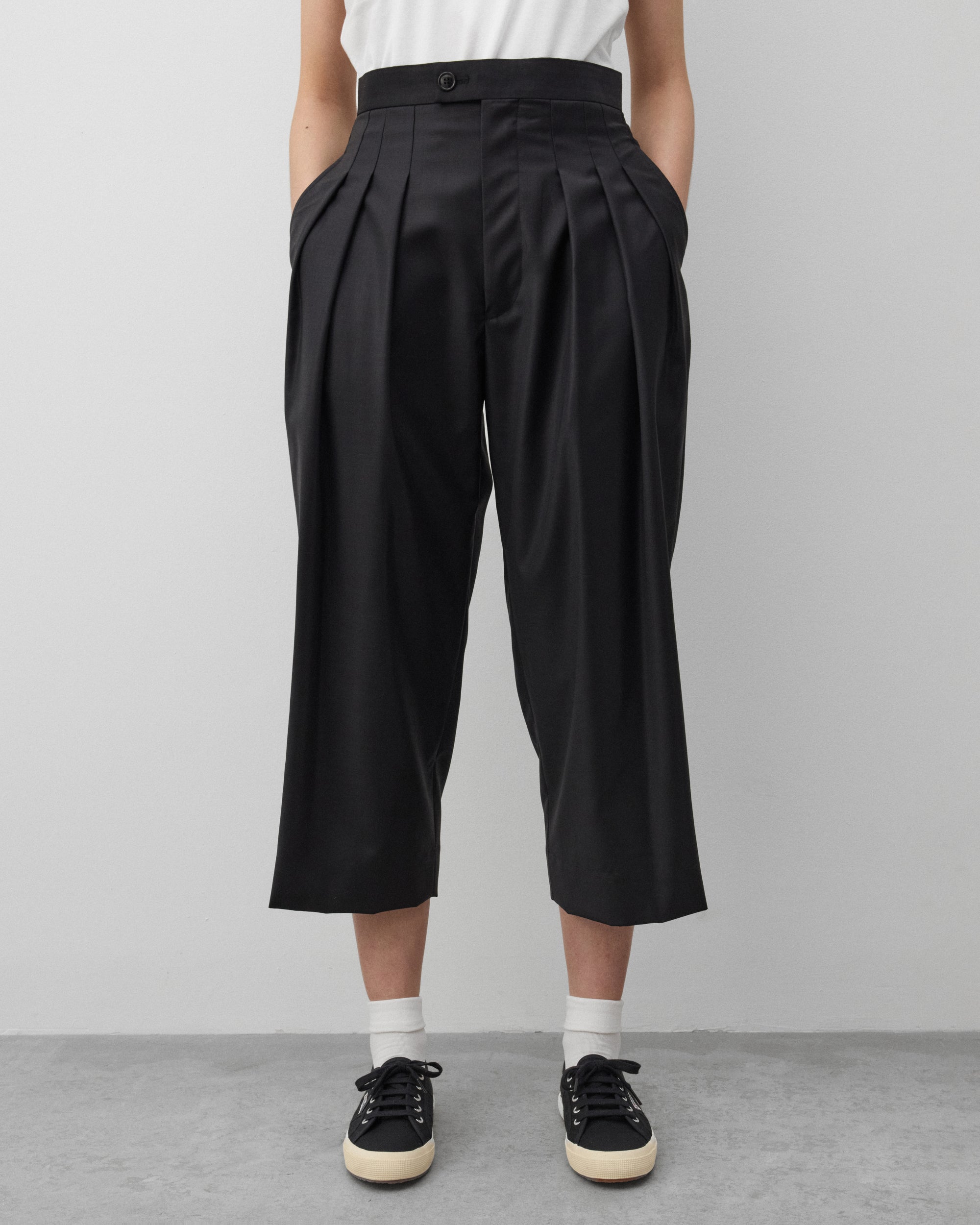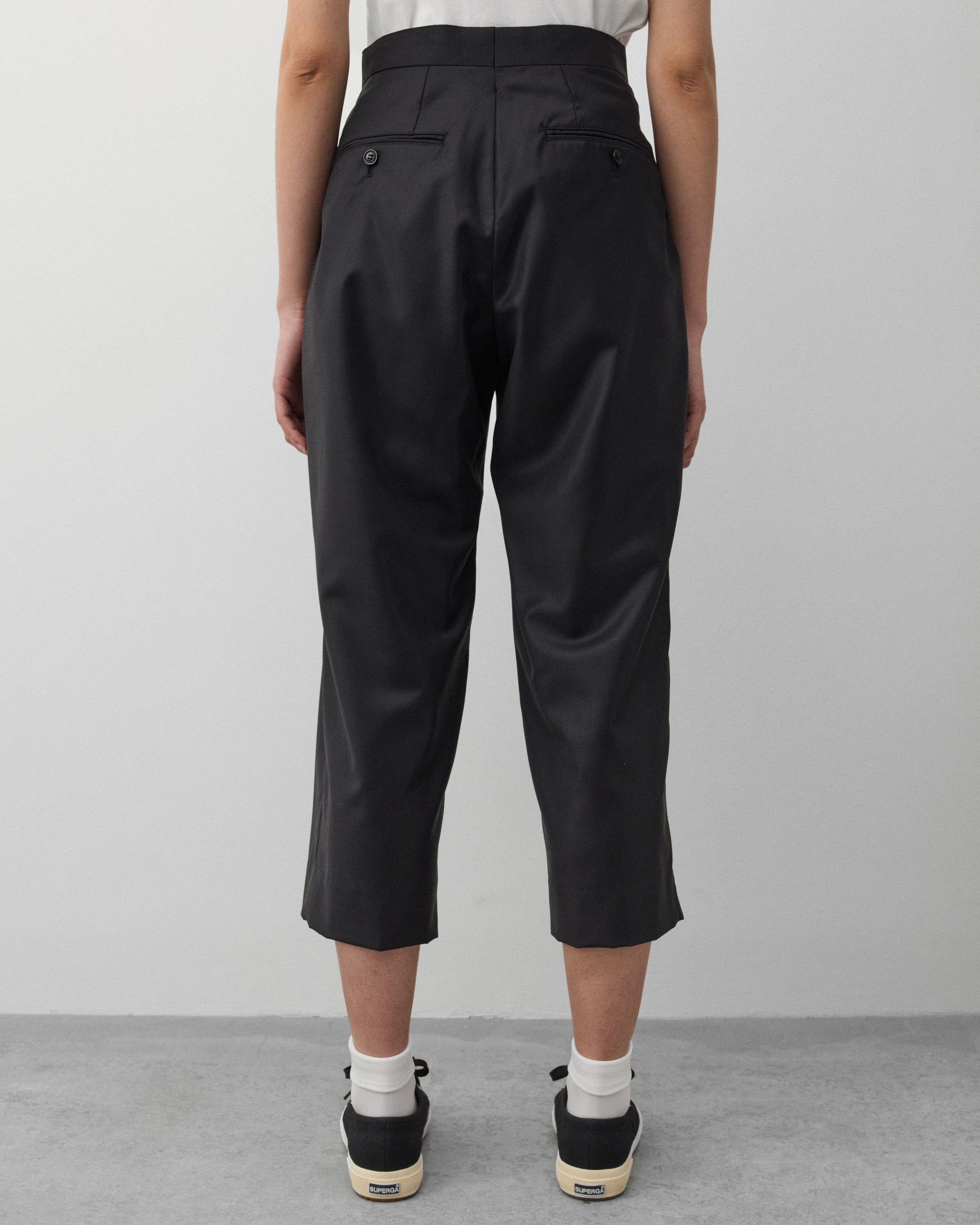 Button close waist, zip flySide seam pocketsDual front pleatsInternal satin lining Straight fitBack pockets