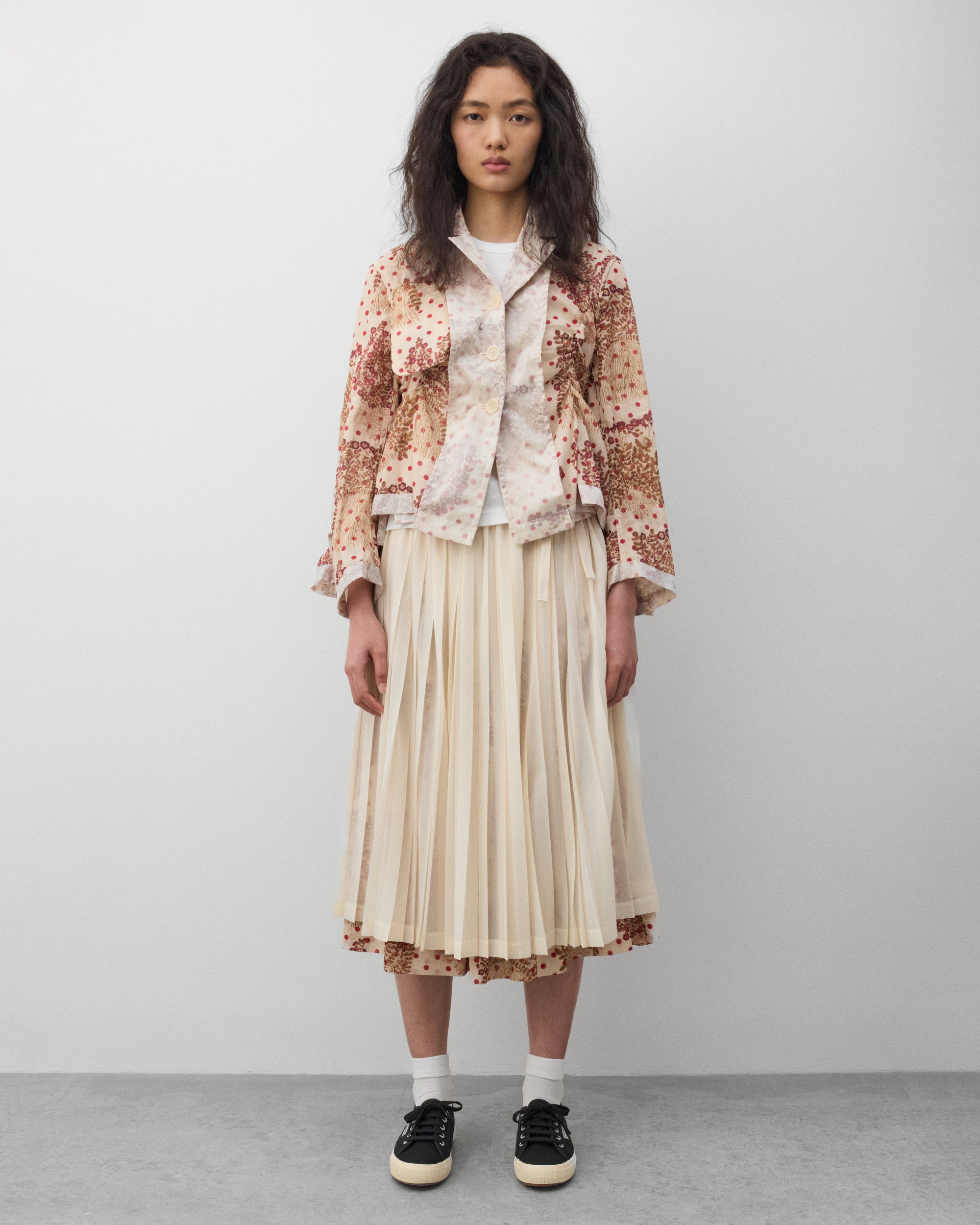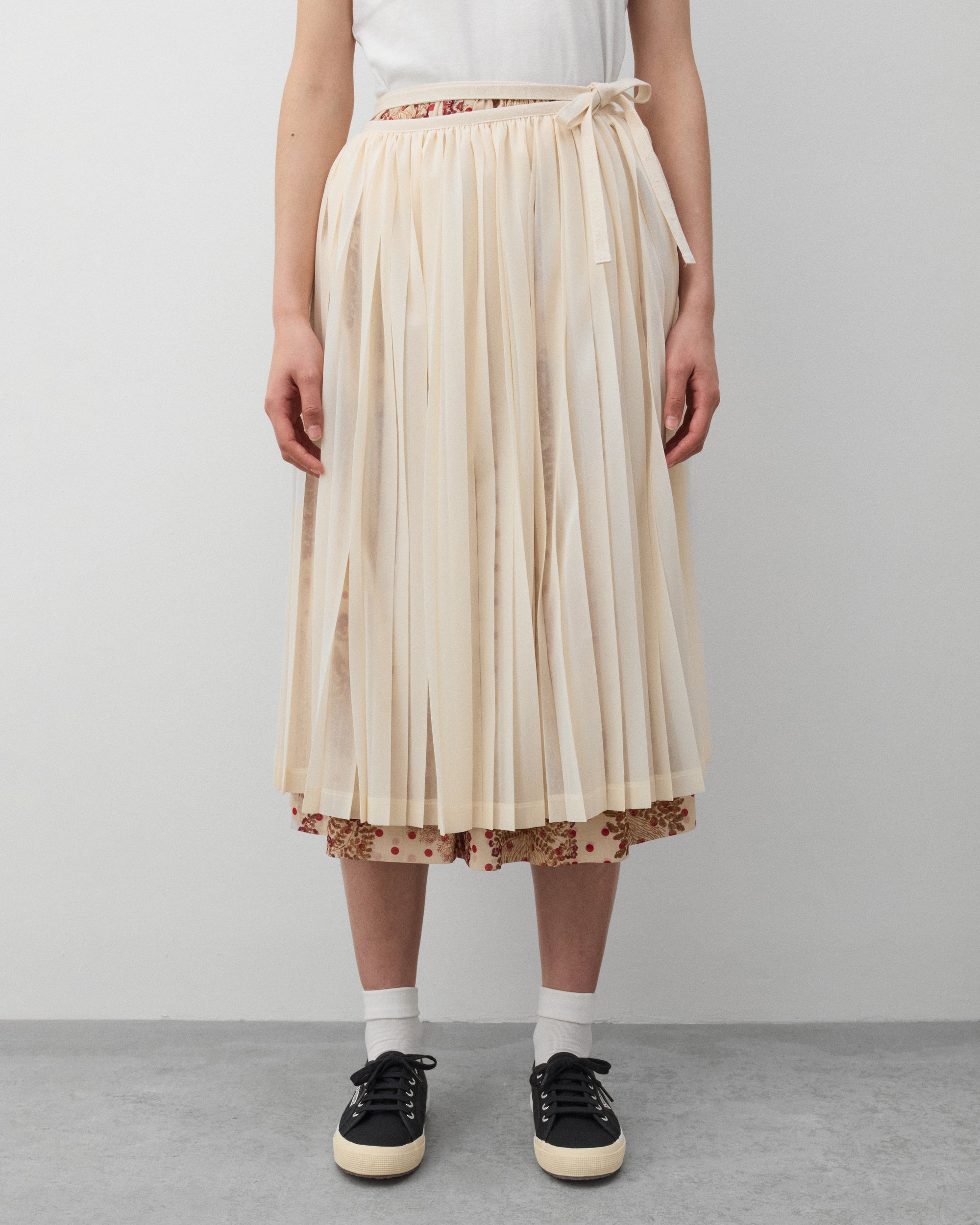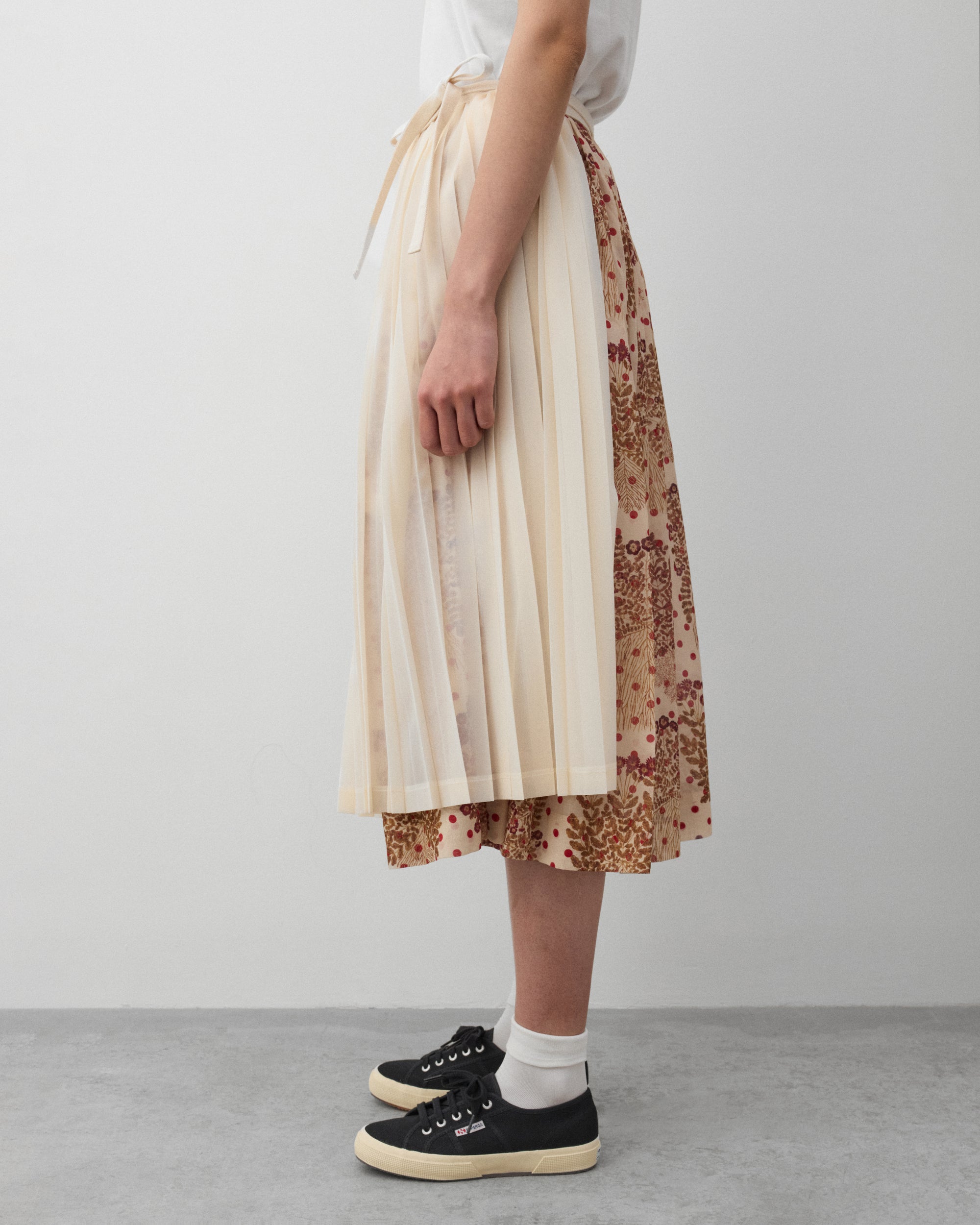 Attached pleated skirt front panelFloral print fabricCropped fit trousersTie waist Side seam pocketsSemi sheer fabric