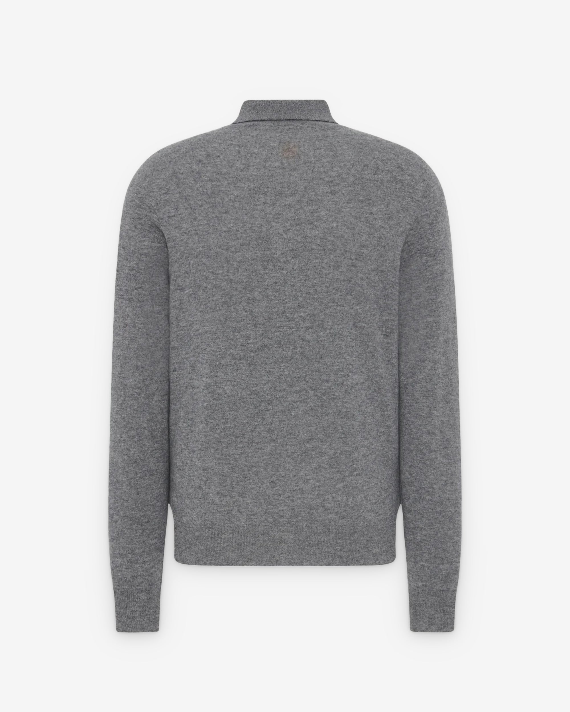Long-sleeved polo sweater in ultrafine cashmere knit with ribbed cuffs and hem, horn button closure, and signature center back detail.