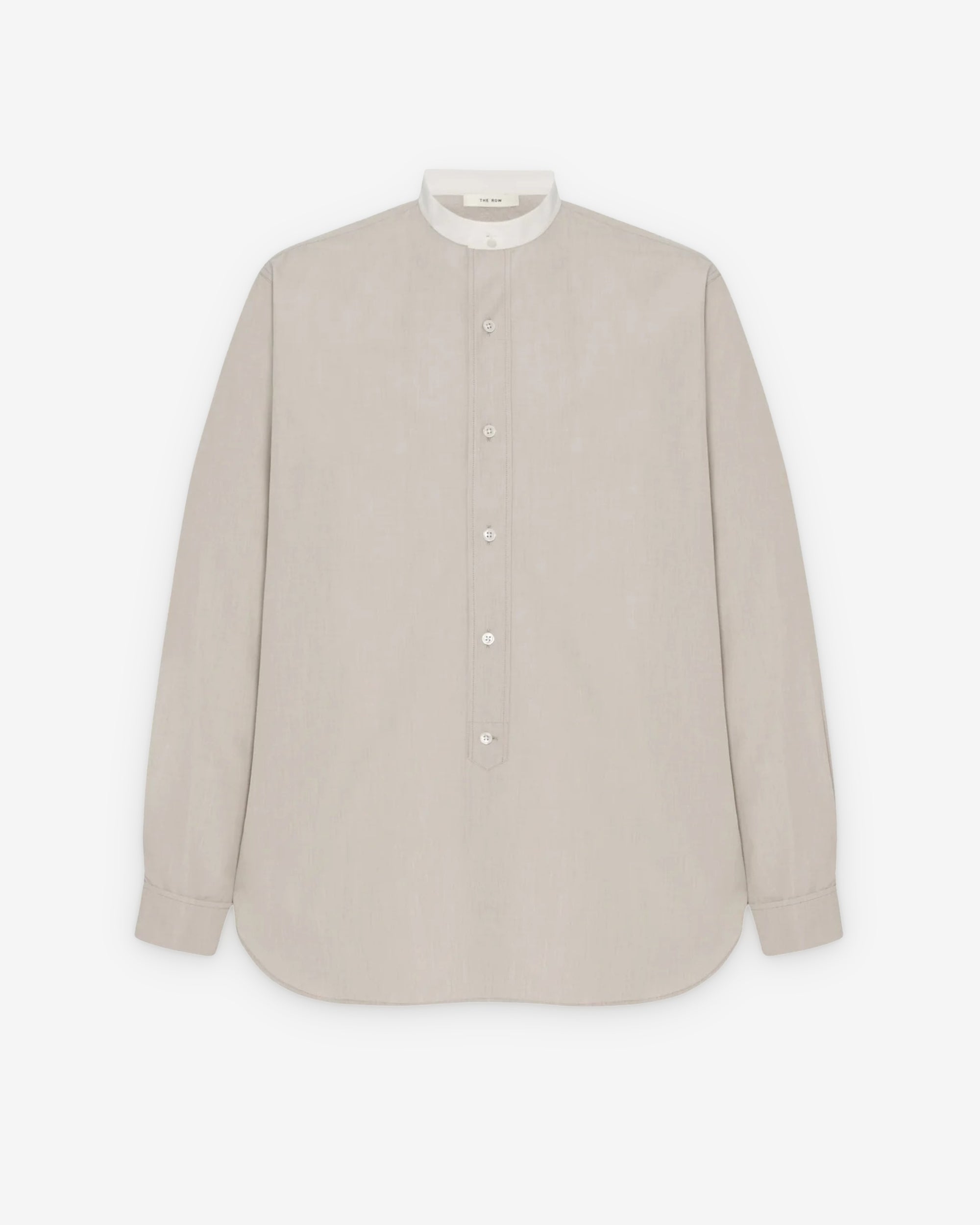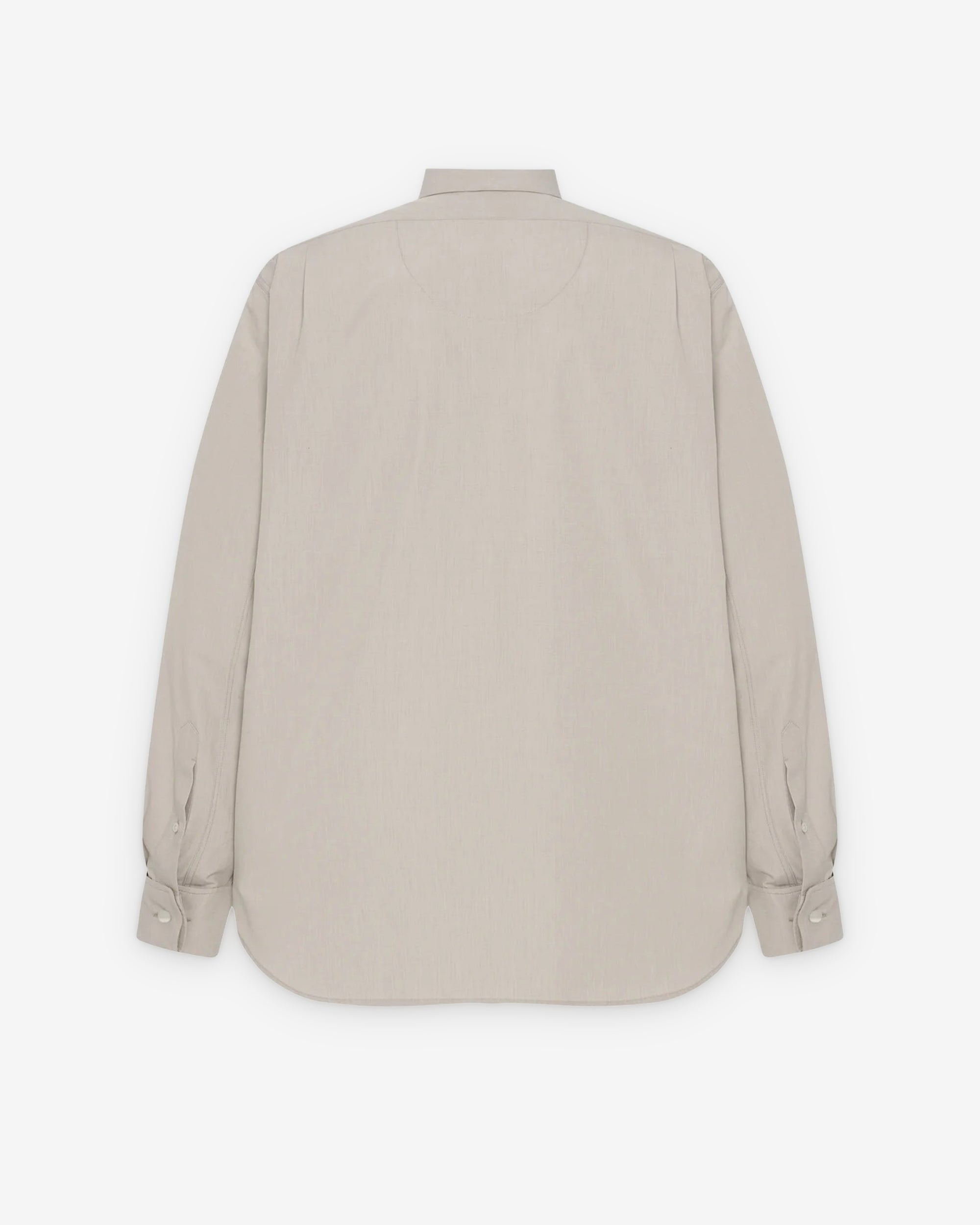 Boxy button-up shirt in crisp cotton poplin with curved hem, detachable collar with interior contrast collar stand, and exposed front placket with mother-of-pearl buttons.100% CottonMade in Italy